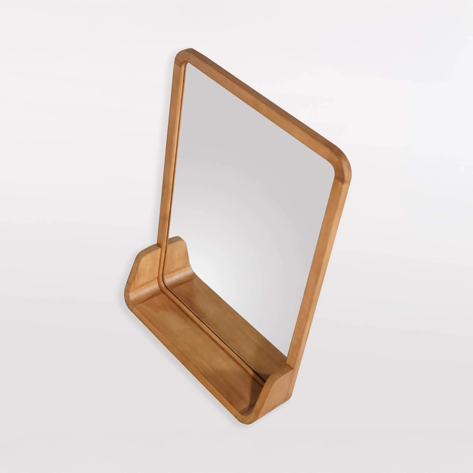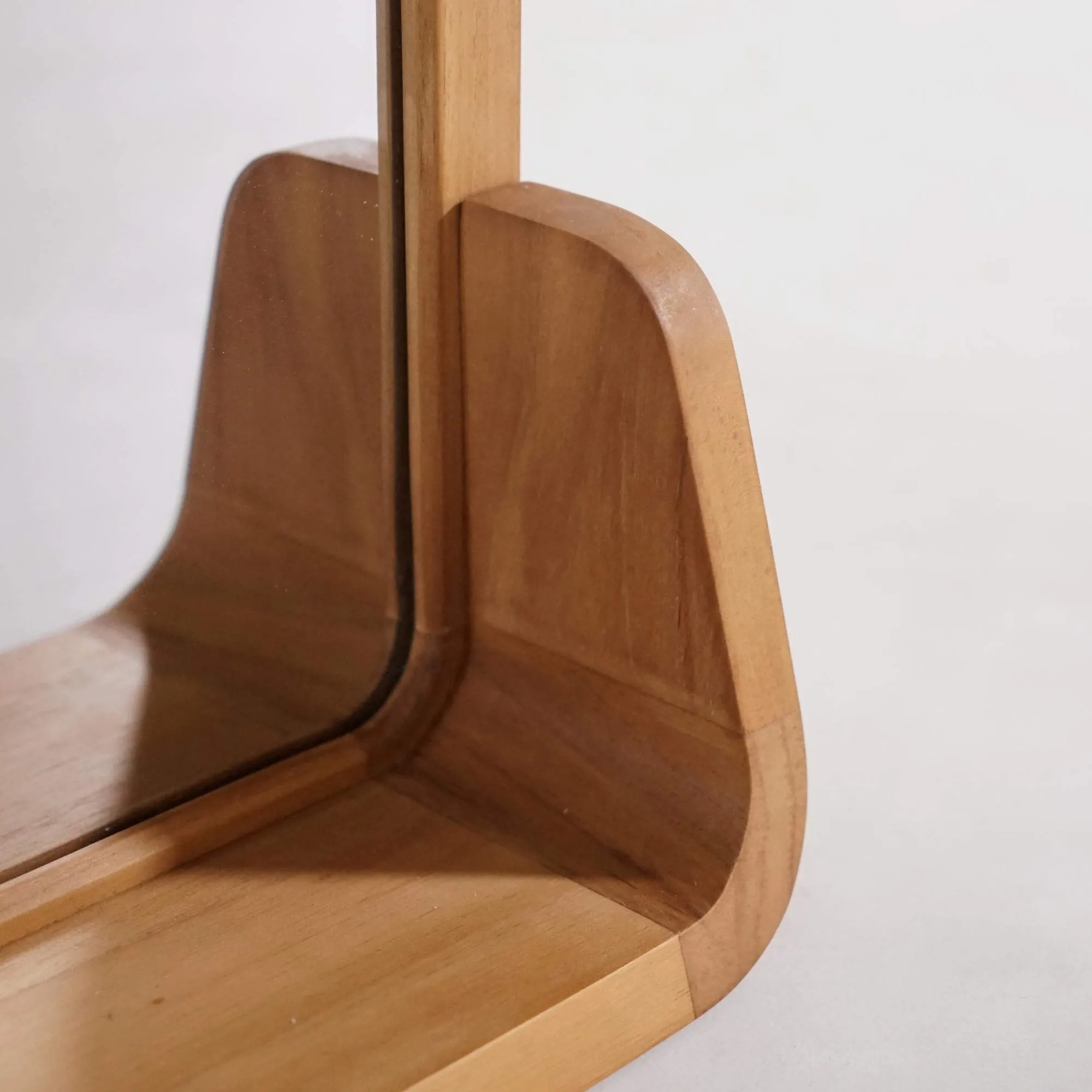 We ontwierpen deze rechthoekige spiegel in teakhout met legplank als een natuurlijke verlenging van onze badkamercollecties. Het sobere ontwerp is geïnspireerd op de Japandi-esthetiek, waar elke lijn eenvoud, zachtheid en evenwicht tussen functie en emotie uitdrukt.