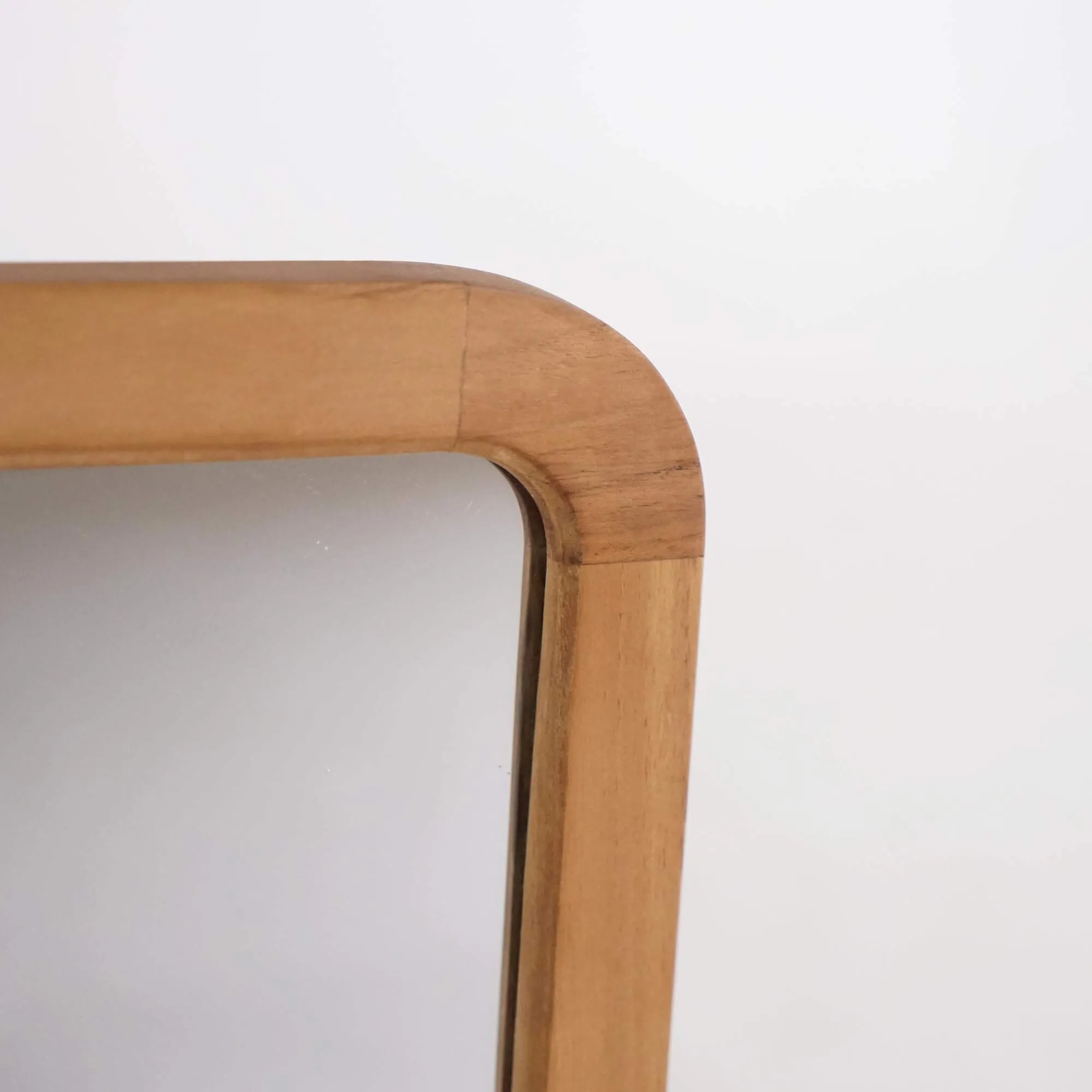 Elke rechthoekige spiegel in teakhout met legplank wordt ambachtelijk vervaardigd volgens een nauwkeurig vakmanschap dat de schoonheid van massief hout in de verf zet. Het teakhout, gekozen om zijn natuurlijke weerstand tegen vocht, toont hier een levendige en genuanceerde nerfstructuur. De zachte rondingen van het frame getuigen van een streven naar evenwicht tussen design en ergonomie, waarbij elk detail – van de zijdeachtige schuring tot de perfecte hoekverbinding – ontworpen is om lang mee te gaan.