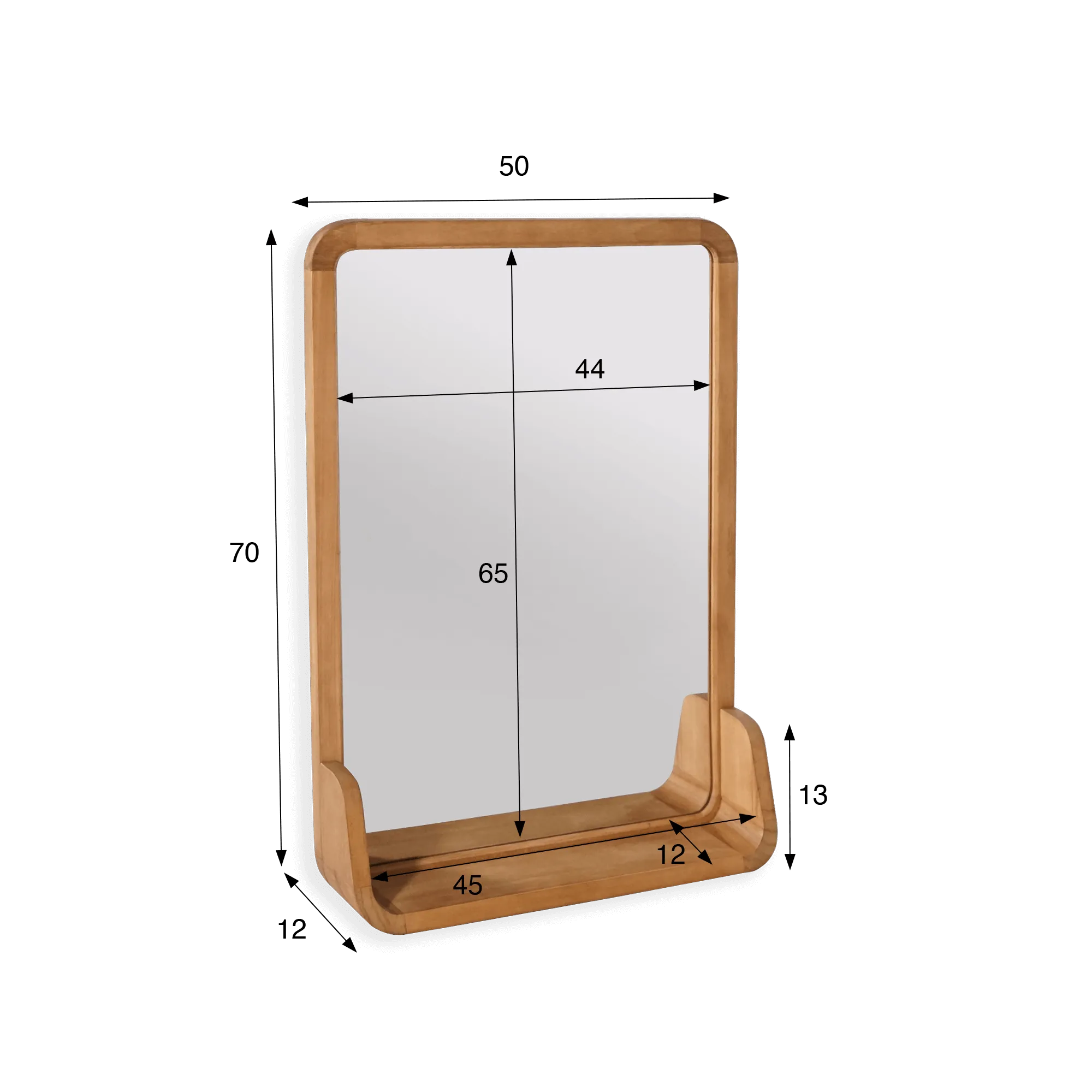 Met zijn 70 cm hoogte en 50 cm breedte past deze rechthoekige spiegel in teakhout met legplank perfect boven een enkel of dubbel badkamermeubel. Het teakhouten kader, in een warme honingkleur, omlijst de spiegel met een fijn afgerande rand, terwijl een klein geïntegreerd plankje van 12 cm diep plaats biedt aan dagelijkse voorwerpen zoals parfum, borstel of decoratief kaarsje.