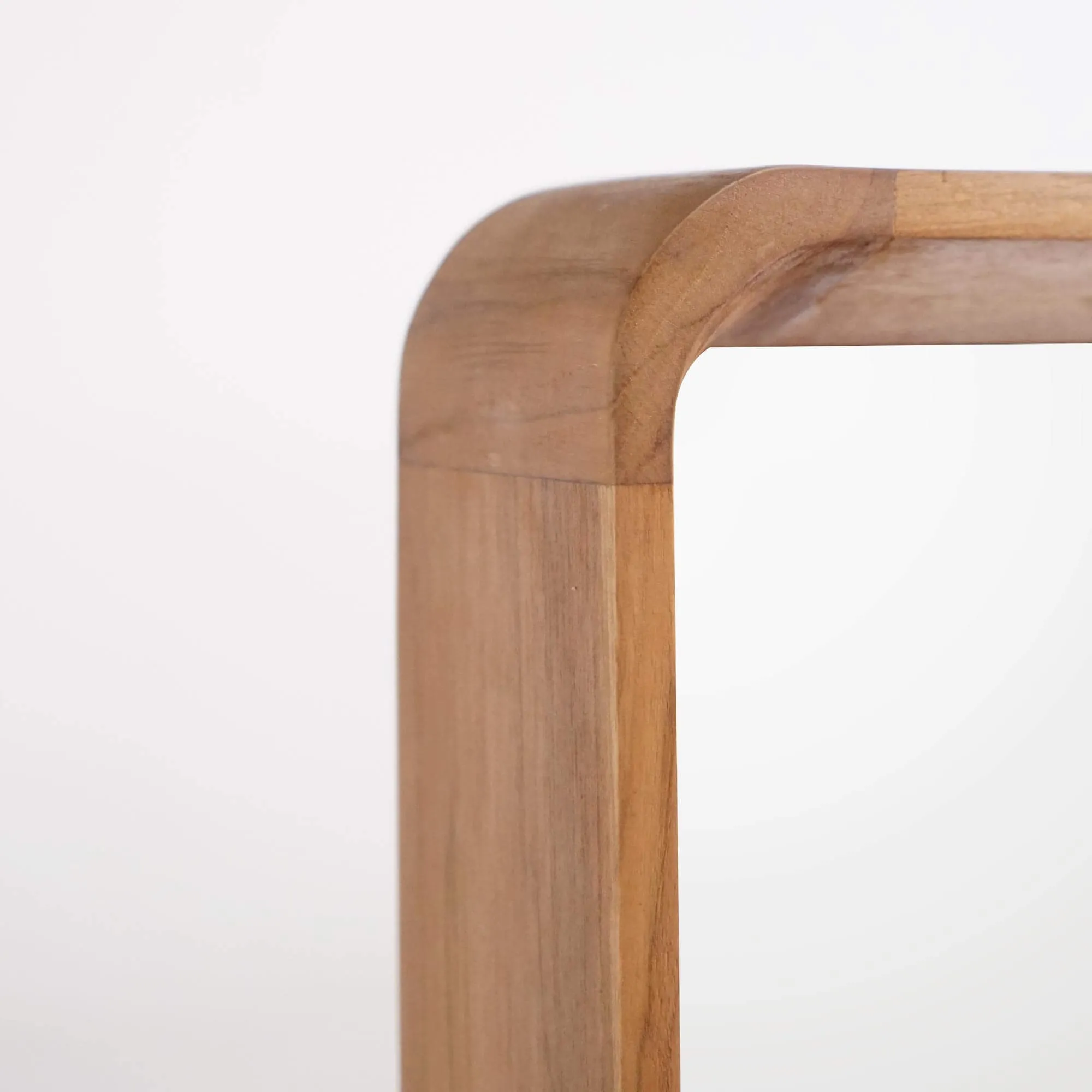 We hebben deze rechthoekige spiegel in teakhout en rotan ontworpen als een stuk dat zowel functioneel als decoratief is, bedoeld om onze badkamermeubels in massief teakhout te vergezellen en tegelijk een echte esthetische autonomie te behouden. De zachte, afgeronde lijnen weerspiegelen onze wens om functionaliteit te combineren met natuurlijke elegantie: een kader van massief teakhout, een geïntegreerde legplank en een onderste nis afgewerkt met rotanvlechtwerk voor een resultaat dat zowel sober als warm en verfijnd is.