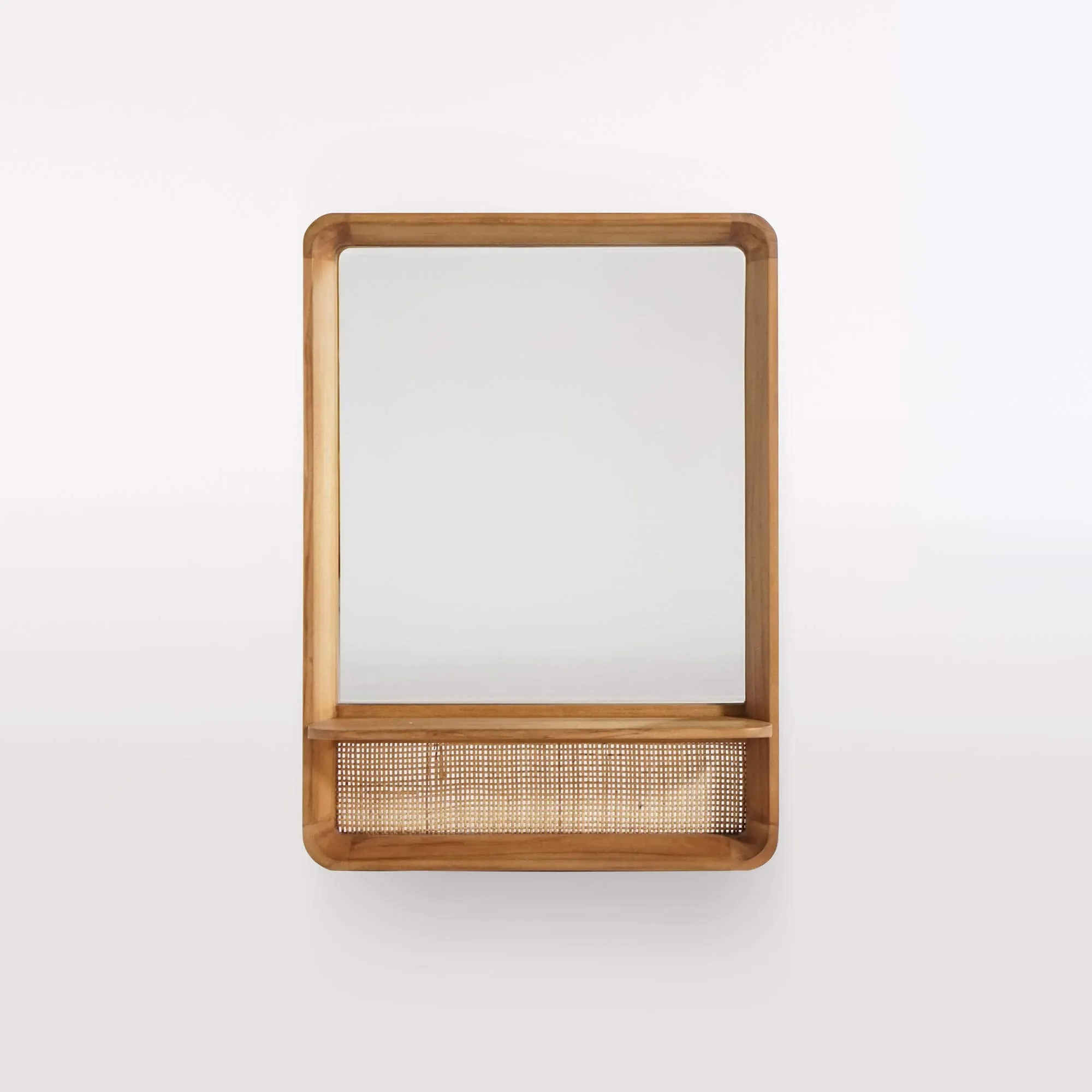 Met een hoogte van 70 cm en een breedte van 50 cm biedt deze rechthoekige spiegel in teakhout en rotan een mooie reflecterende oppervlakte (44 × 52 cm), gecombineerd met een praktisch opbergvak. De plank, 10 cm diep, is ideaal om dagelijkse benodigdheden op te plaatsen: flessen, parfums of verzorgingsaccessoires. Onder deze plank zorgt het natuurlijke rotanvlechtwerk voor een subtiel spel van texturen en licht, een knipoog naar het ambachtelijke vakmanschap van onze ateliers.