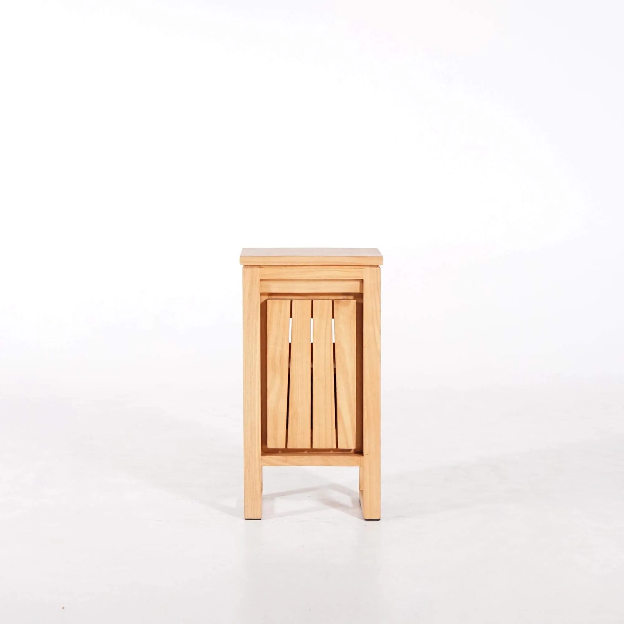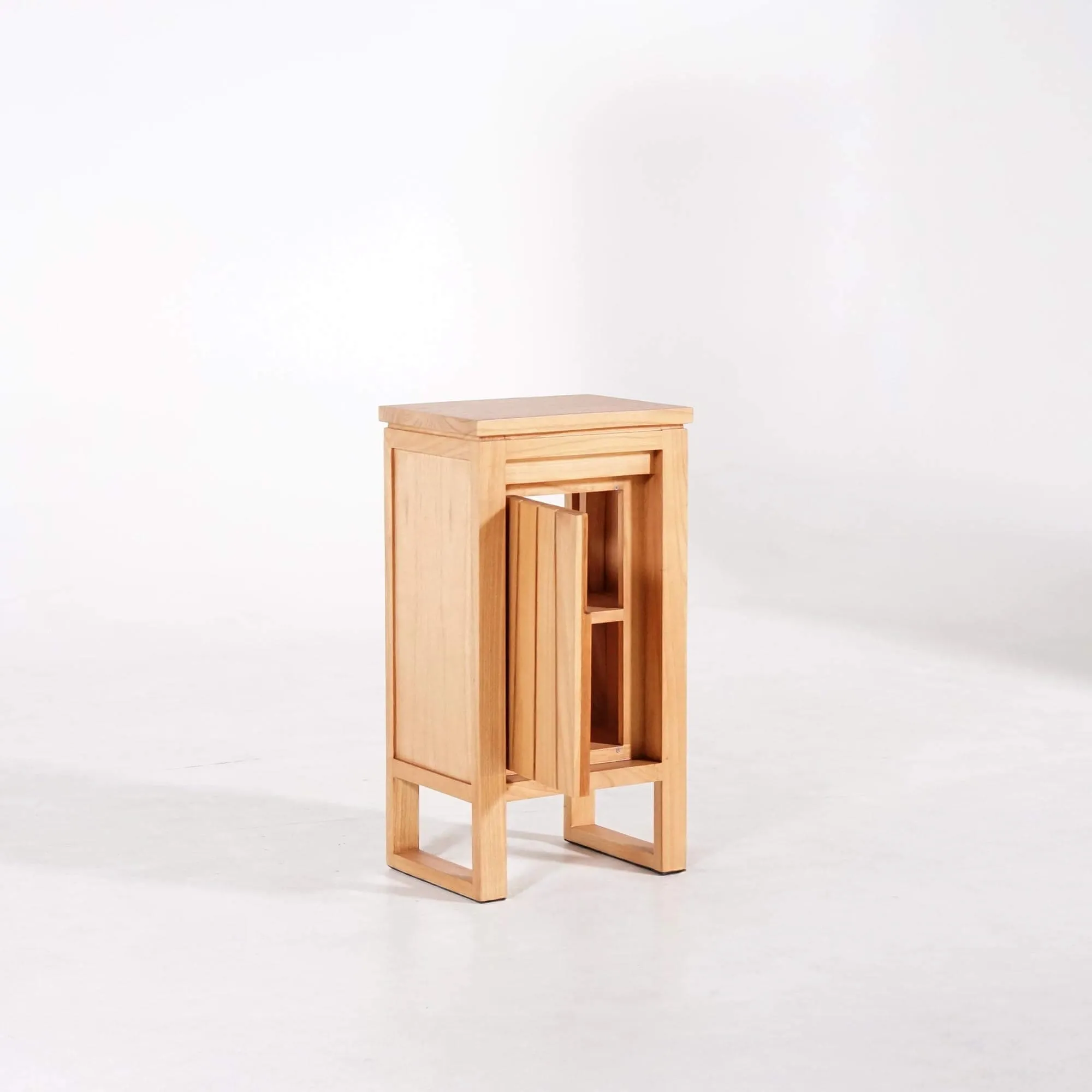 Volledig vervaardigd uit massief mindihout toont dit wasmeubel de natuurlijke schoonheid van het hout: een fijne nerf, een zachte en lichte tint en een satijngladde afwerking die elk ambachtelijk detail benadrukt. We besteedden bijzondere aandacht aan de draaideur, waarvan de verticale latten ritme brengen zonder de strakke stijl te doorbreken. Achter de deur bevinden zich twee praktische opbergvakken van telkens ongeveer 23 cm breed, met een bruikbare hoogte van 19 cm voor de bovenste niche en 20 cm voor de onderste. Deze afmetingen zijn ideaal voor dagelijkse essentials zoals flesjes, verzorgingsproducten of handdoeken.