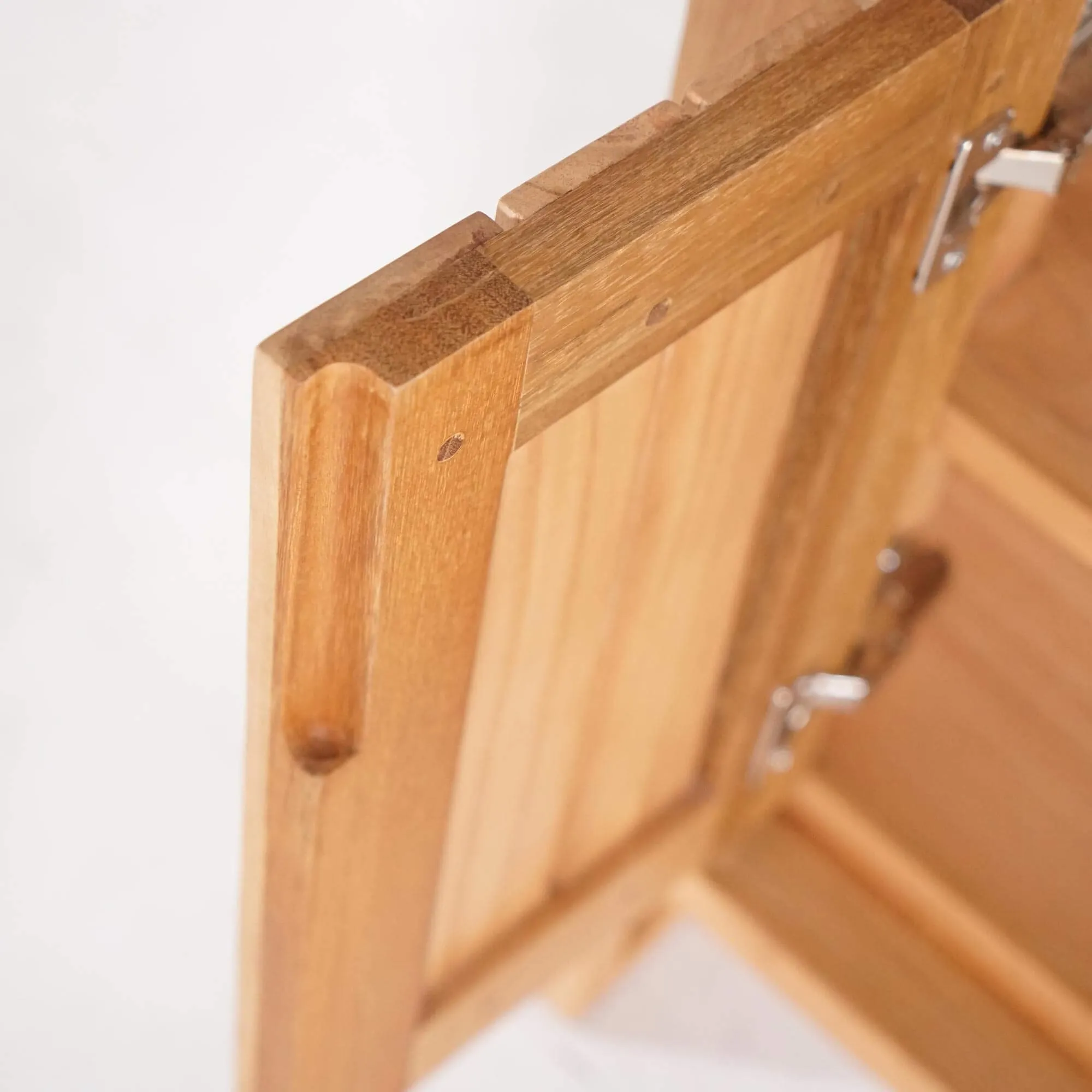 Naast het design zijn we bijzonder trots op de nauwkeurige afwerking en de stevige assemblage van dit massief houten wasmeubel, dat met de hand wordt vervaardigd met respect voor het natuurlijke materiaal.