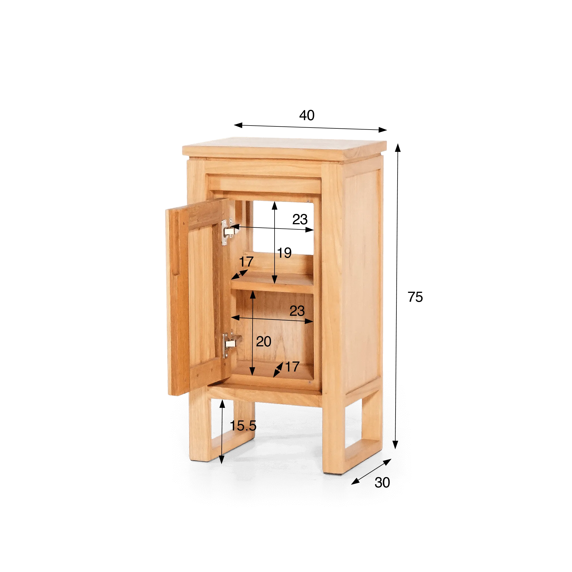 Met zijn breedte van 40 cm, diepte van 30 cm en hoogte van 75 cm past dit compacte wasmeubel in massief hout moeiteloos in kleine badkamers, toiletruimtes of functionele hoekjes. Het wordt volledig gemonteerd geleverd, zodat je het in een mum van tijd kunt installeren. Zo ontstaat meteen een harmonieuze sfeer waarin Japandi-esthetiek en hedendaagse functionaliteit perfect samenkomen. Het bovenblad biedt comfortabel plaats aan een opzetwaskom en blijft volledig stabiel.