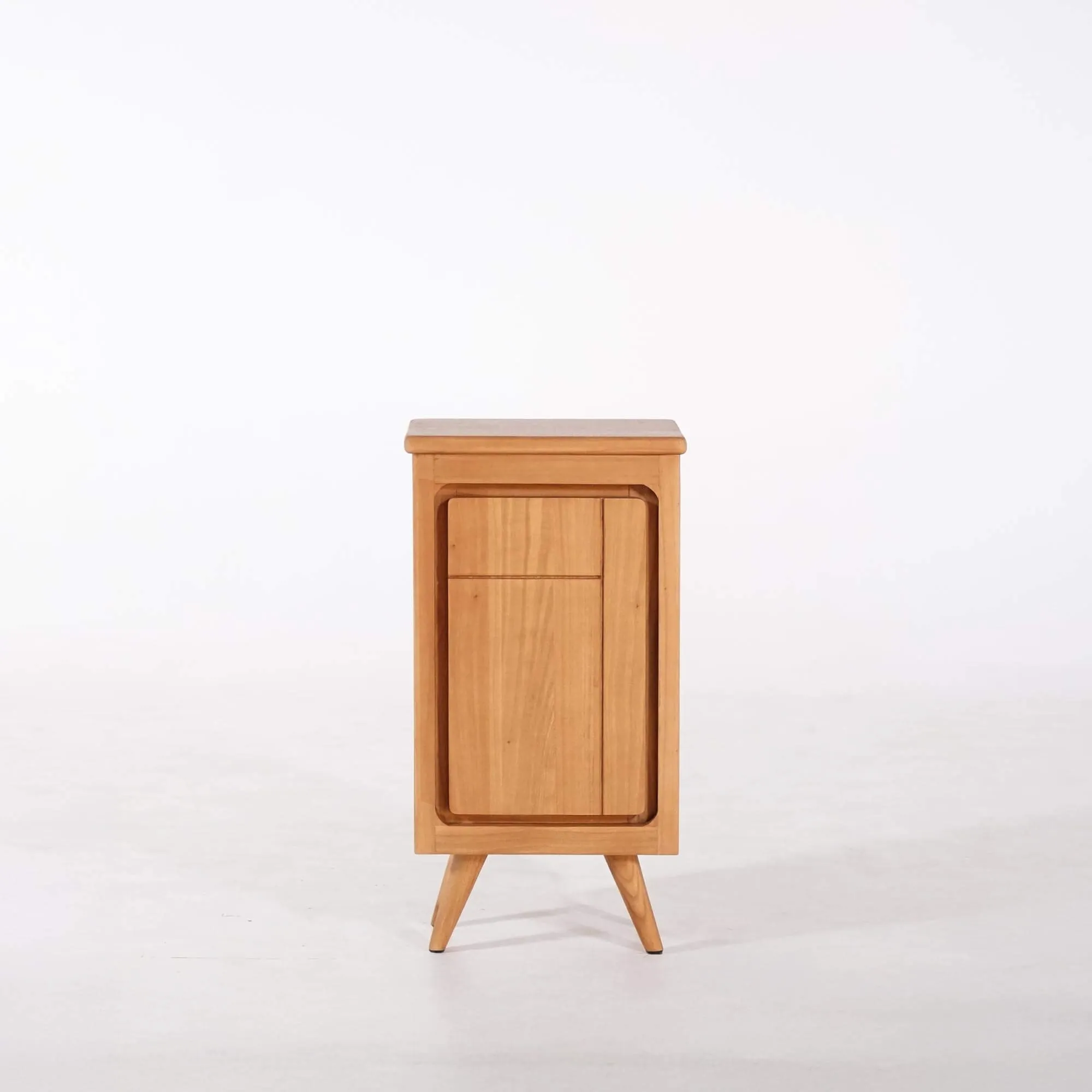 Voor dit massief houten fonteinkastje ontwierpen onze designers een conische poot van 16 cm die het geheel visueel lichter maakt en het onderhoud van de vloer vergemakkelijkt. Deze verhoging geeft de indruk dat het kastje lichtjes zweeft, wat het luchtige karakter en de japandi-invloeden versterkt. Het meubel wordt volledig gemonteerd geleverd en vindt moeiteloos zijn plaats in een hedendaagse, zen of natuurlijk geïnspireerde badkamer.