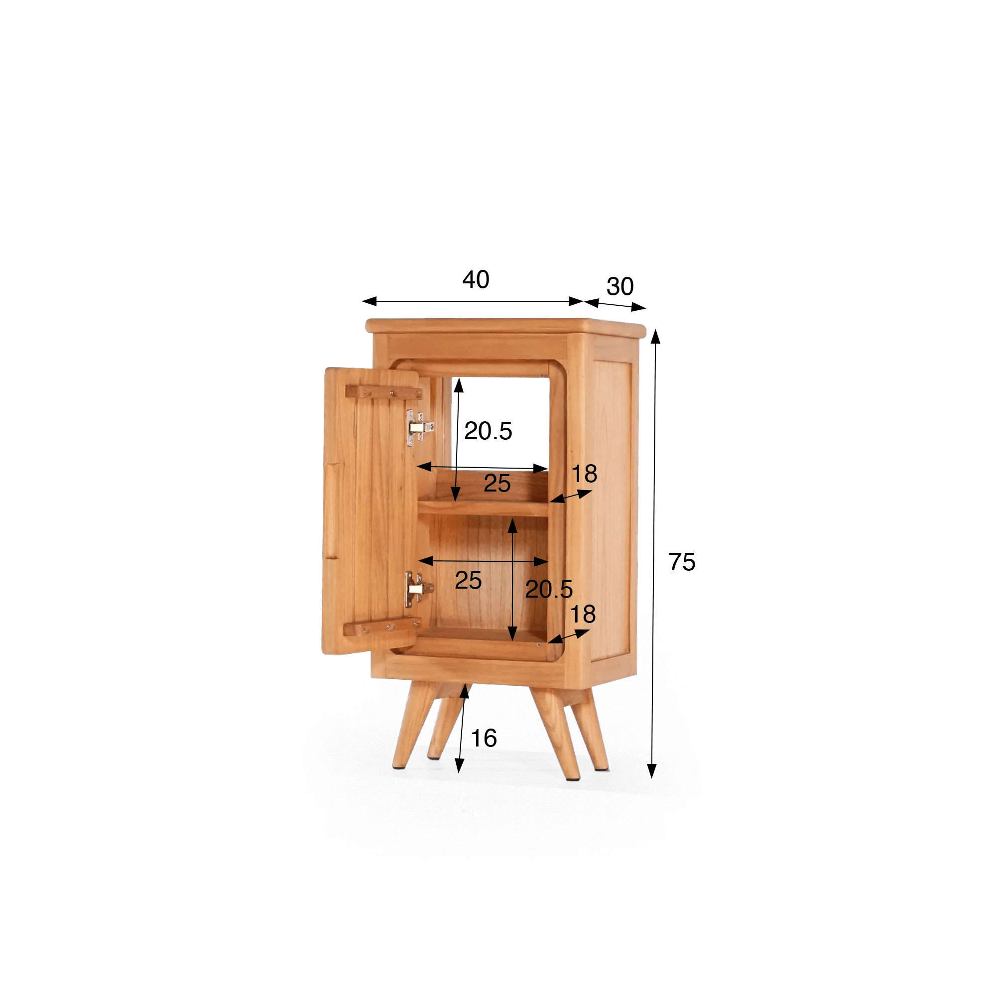 Compact en geschikt voor zowel kleine ruimtes als ruimere badkamers, biedt dit massief houten fonteinkastje van 75 cm hoog een praktisch binnenvak. Achter de draaideur bevinden zich twee compartimenten van telkens 25 cm breed en 20,5 cm hoog, ideaal voor dagelijkse verzorgingsproducten. De nuttige diepte van 18 cm zorgt voor een optimale opbergruimte zonder de omgeving van het meubel te belasten. Het bovenblad van 40 × 30 cm vormt een natuurlijke basis voor een opzetwaskom en creëert zo een zuivere en harmonieuze uitstraling.