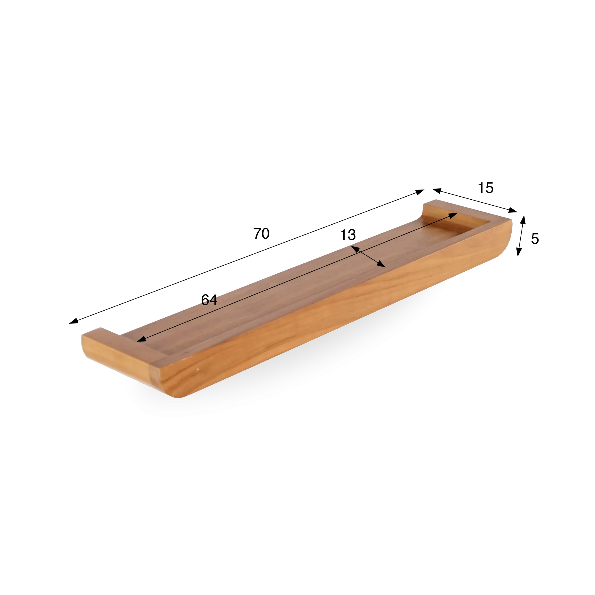 Met een lengte van 70 cm, een diepte van 15 cm en een hoogte van 5 cm biedt deze wandplank in massief teakhout een ideaal oppervlak voor je parfumflesjes, kaarsen of dagelijkse accessoires. De subtiel uitgefreesde groef aan de binnenrand houdt elk object perfect op zijn plaats, terwijl het geheel visueel licht blijft ogen.
