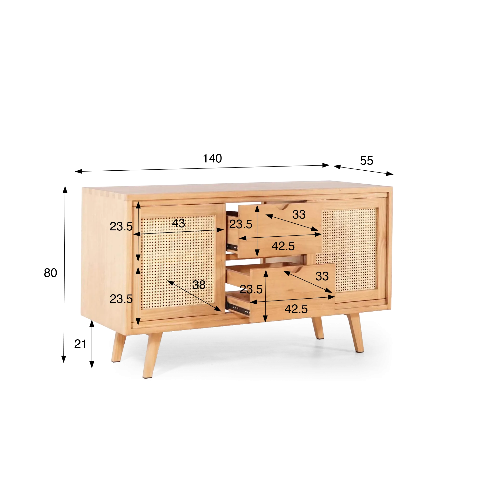 Gemaakt van massief mindihout, een houtsoort die bekendstaat om zijn natuurlijke weerstand tegen vocht en zijn stabiliteit in de tijd, verenigt het badkamermeubel Anaya stevigheid en elegantie. De zichtbare houtnerf, afgewerkt met een satijnen vernis, geeft elke kast een warme en levendige uitstraling, uniek voor elk stuk. De schuifdeuren aan de voorkant zijn voorzien van een fijn handgevlochten rotan dat de structuur verlicht en de inhoud laat ademen.