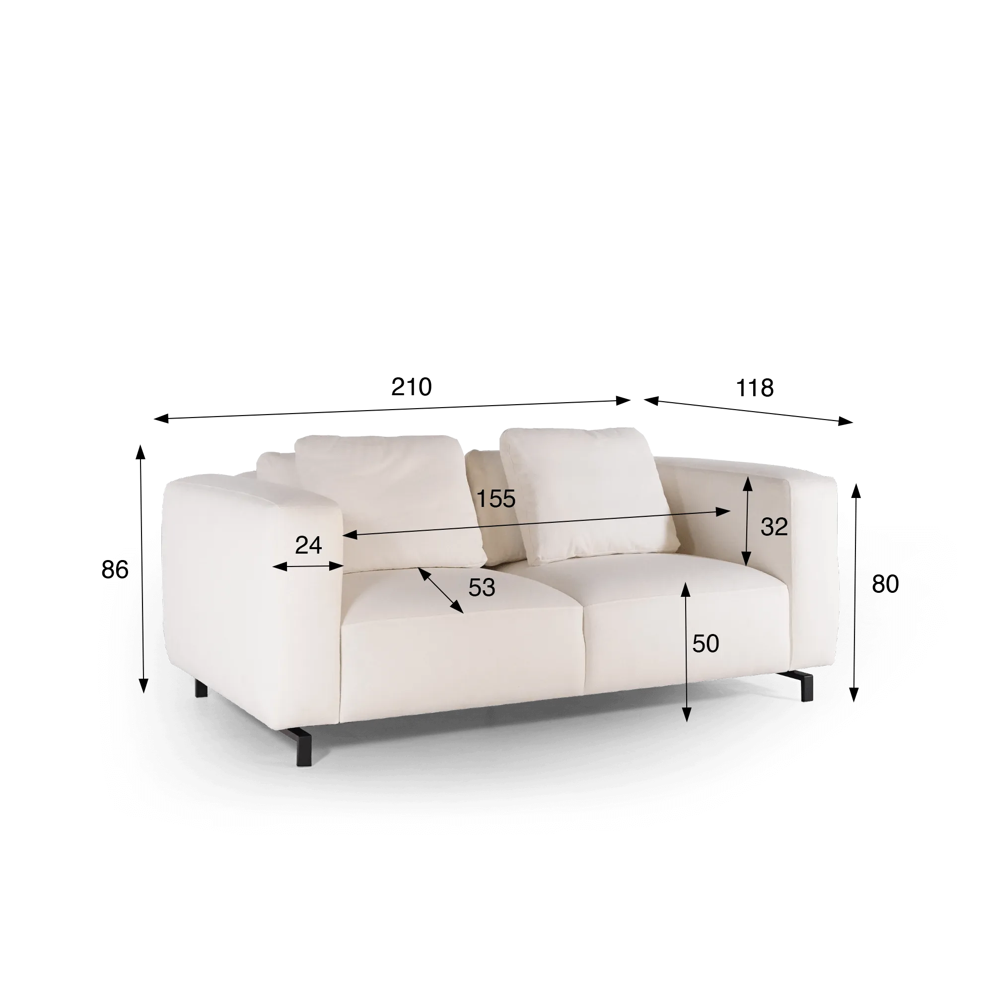 De moderne 3-zitssofa Miro is opgebouwd uit een stevige structuur van grenenhout, beukenhout en multiplex, wat zorgt voor een solide en duurzame basis. De ambachtelijke bekleding combineert een schuim met hoge veerkracht en gekruiste elastische riemen voor een optimaal zitcomfort. De losse, zachte rugkussens versterken het gevoel van zachtheid en geborgenheid. Met zijn lengte van 210 cm, diepte van 118 cm en hoogte van 86 cm biedt hij een royale ruimte, perfect in verhouding voor drie personen.