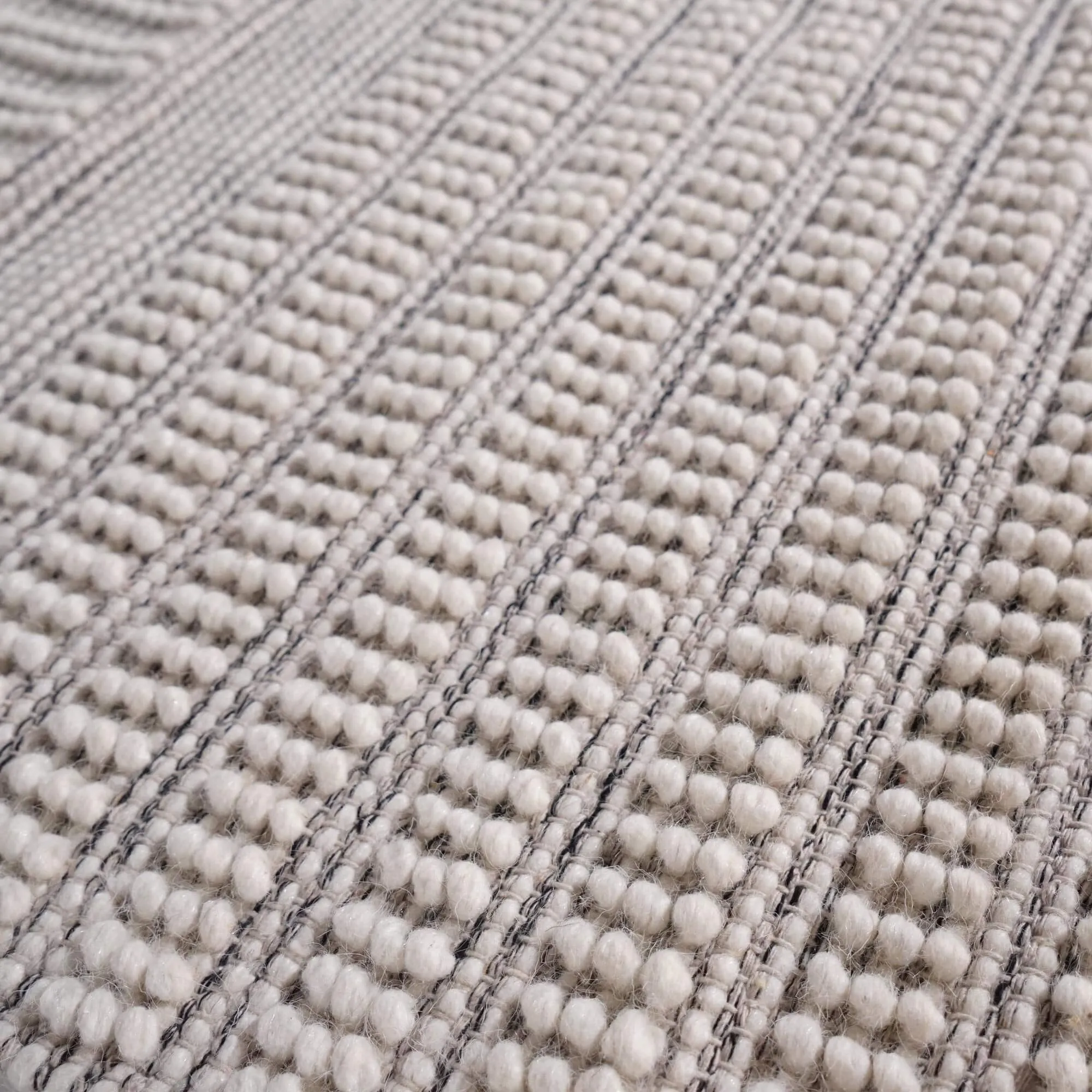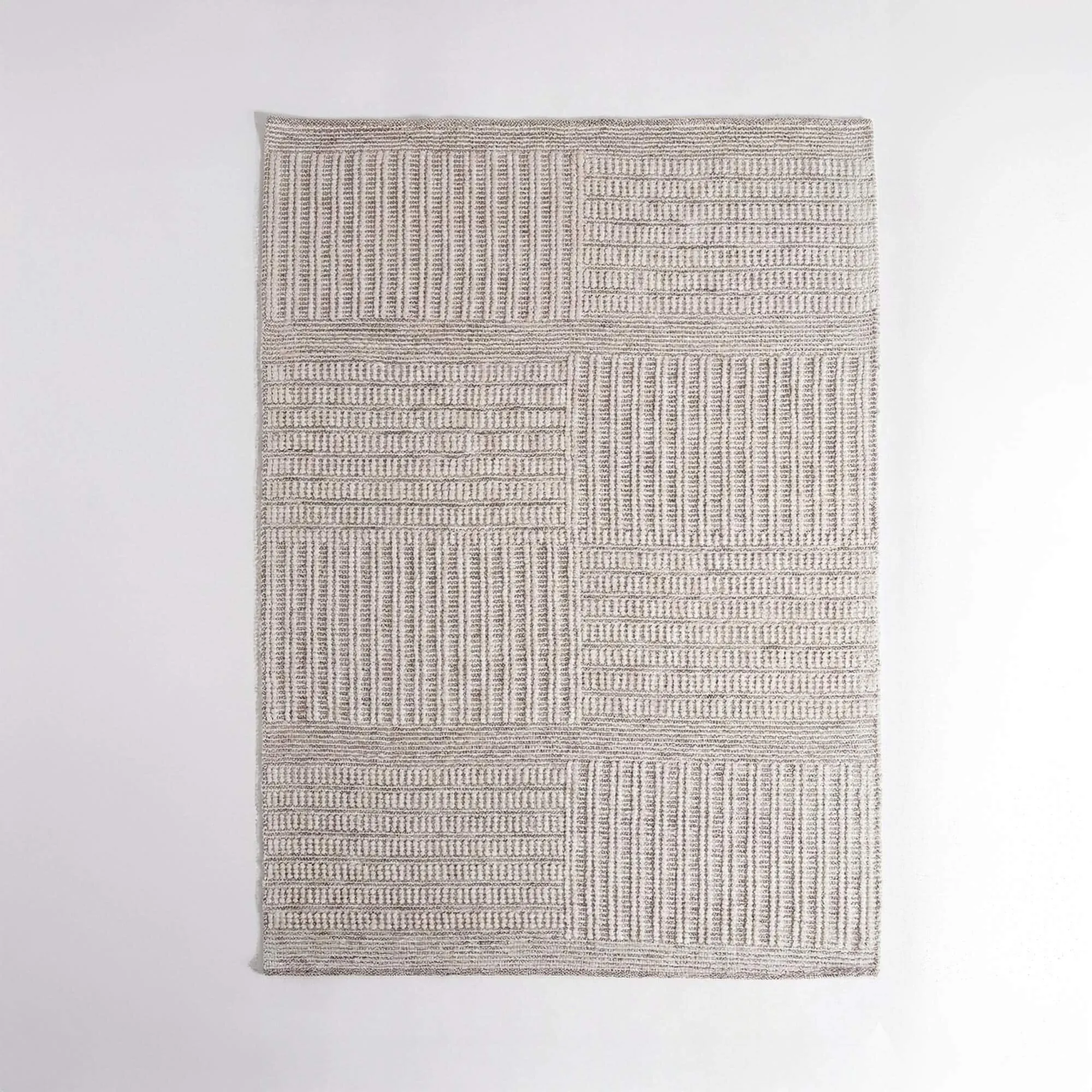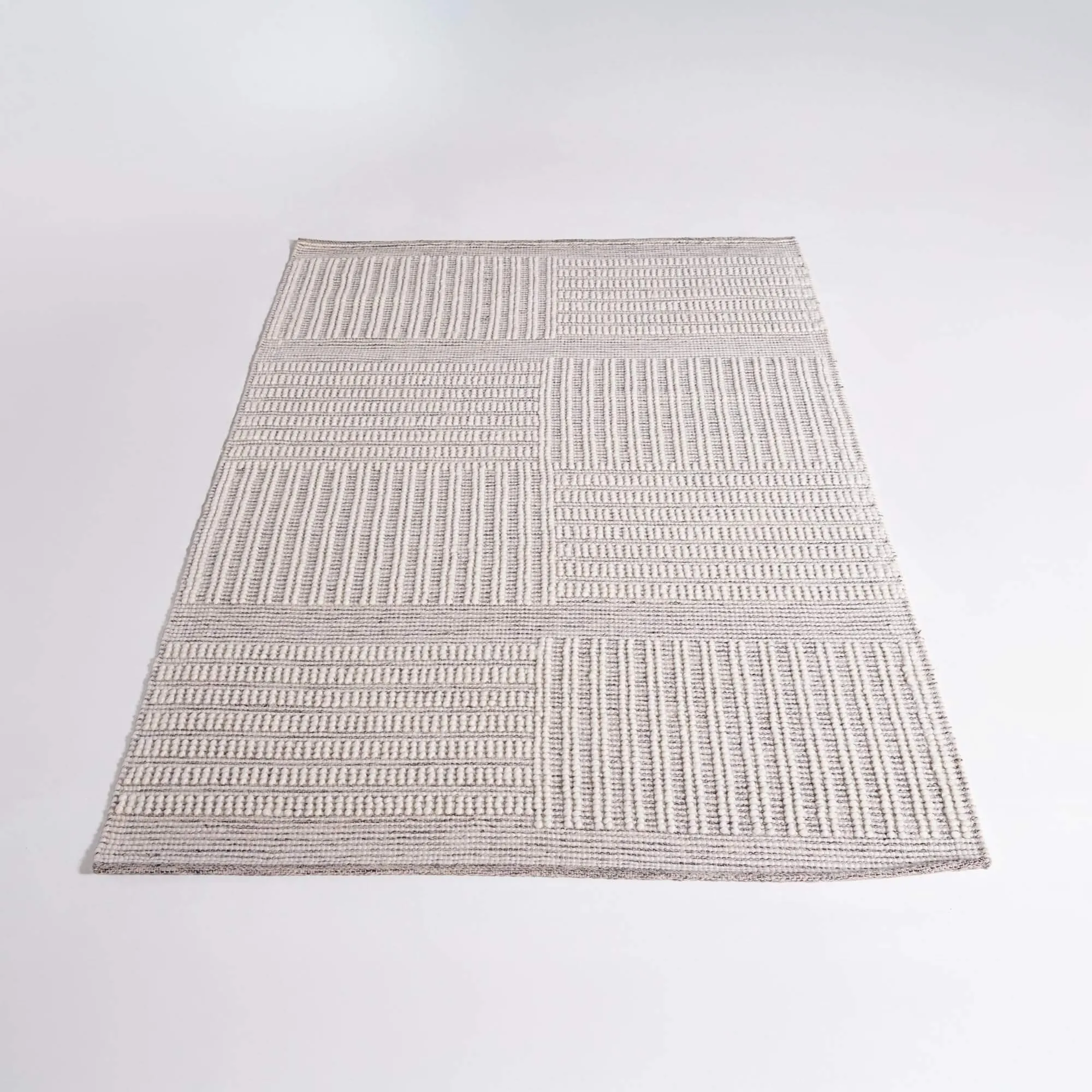 Volledig met de hand vervaardigd, toont het wollen tapijt Wola een minutieus werk rond materiaal en reliëf. De 100% wol zorgt voor een omhullend gevoel onder de voeten. Met een dikte van ongeveer 4 mm biedt het een subtiel evenwicht tussen comfort en discretie, waardoor het moeiteloos onder een salontafel of voor een bank past zonder extra volume te creëren.