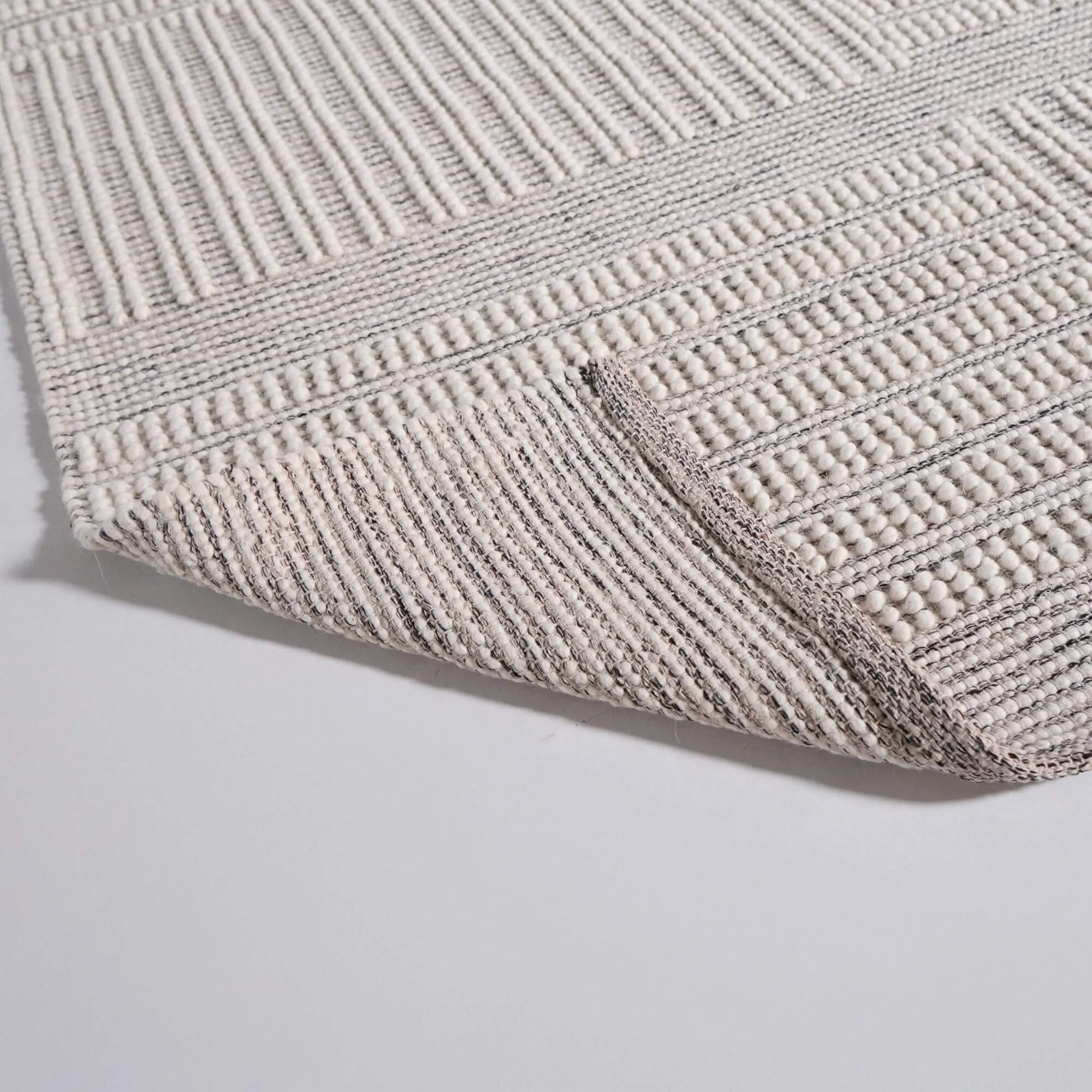 Het grafische spel van wit en zwart in dit wollen tapijt komt tot uiting in een afwisseling van banen en getextureerde zones, wat zorgt voor een zachte en genuanceerde visuele leesbaarheid. De motiefen, bewust onregelmatig, verwijzen naar de authenticiteit van het ambachtelijke gebaar en geven het tapijt een warme, nooit statische uitstraling. Afhankelijk van het licht vangt het oppervlak lichte contrasten die de vloer tot leven brengen en de algemene sfeer verwarmen.