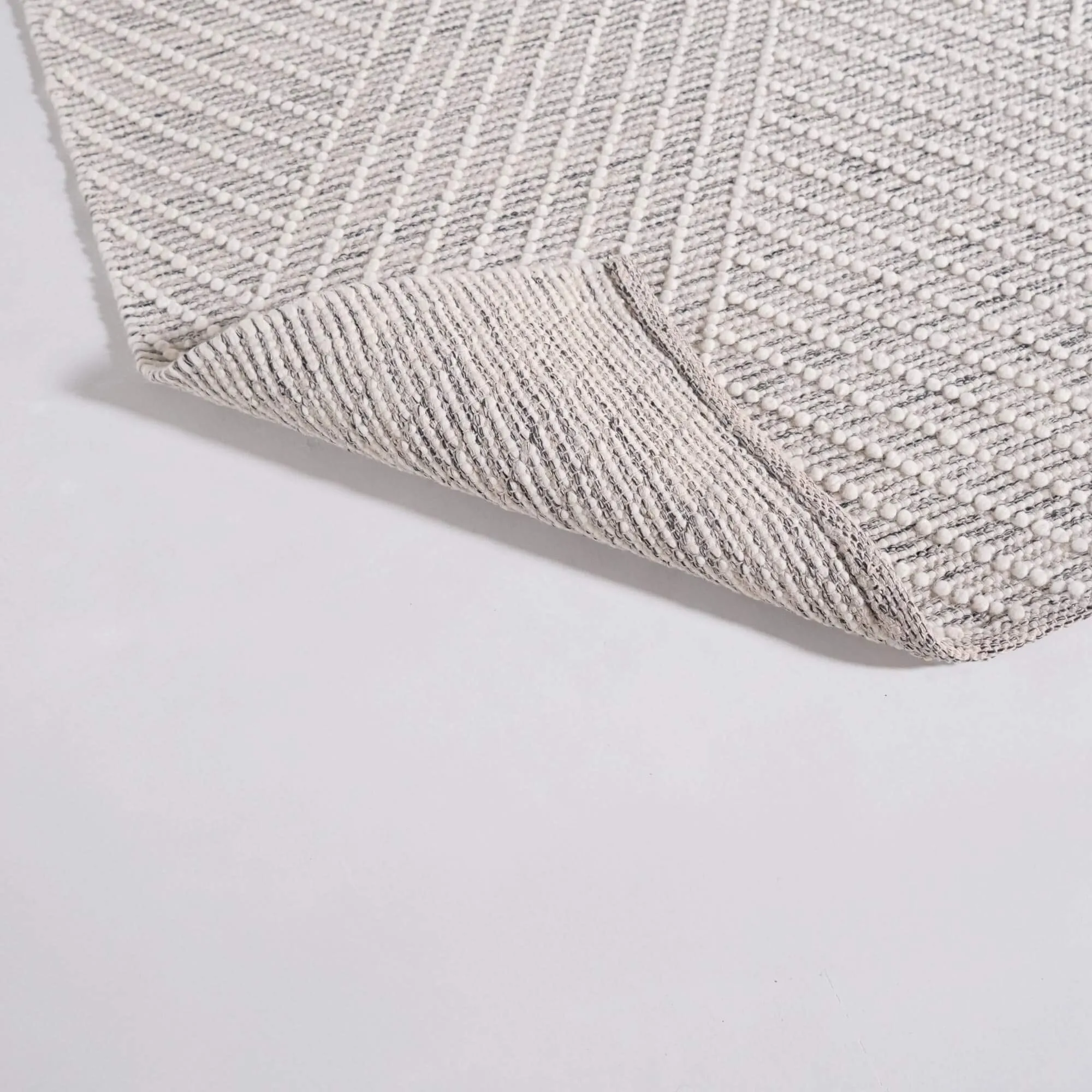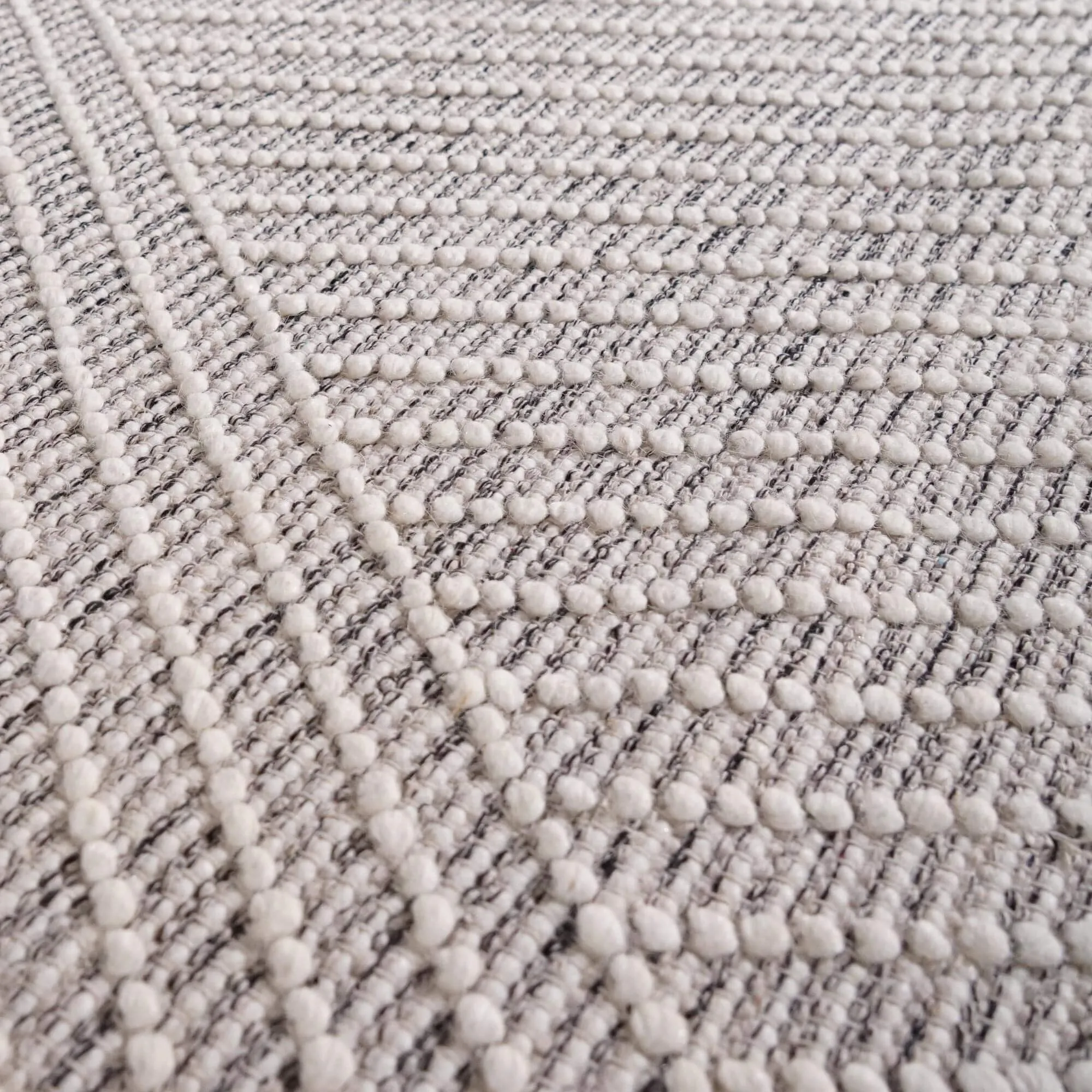 Het Arvo wollen tapijt is volledig met de hand vervaardigd en gemaakt van 100% natuurlijke wol. Deze keuze werd gemaakt omwille van de onmiddellijke zachtheid, maar ook vanwege de duurzaamheid doorheen de tijd. Onder de voeten voelt het tapijt soepel en licht getextureerd aan, met een subtiel reliëf dat het licht vangt en de nuances van wit en zwart laat leven. De dikte van ongeveer 4 mm is bewust gekozen om een aangenaam comfort te bieden zonder extra hoogte, zodat het tapijt gemakkelijk onder een salontafel of aan de voet van een fauteuil kan worden geplaatst.