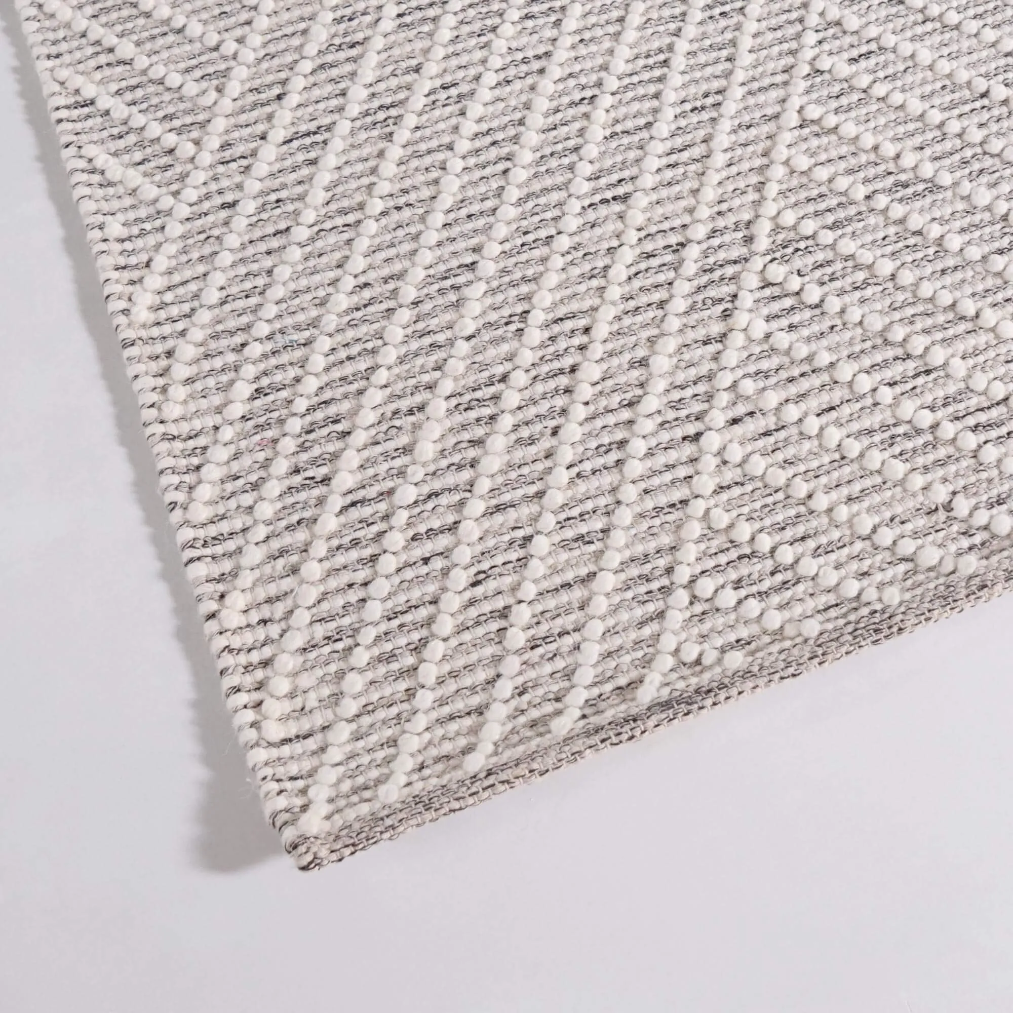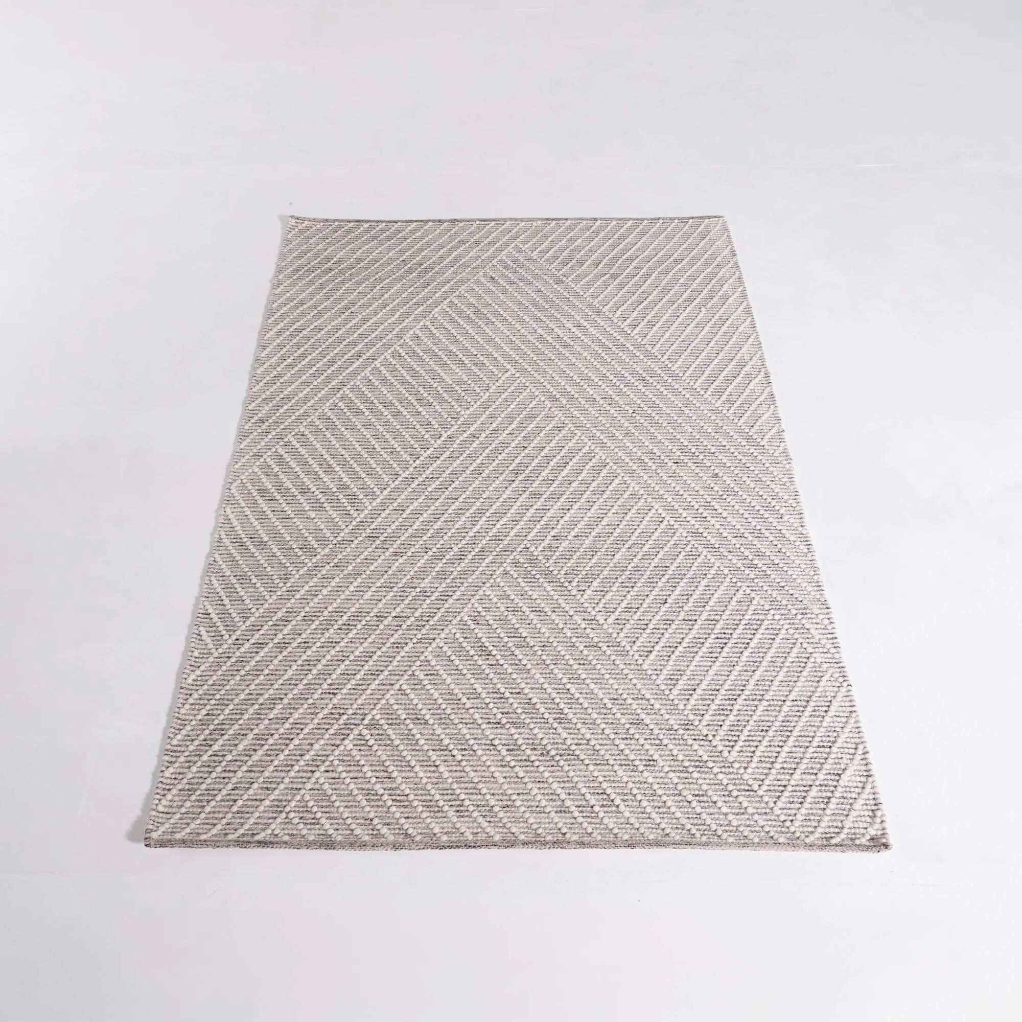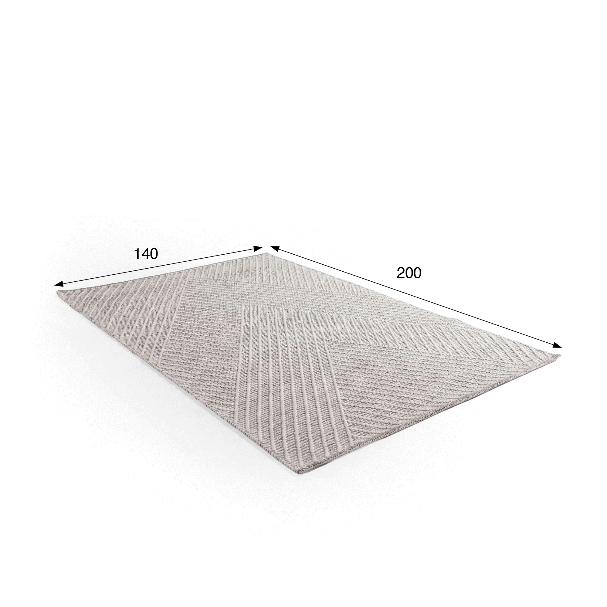 Het geometrische dessin van dit wollen tapijt, opgebouwd uit schuine lijnen en spel van weefstructuren, roept een etnische sfeer op die met soberheid werd herinterpreteerd. Het brengt ritme in de vloer, terwijl het voldoende zacht blijft om zowel in een strak interieur als in een warmere leefruimte tot zijn recht te komen. Met zijn formaat van 140 x 200 cm vindt het Arvo wollen tapijt vanzelf zijn plaats voor een sofa, in een leeshoek of om een ontspanningsruimte subtiel af te bakenen.