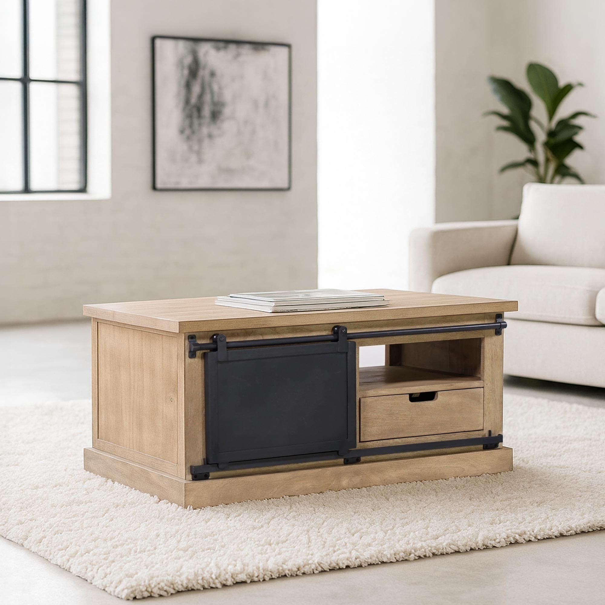Deze salontafel biedt een slimme opbergoplossing zonder esthetiek op te offeren. Ze beschikt over een houten lade (B35 x D44,5 x H11,5 cm) die perfect in de structuur is geïntegreerd, een open vak erboven (H11 x B55 x D39 cm) voor boeken of alledaagse accessoires, en een opbergvak achter de schuifdeur (B39 x H24,5 x D49 cm) om je woonkamer netjes te houden. Het bovenblad meet 100 x 55 cm en bevindt zich op 45 cm hoogte – ideaal bij een sofa.