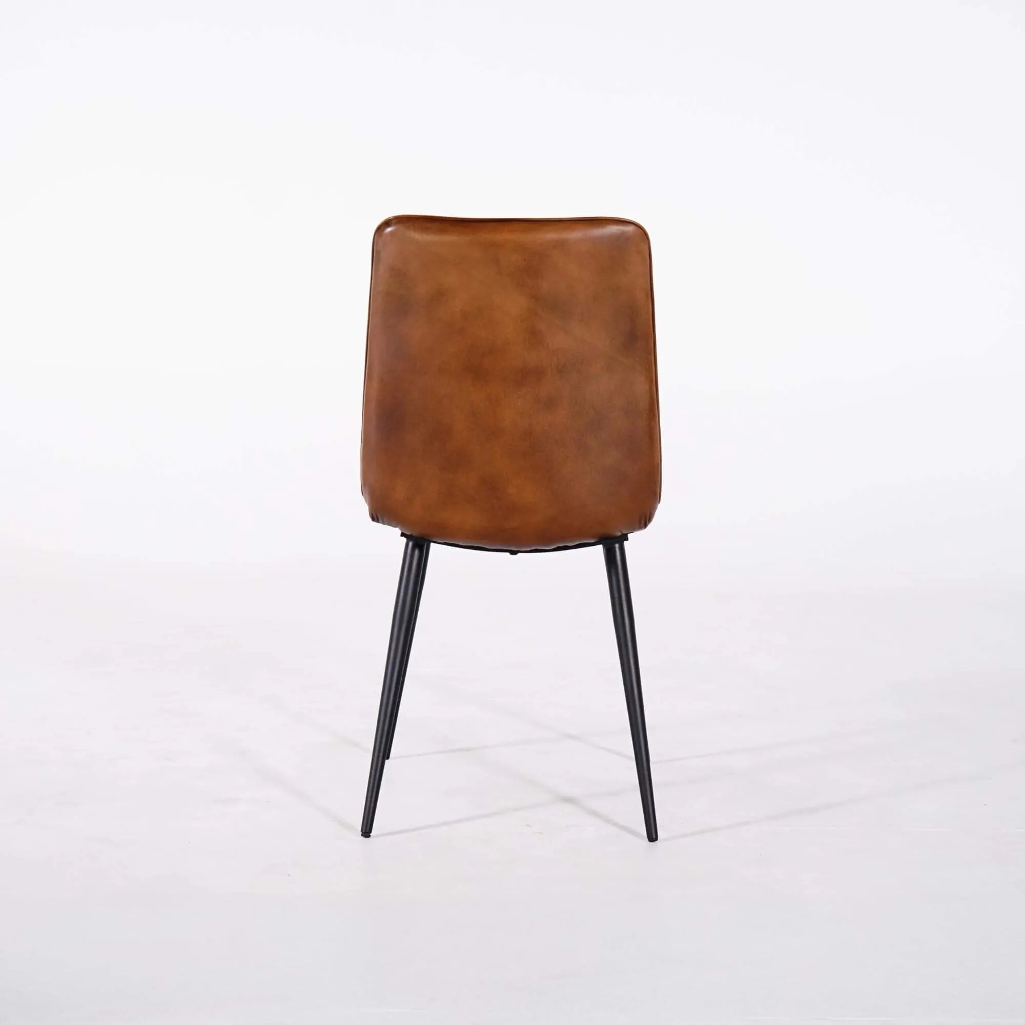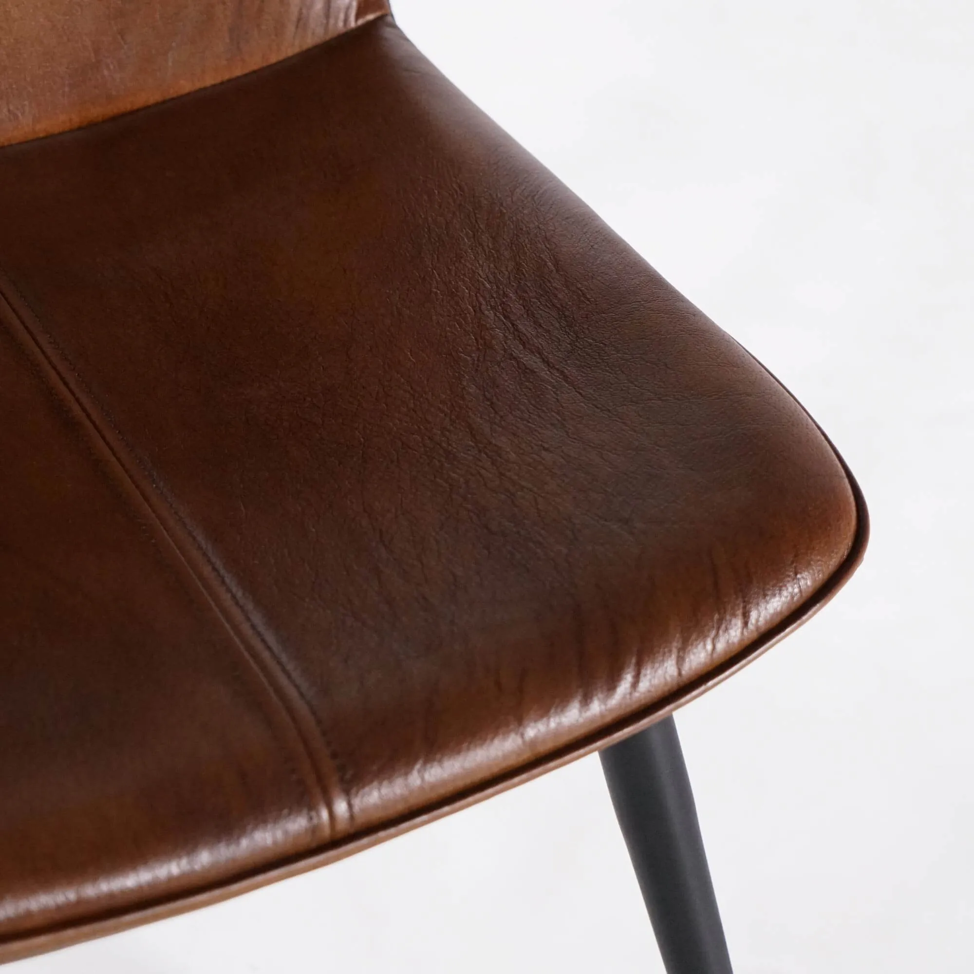 De zitting en rugleuning van deze bruine vintage leren stoel zijn bekleed met volnerf buffelleer in bruin, geselecteerd om zijn stevigheid en de rijke, natuurlijke patina. Bij aanraking voelt het materiaal soepel aan en toont het een levendige nerf die het licht subtiel opvangt. De vulling in hoogresilient polyurethaanschuim zorgt voor comfortabel steun, ideaal voor lange diners én voor dagelijks gebruik. De zitting van ongeveer 44 cm breed en 46 cm diep, gecombineerd met een zithoogte van rond de 52 cm, biedt een natuurlijke en ergonomische houding, terwijl de rugleuning van ongeveer 47 cm de rug comfortabel ondersteunt.