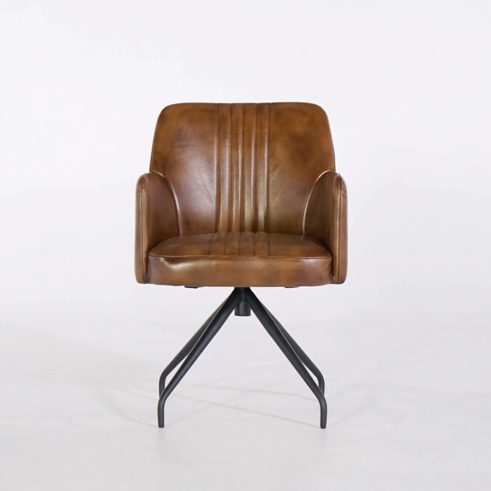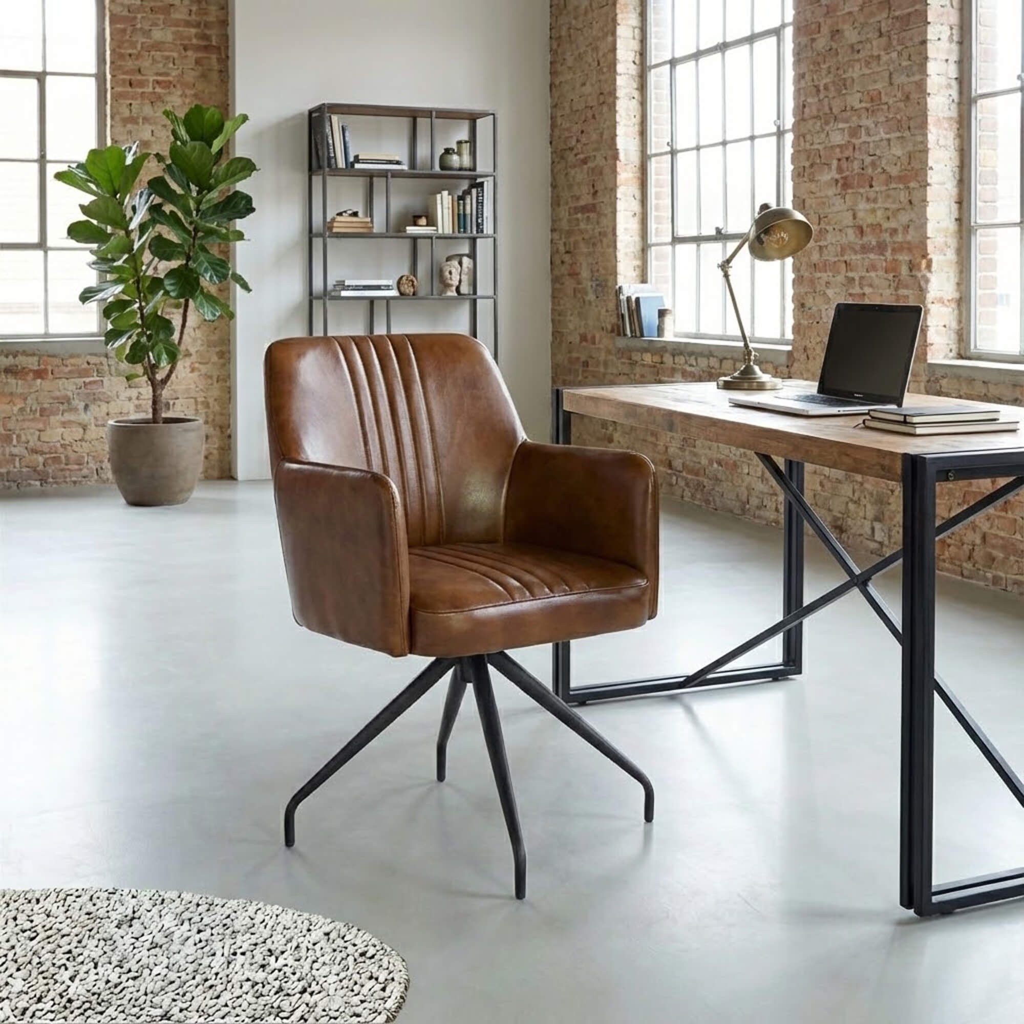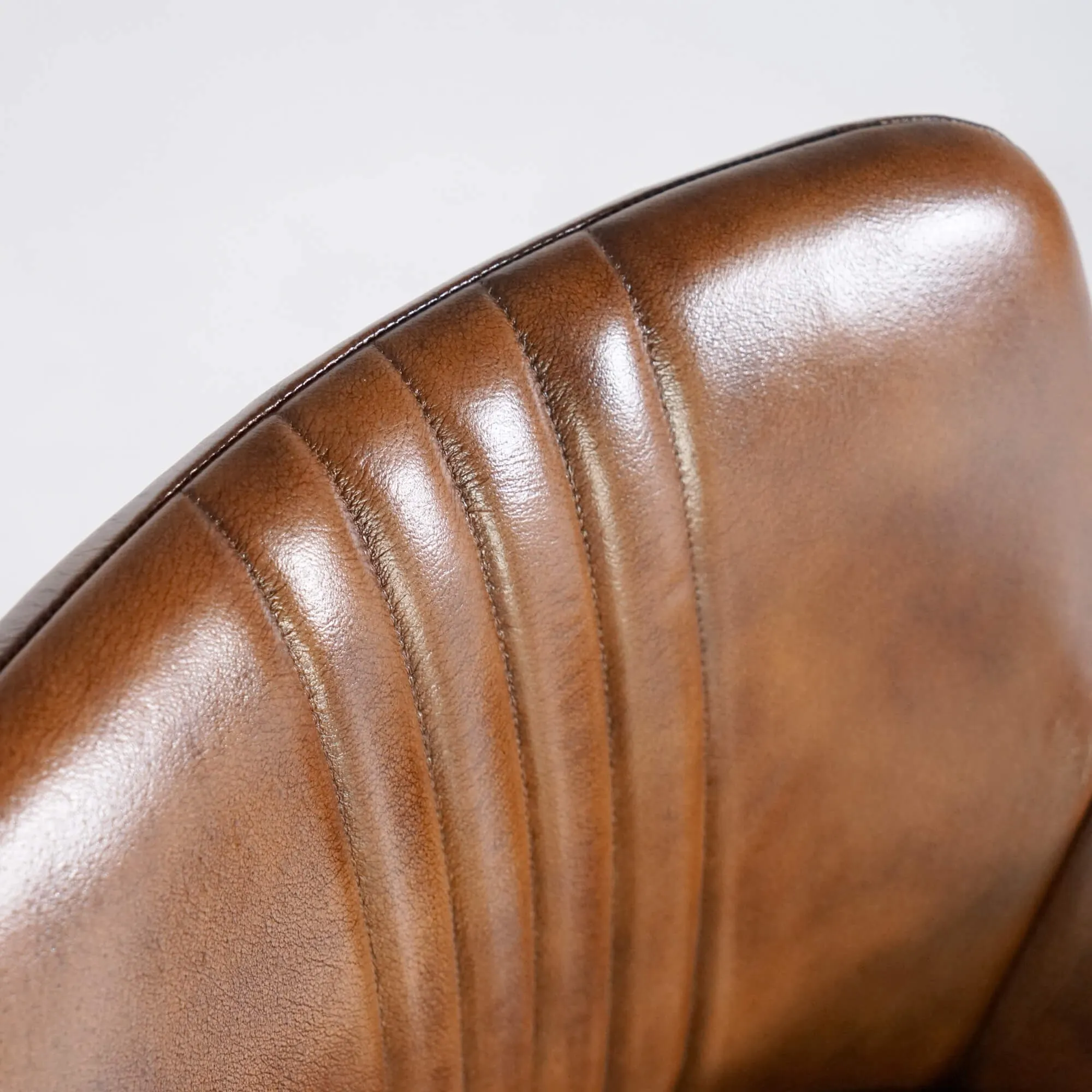 Met de Edison stoel in echt leder wilden onze designers opnieuw dat eerlijke comfort en die geruststellende uitstraling van de klassieke bureaustoelen oproepen, maar dan aangepast aan de interieurs van vandaag. De licht omhullende rugleuning van deze stoel in leder, met fijne verticale nerven, vangt het licht en benadrukt de natuurlijke patina van het leder. We houden van dat warme, genuanceerde bruin dat meteen een doorleefde indruk geeft — zonder ooit in te boeten op de strakke afwerking.