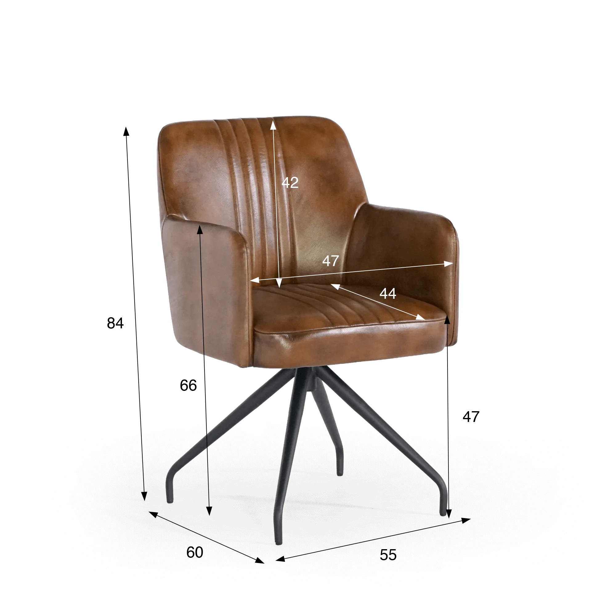 We hebben de verhoudingen zo uitgewerkt dat de zitting van deze stoel in leder ruim blijft zonder massief te ogen: met 55 cm breedte en 60 cm diepte plaats je de Edison stoel in leder moeiteloos aan een bureau, aan tafel of in een leeshoek. De zithoogte ligt rond 47 cm, een prettig dagelijks referentiepunt, terwijl de armleuningen tot 66 cm reiken om de onderarmen vanzelf te ondersteunen. Binnenin deze stoel in leder biedt de zitruimte van ongeveer 47 cm breed en 44 cm diep een stabiele, comfortabele houding, ideaal wanneer de dag wat langer duurt. De rugleuning ondersteunt bovendien de bovenrug (ongeveer 42 cm op het bruikbare deel), voor een mooi gedoseerd gevoel van steun.