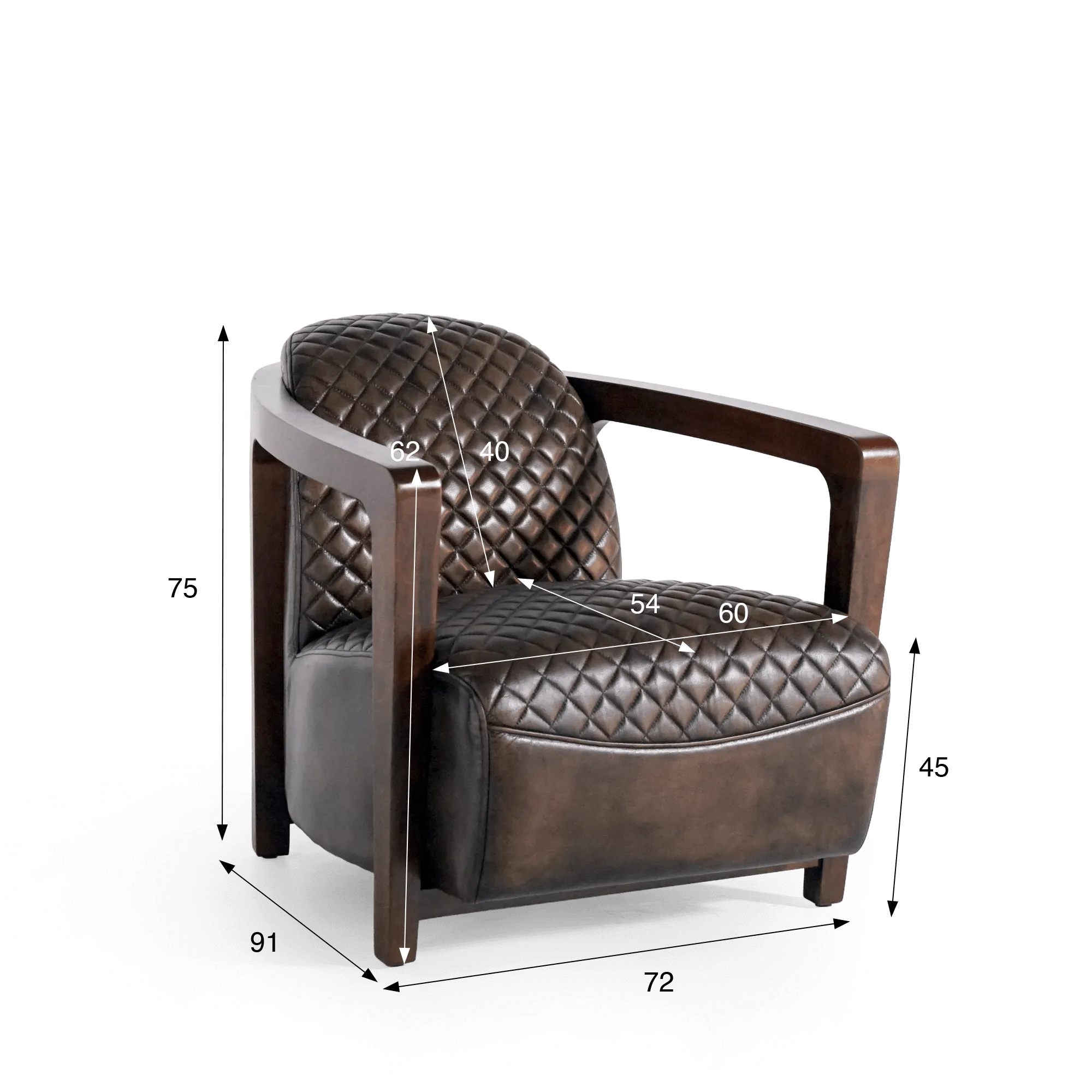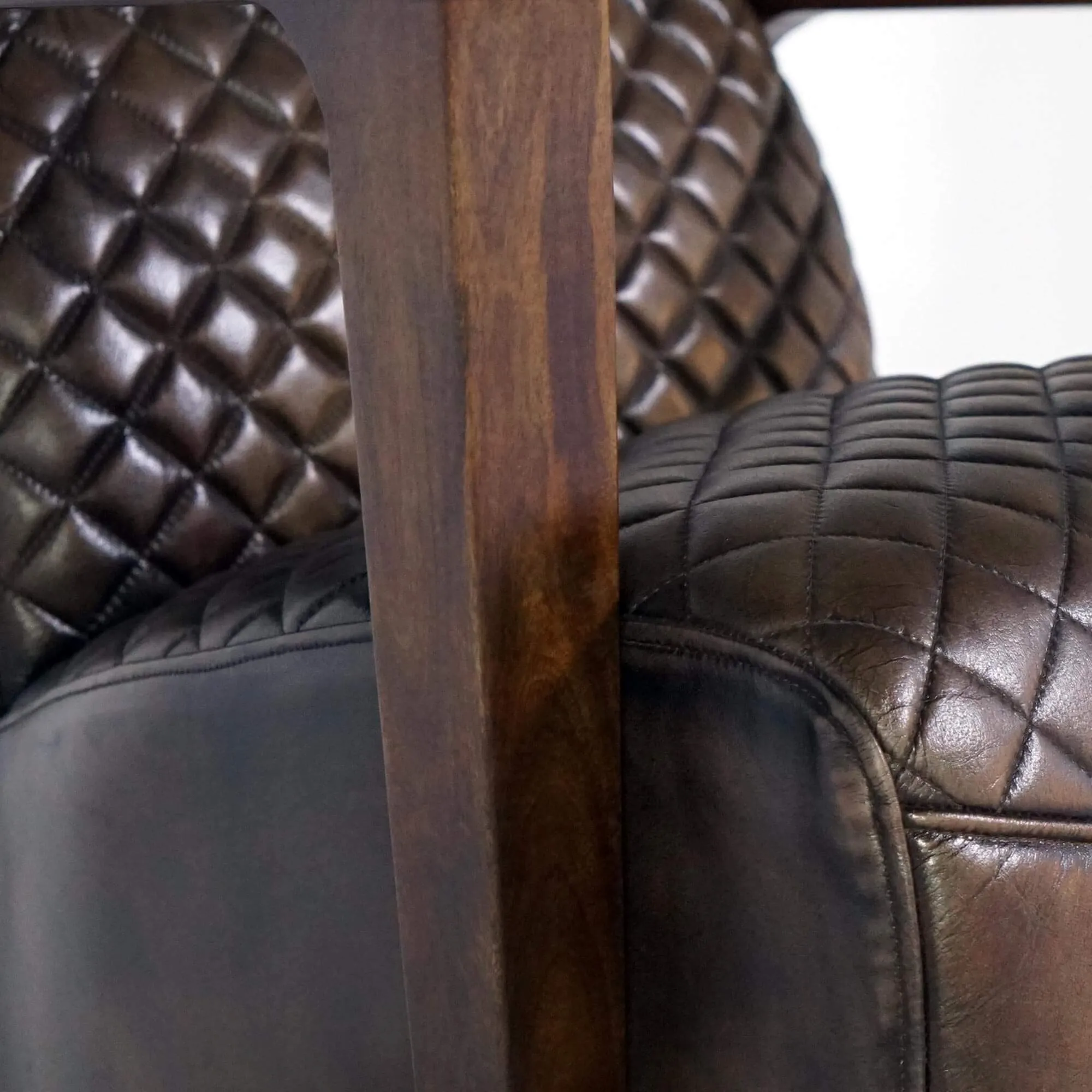 Het volnerfleer, bij dit model met een verfijnde patina afgewerkt, toont een natuurlijke nerf en voelt vol en rijk aan. Het ruitpatroon accentueert het ambachtelijke karakter van het stuk en verhoogt bovendien het zitcomfort. De rugleuning van deze leren fauteuil helt licht achterover en volgt je rug op een intuïtieve manier, terwijl de royale zitting een zitdiepte van ongeveer 54 cm biedt voor een echt moment van ontspanning. In gebruik zal het leer zachtjes evolueren, soepeler worden en aan karakter winnen. De verhoudingen van de leren fauteuil Graham zijn ontworpen voor elke dag: 75 cm totale hoogte, 72 cm breedte en 91 cm diepte, waardoor hij zich even vlot laat plaatsen in een ruime woonkamer als in een meer intiem bureau.