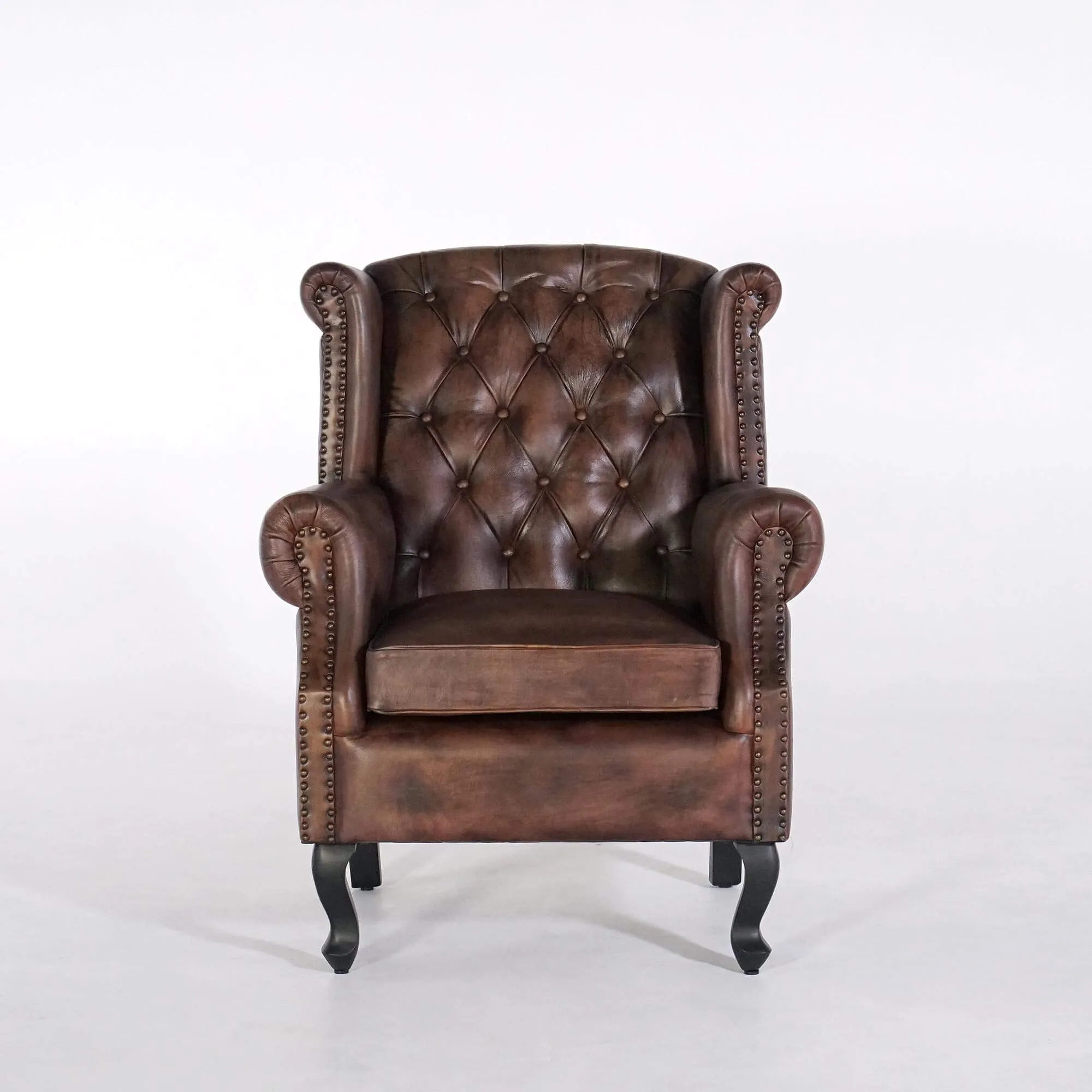 Als onderdeel van onze reeks fauteuils met vintage inspiratie combineert deze Engelse clubzetel bijzonder mooi met onze meubels in massief hout en metaal, voor een harmonieuze en coherente inrichting in de leefruimte.