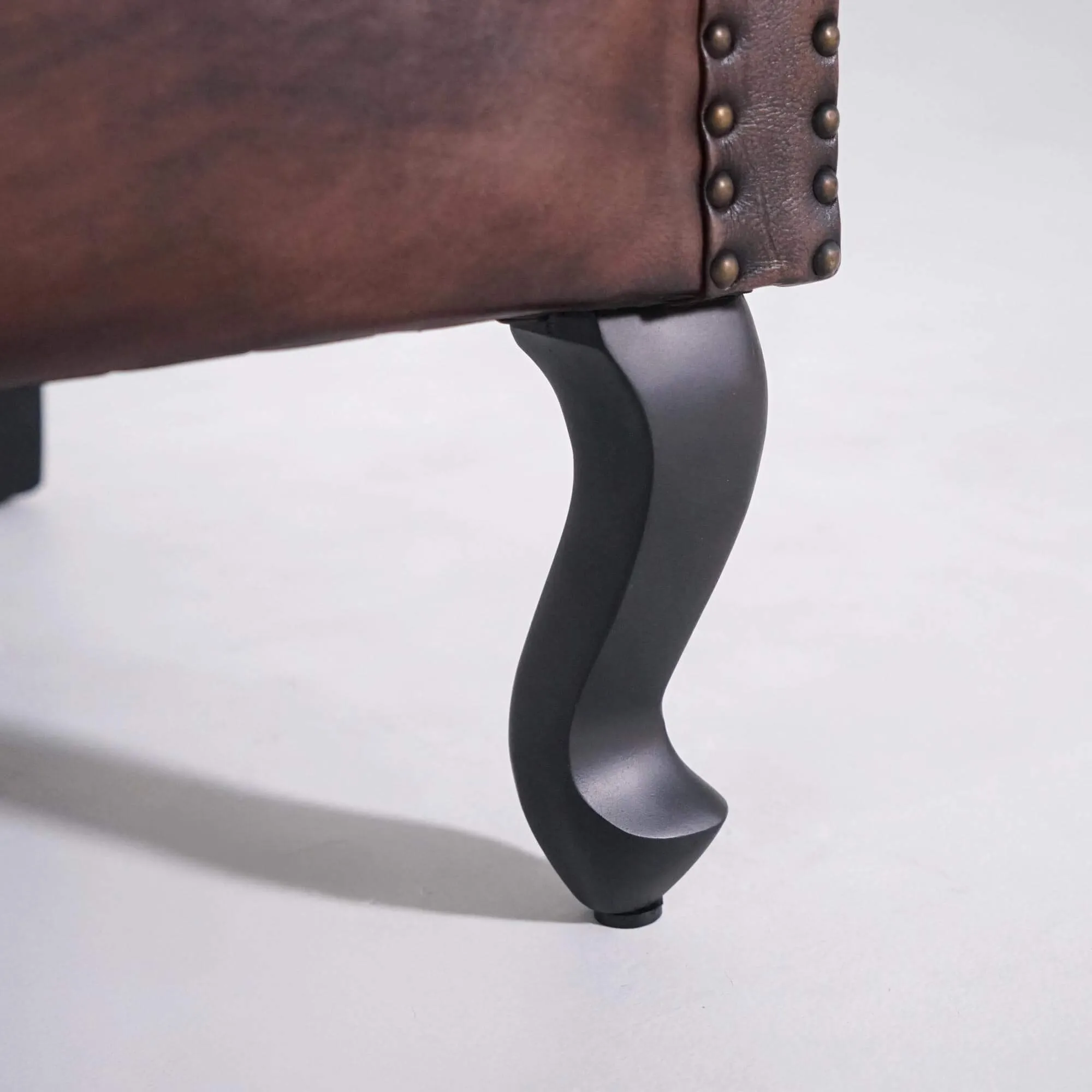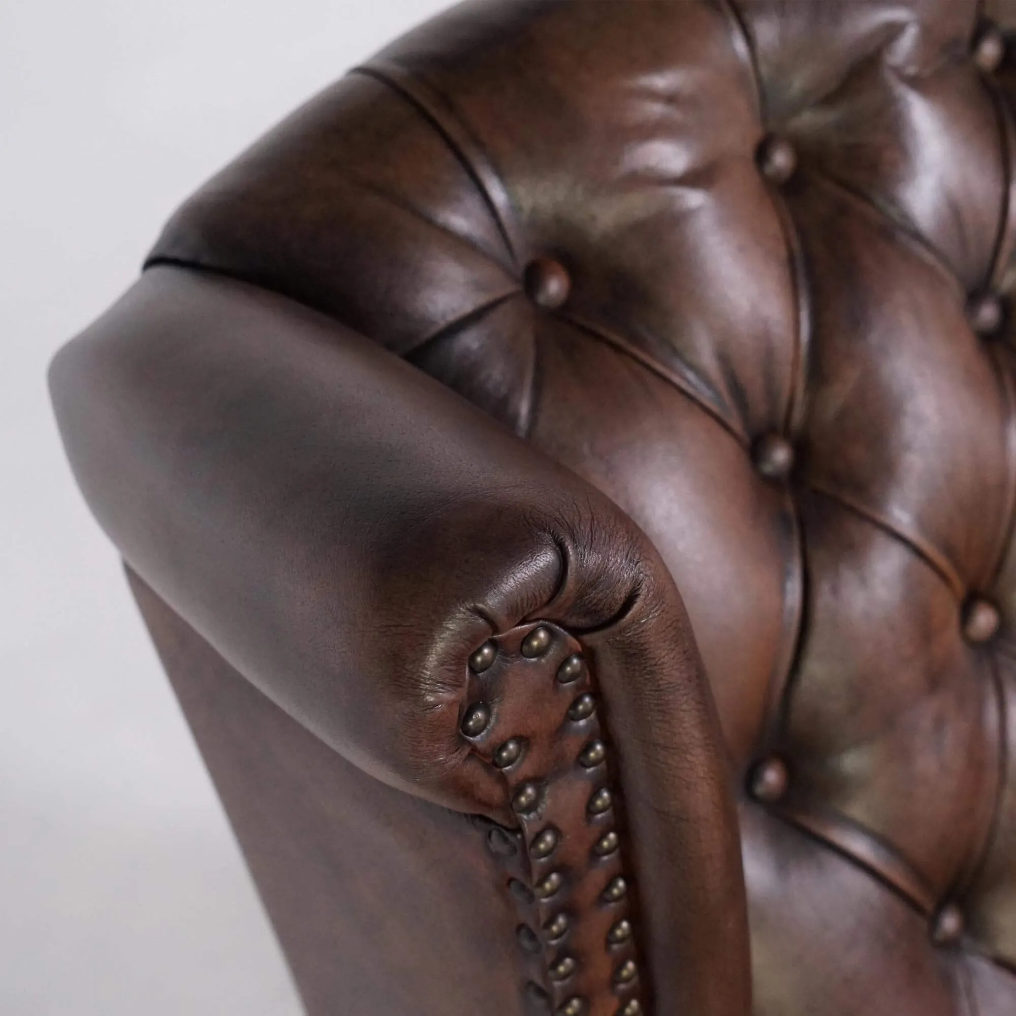 Bij het ontwerp van deze Engelse clubzetel hebben onze designers gekozen voor een royale zit in echt volnerfleer, geselecteerd om zijn duurzaamheid, natuurlijke patina en het vermogen om licht te reflecteren zonder overdreven glans. De diepe kapitonering van de rugleuning, geïnspireerd op Chesterfield-banken, zorgt voor een omhullende ondersteuning, terwijl de gerolde armleuningen vanzelf uitnodigen om plaats te nemen. De rug van de Engelse clubzetel George is ongeveer 108 cm hoog en creëert een echte comfortzone waarin je lichaam volledig kan ontspannen; de zithoogte bedraagt 51 cm en de zitdiepte is ongeveer 49 cm, ideaal voor dagelijks gebruik.