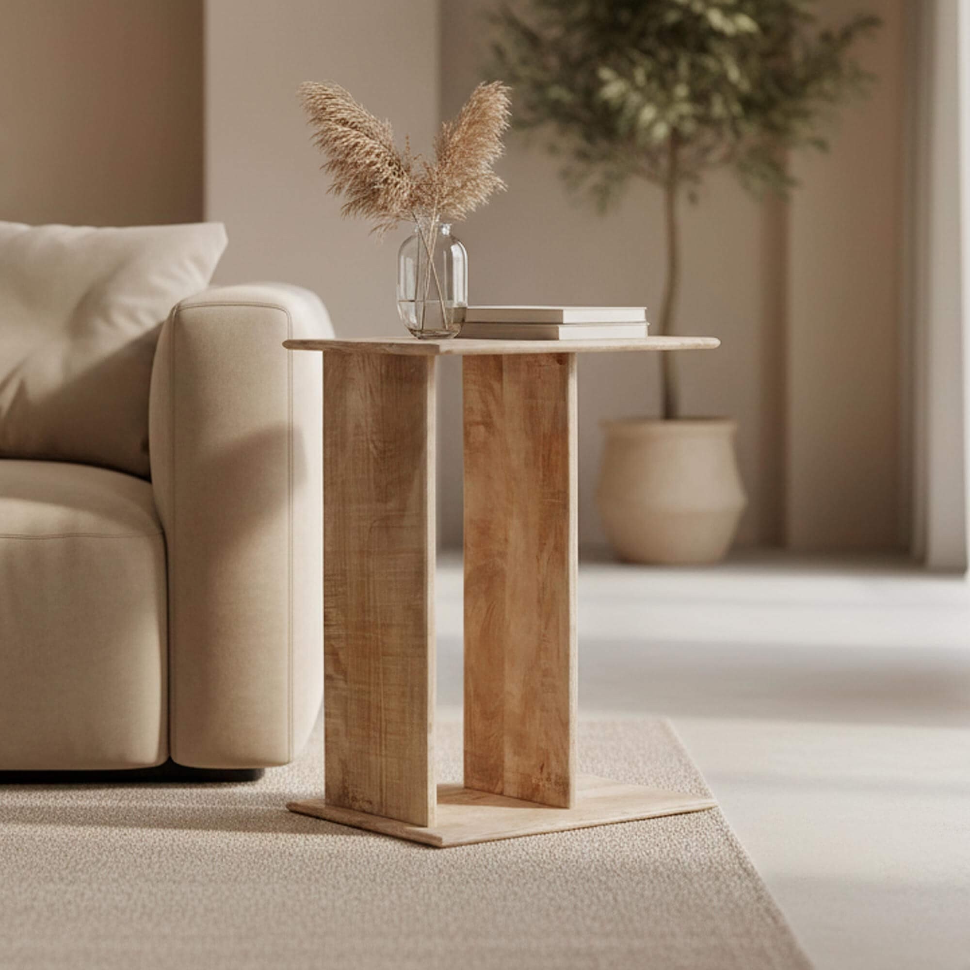 De bijzettafel in massief hout Luno behoort tot onze collectie meubels in massief mangohout en sluit harmonieus aan bij onze andere stukken in dezelfde houtsoort, voor een zachte en consistente continuïteit in de ruimte.