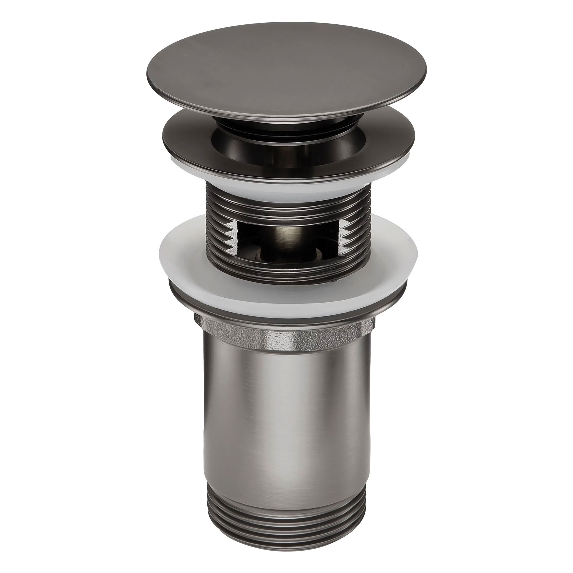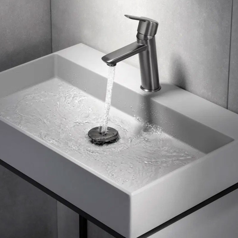 Wij hebben deze klik-klak wastafelafvoer met metalen manchet geselecteerd omwille van haar verfijnde titanium afwerking – een subtiele combinatie van moderniteit en pure elegantie. Ze onderscheidt zich door haar diepe, licht satijnen grijze tint, die zowel harmonieert met donkere kranen als met wastafels in natuursteen, beton of licht terrazzo. Deze minerale en eigentijdse kleur geeft de badkamer een verfijnd karakter en past perfect in zowel moderne als industriële interieurs.