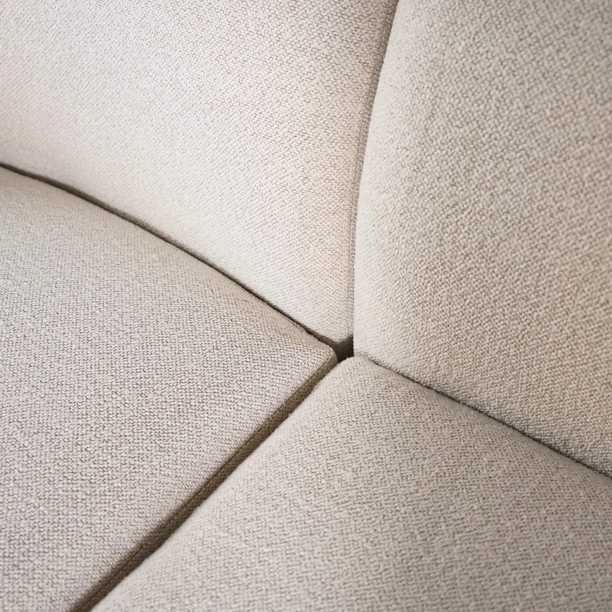 Voor dit model kozen we een getextureerde stof geïnspireerd op bouclé, aangenaam om aan te raken en bestand tegen dagelijks gebruik. Oeko-Tex®-gecertificeerd, garandeert het een duurzaam comfort en een uitstekende kleurvastheid, met een slijtvastheid van meer dan 45.000 Martindale-cycli en een quasi-nul pluizenvorming (pilling 4-5). De zitting van deze design 2-zitsbank combineert een HR-schuim met hoge dichtheid, een systeem van pocketveren en lagen PU-schuim om zowel ondersteuning als soepelheid te bieden. De rugleuning is voorzien van zorgvuldig gekalibreerde schuimlagen die zorgen voor een gelijkmatig comfort, ideaal voor ontspanning en lange, gezellige avonden.