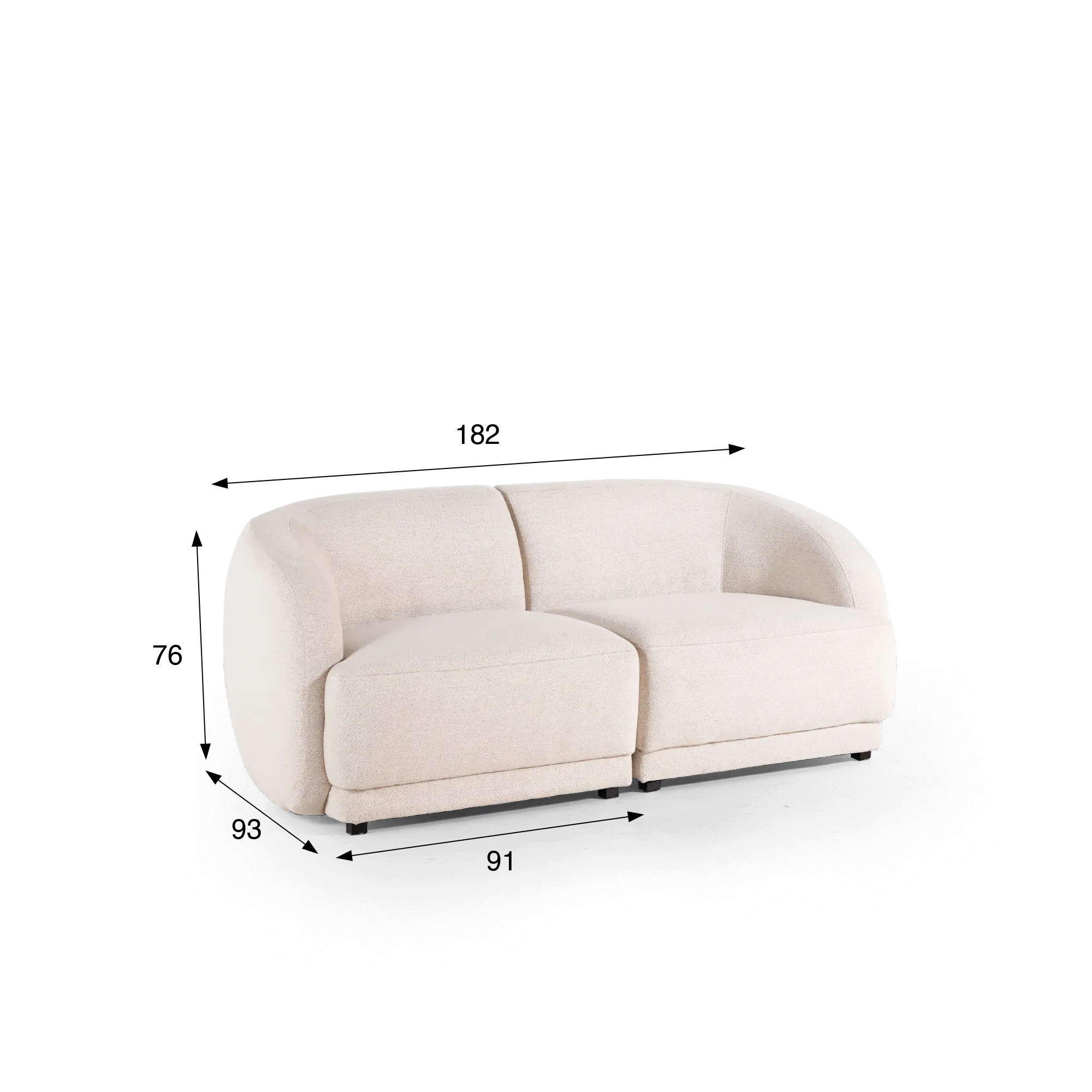 Ontworpen door onze designers als een meubel dat zowel sculpturaal als uitnodigend is, belichaamt de design 2-zitsbank Elora de elegantie van organische lijnen en de geest van modern minimalisme. De afgeronde vormen en het lage silhouet roepen een onmiddellijke zachtheid op die een woonkamer kan transformeren tot een plek van sereniteit en gezellig samenzijn. Met zijn evenwichtige proporties – 182 cm breed, 93 cm diep en 76 cm hoog – past deze 2-zitsbank harmonieus in zowel een stedelijk appartement als een ruimer huis.