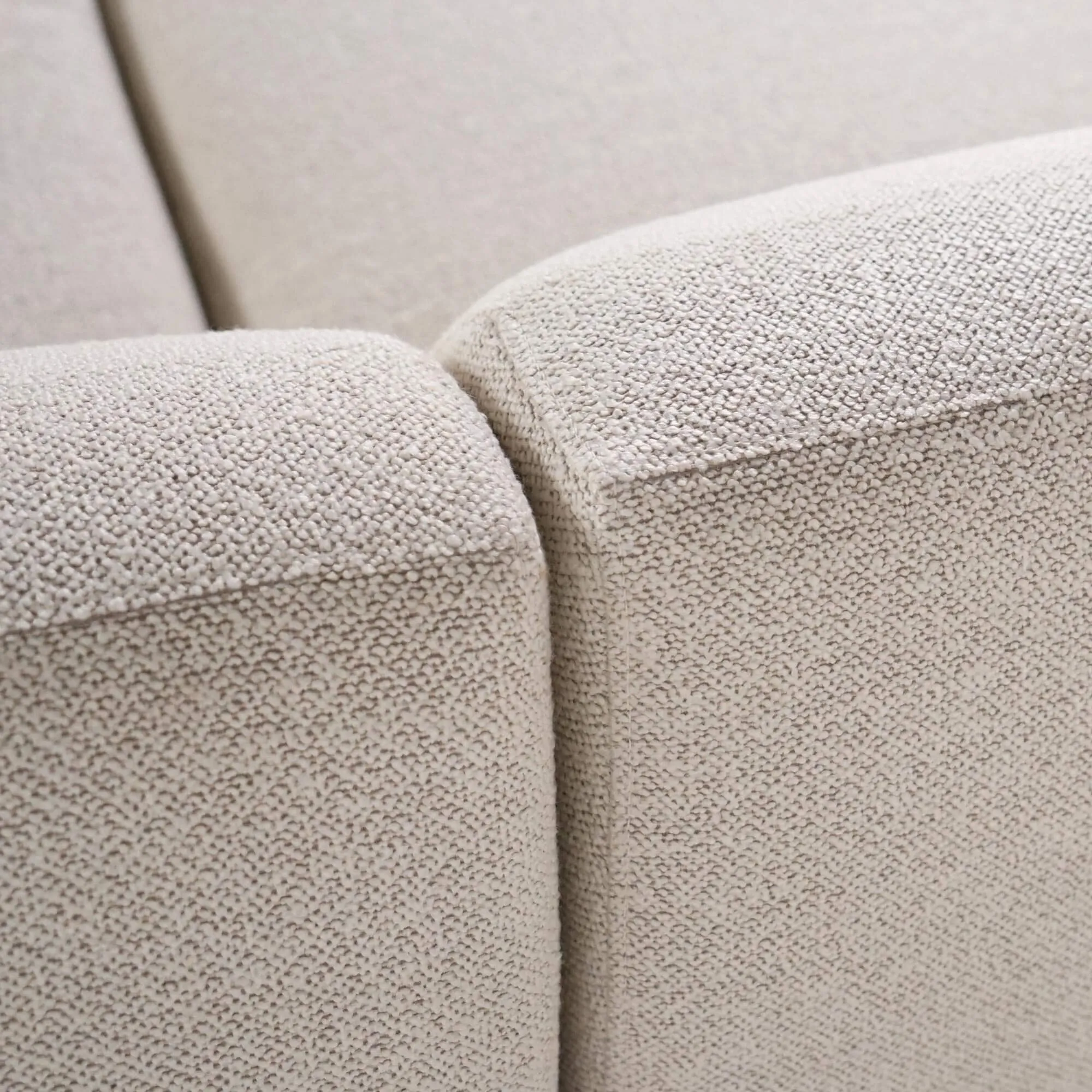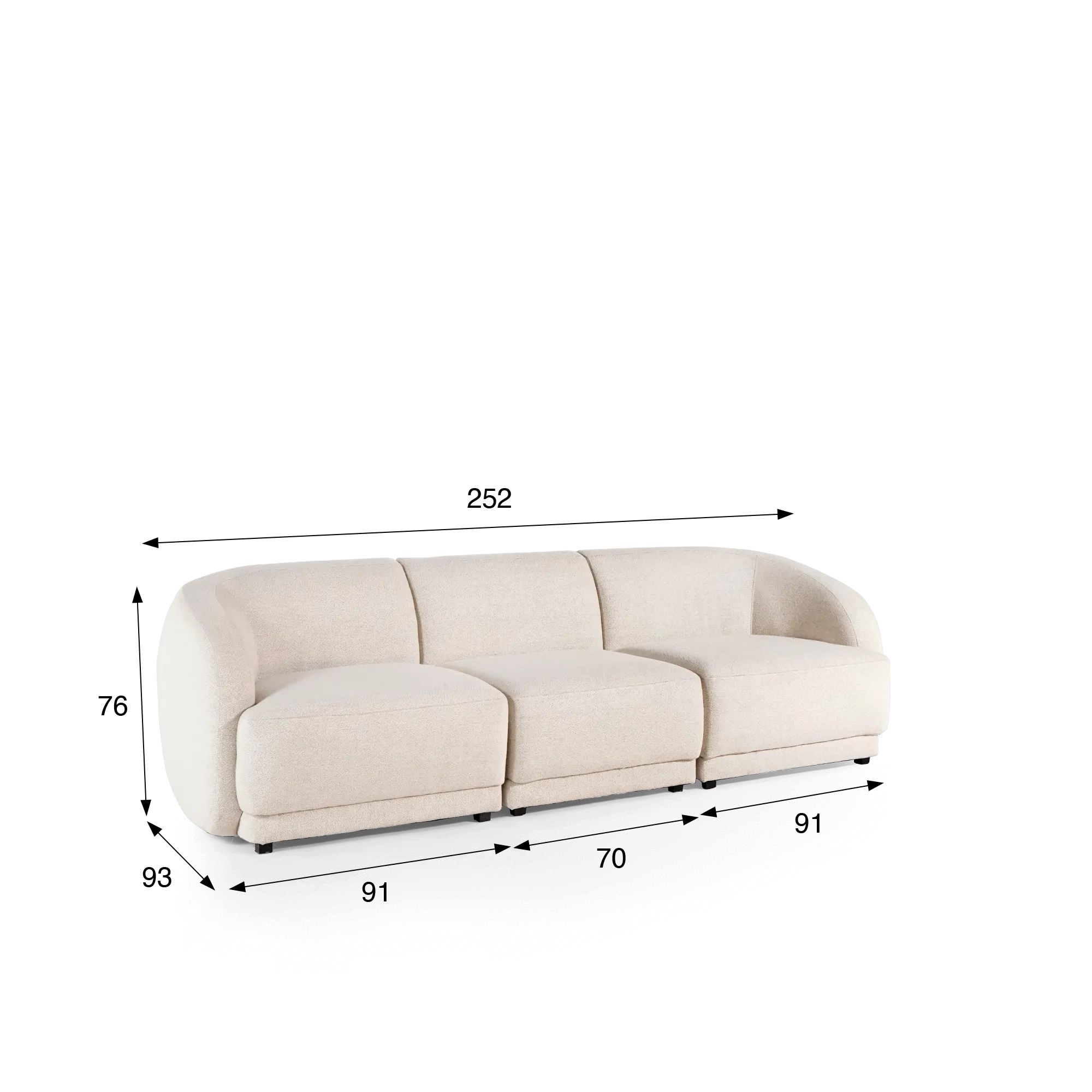Voor de bekleding kozen we een lichte, warme en getextureerde stof die het licht subtiel vangt en de royale volumes van de zitting van deze moderne 3-zitsbank benadrukt. De textuur zorgt zowel voor diepte als voor een aangenaam tactiel gevoel, ideaal voor ontspannende momenten. Met zijn 252 cm breedte, 93 cm diepte en 76 cm hoogte neemt de moderne 3-zitsbank een centrale plaats in de woonkamer in, zonder de ruimte te verzwaren dankzij het vloeiende en uitgebalanceerde ontwerp. De brede, comfortabele zitplaatsen worden ondersteund door een ergonomische constructie en een zorgvuldig gekozen vulling om duurzaam dagelijks comfort te garanderen.
