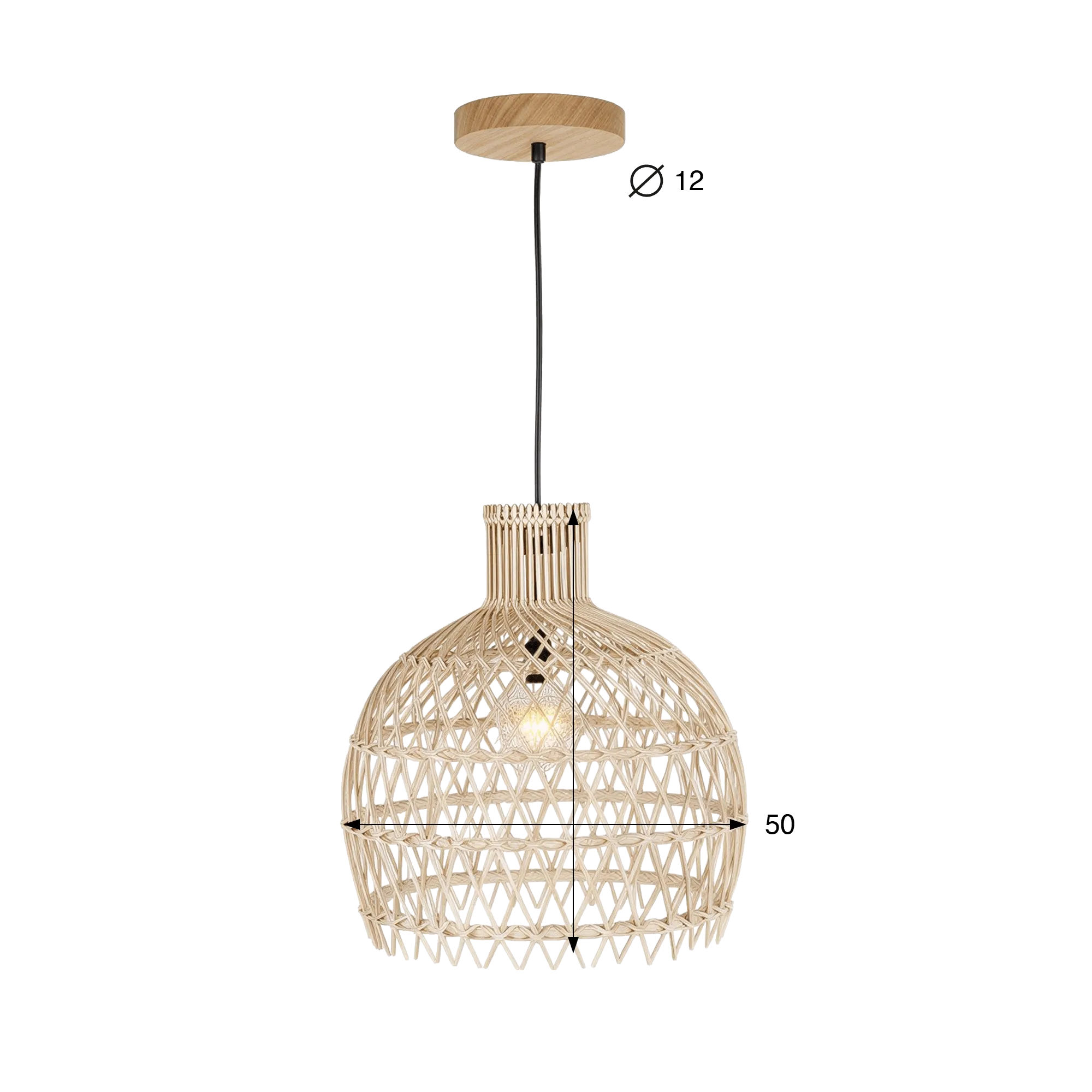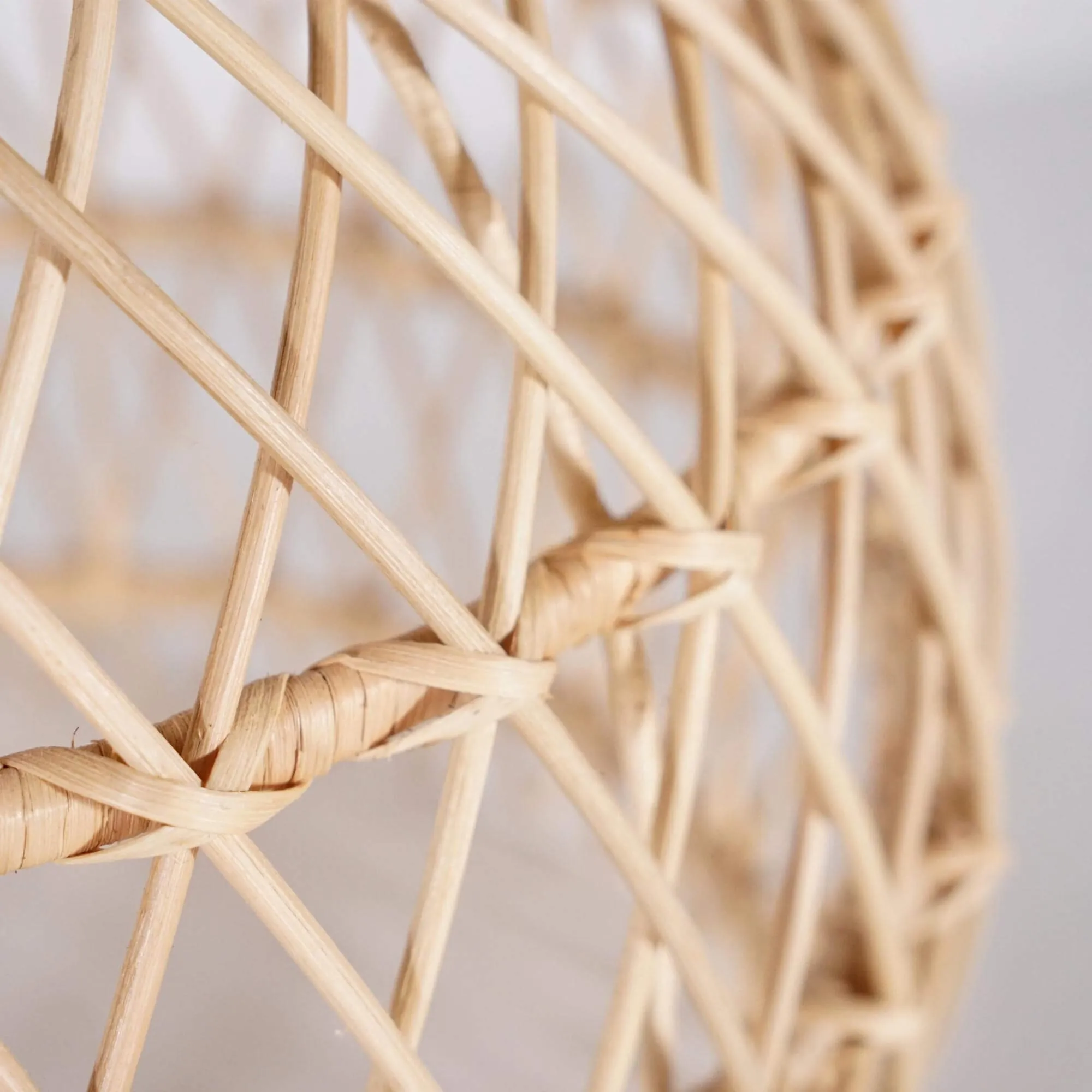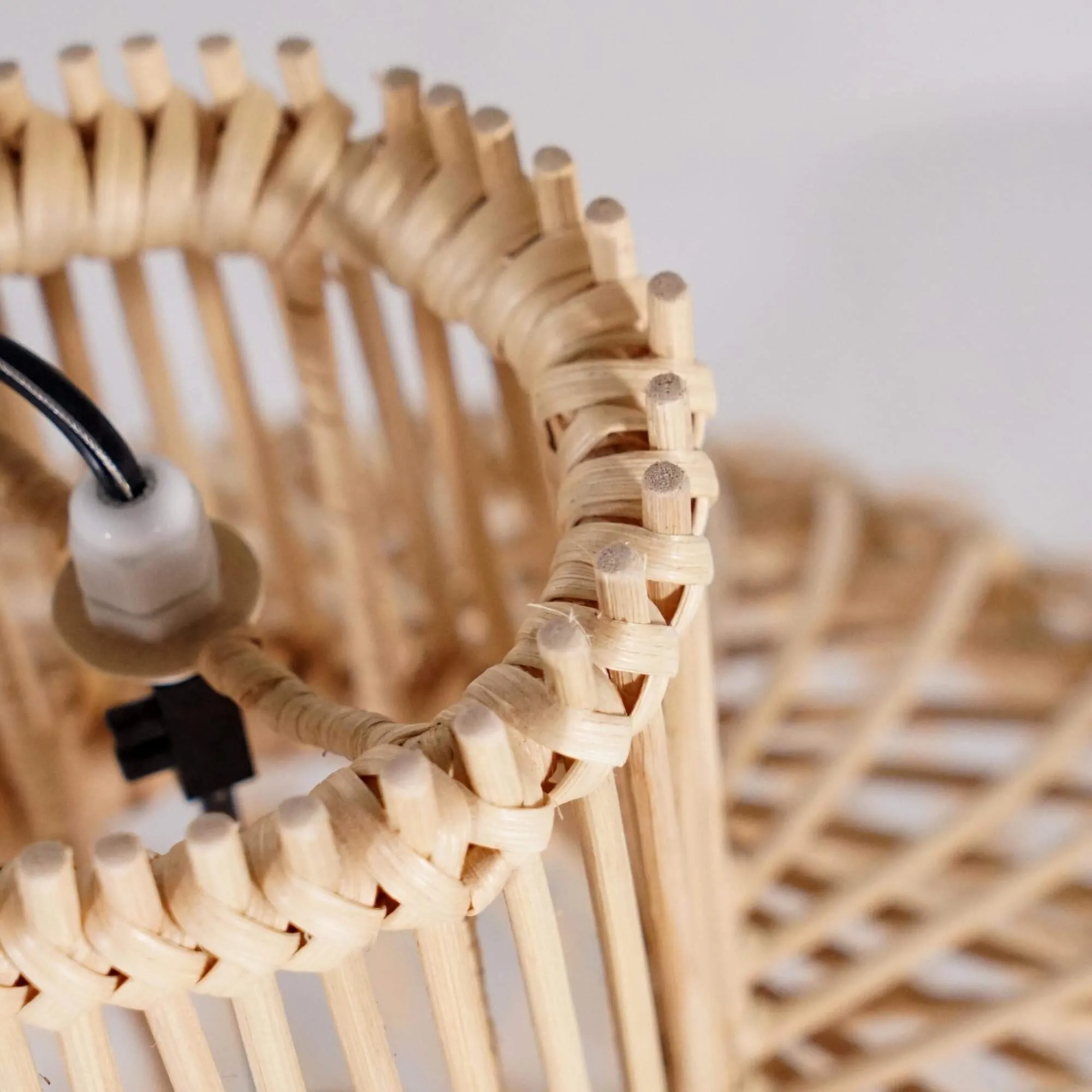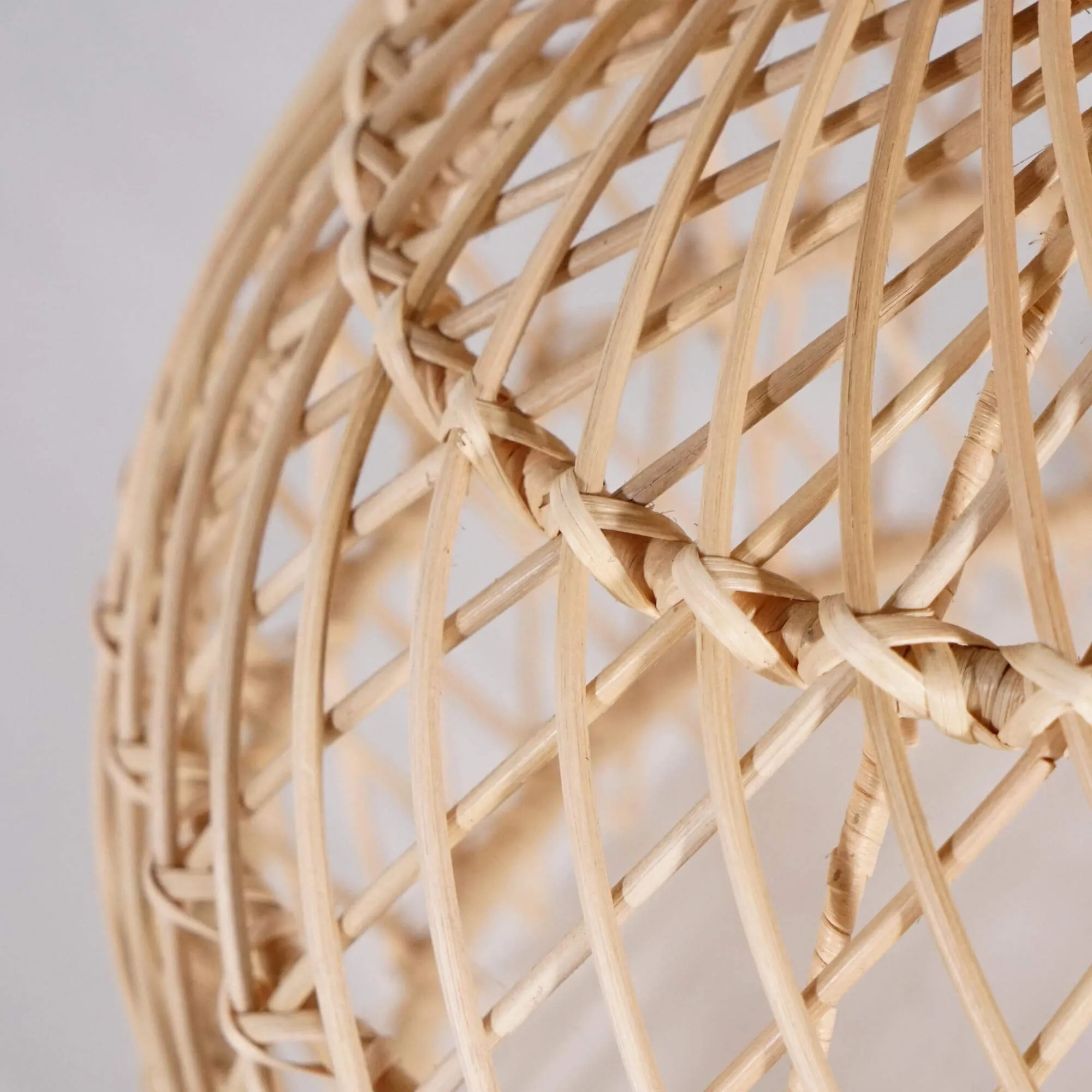 Deze hanglamp is volledig uitgevoerd in natuurlijk rotan en toont een verfijnd vlechtwerk waarbij elke vezel met precisie op zijn plaats valt. We besteedden bijzondere aandacht aan het ritme van het patroon, met een afwisseling van verticale lijnen en luchtigere kruisingen, zodat de lamp een royale en evenwichtige vorm krijgt. Met een diameter van ongeveer 50 cm en een hoogte van om en bij de 50 cm heeft ze een duidelijke aanwezigheid, terwijl ze dankzij de open structuur toch opvallend licht oogt.