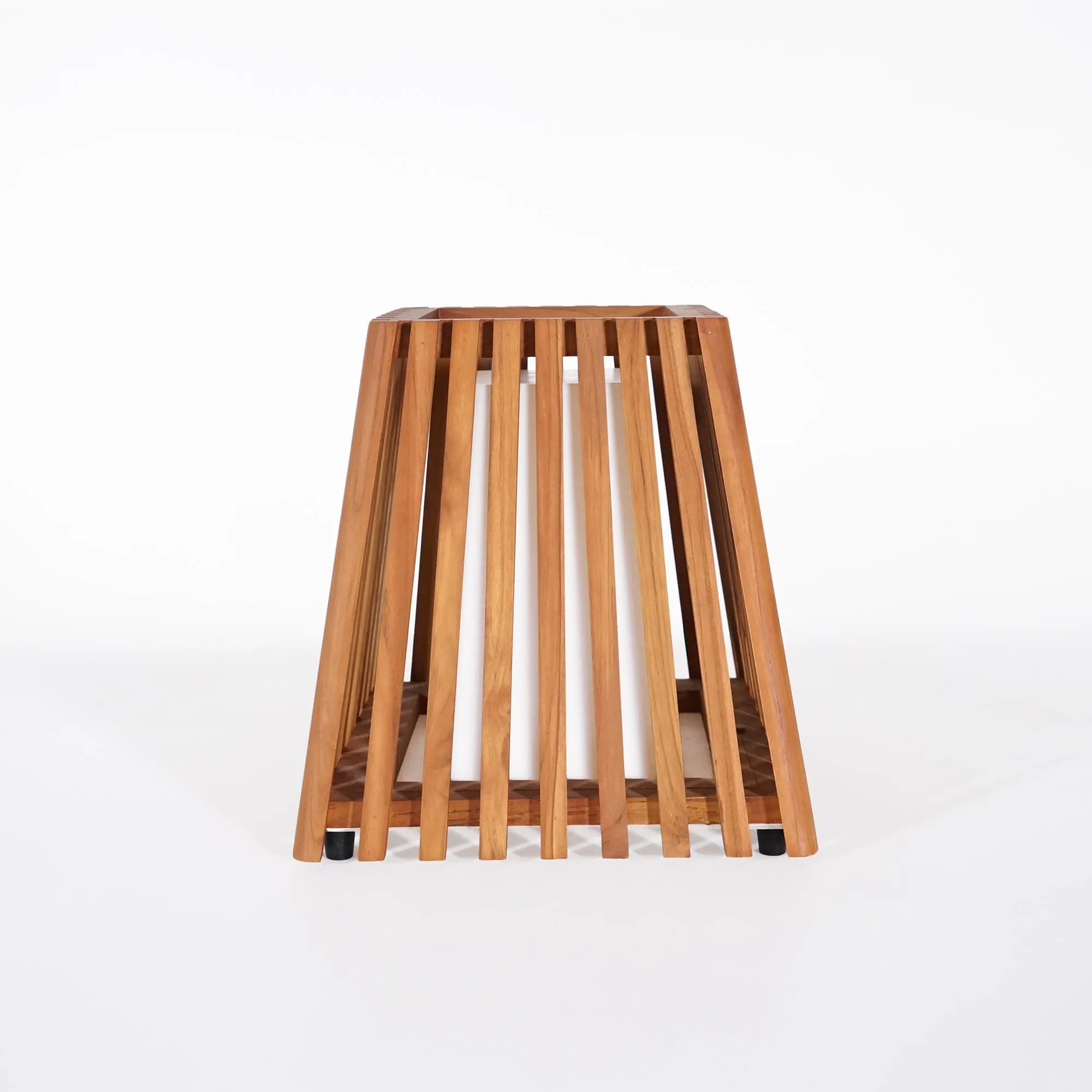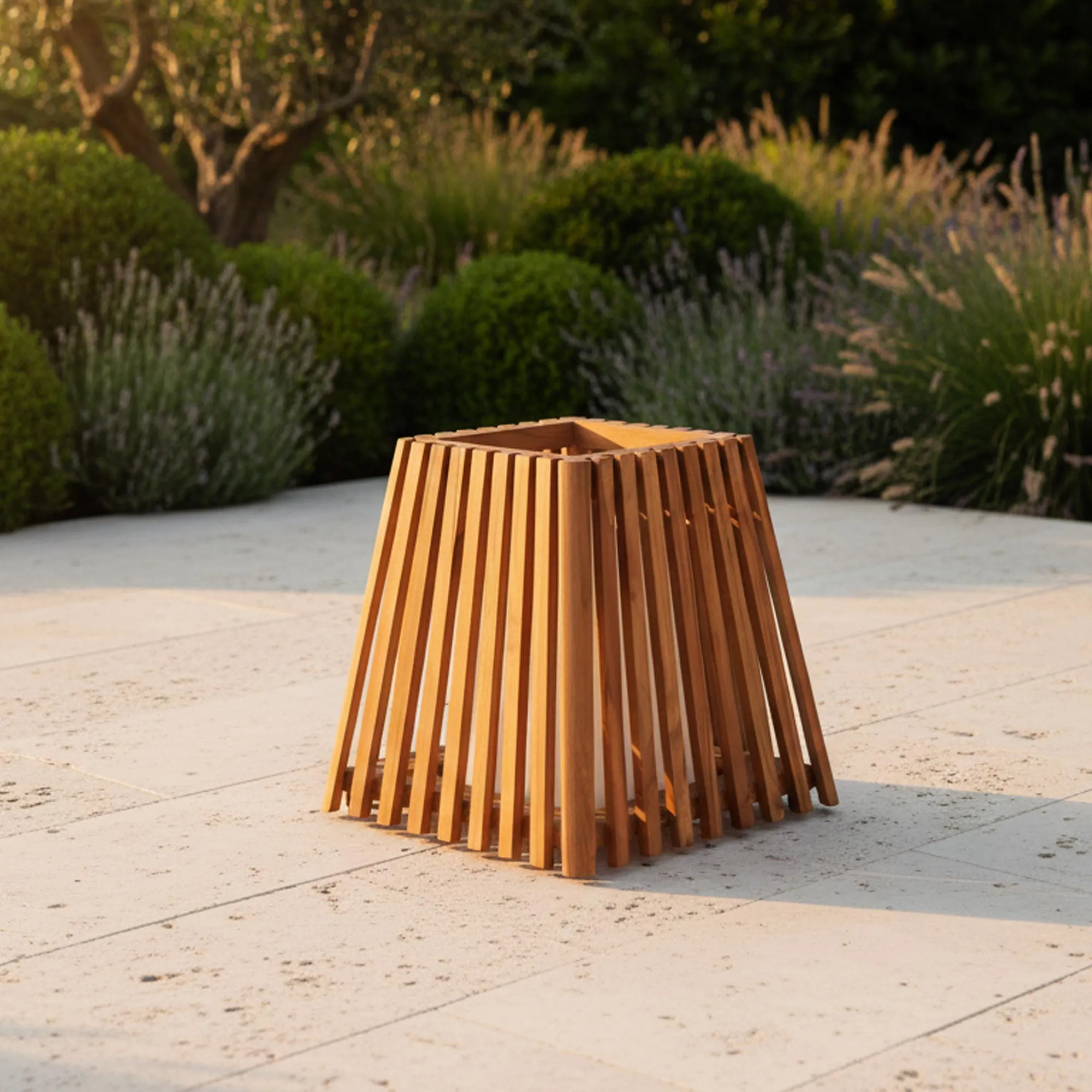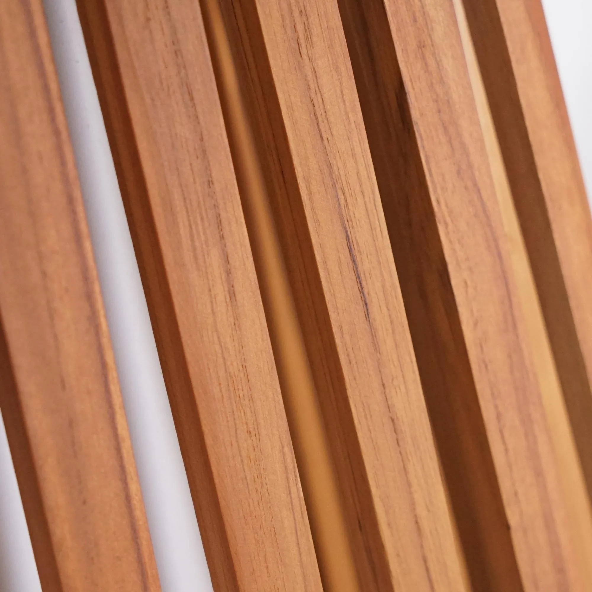 Toen we de buitenlamp in teakhout Nori ontwierpen, wilden we een armatuur creëren dat de momenten in de tuin begeleidt met een uitstraling die tegelijk warm en discreet is. Ons vertrekpunt was teakhout, een houtsoort die we al lang waarderen om haar natuurlijke weerstand tegen buitenomstandigheden en om de rijkdom van de nerf. Zo tekenden we een lamp met open en luchtige lijnen, waarvan de lattenstructuur de schoonheid van massief hout onthult en tegelijk het licht vrij laat circuleren.