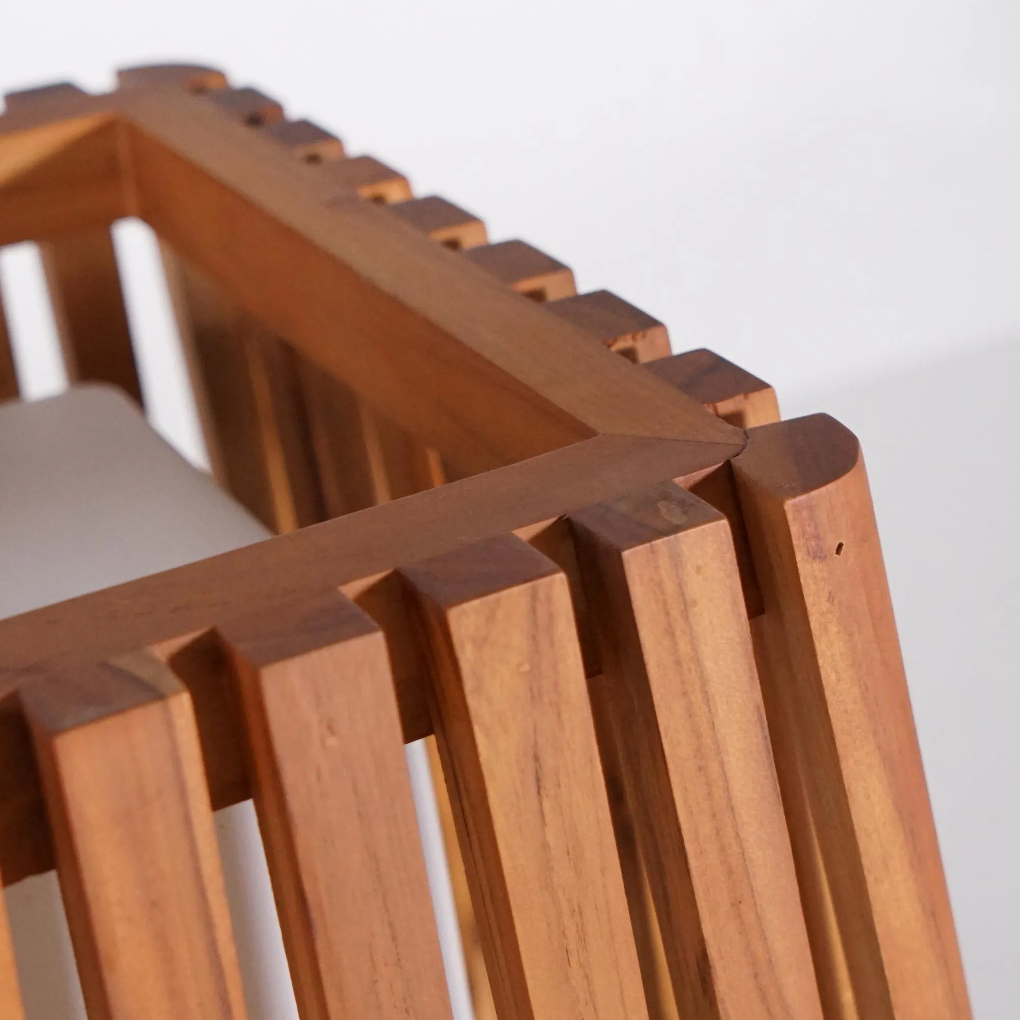 Onze designers werkten elk detail van de structuur van deze buitenlamp in teakhout uit, zodat de verticale latten een harmonieus ritme vormen. Wanneer de lamp brandt, valt het licht door de openingen en tekent het op de grond een fijn spel van schaduwen dat de sfeer op een terras bij het invallen van de avond verandert. Teak, met zijn warme nuances en van nature satijnzachte touch, vangt het licht en onthult de volledige diepte van het materiaal.
