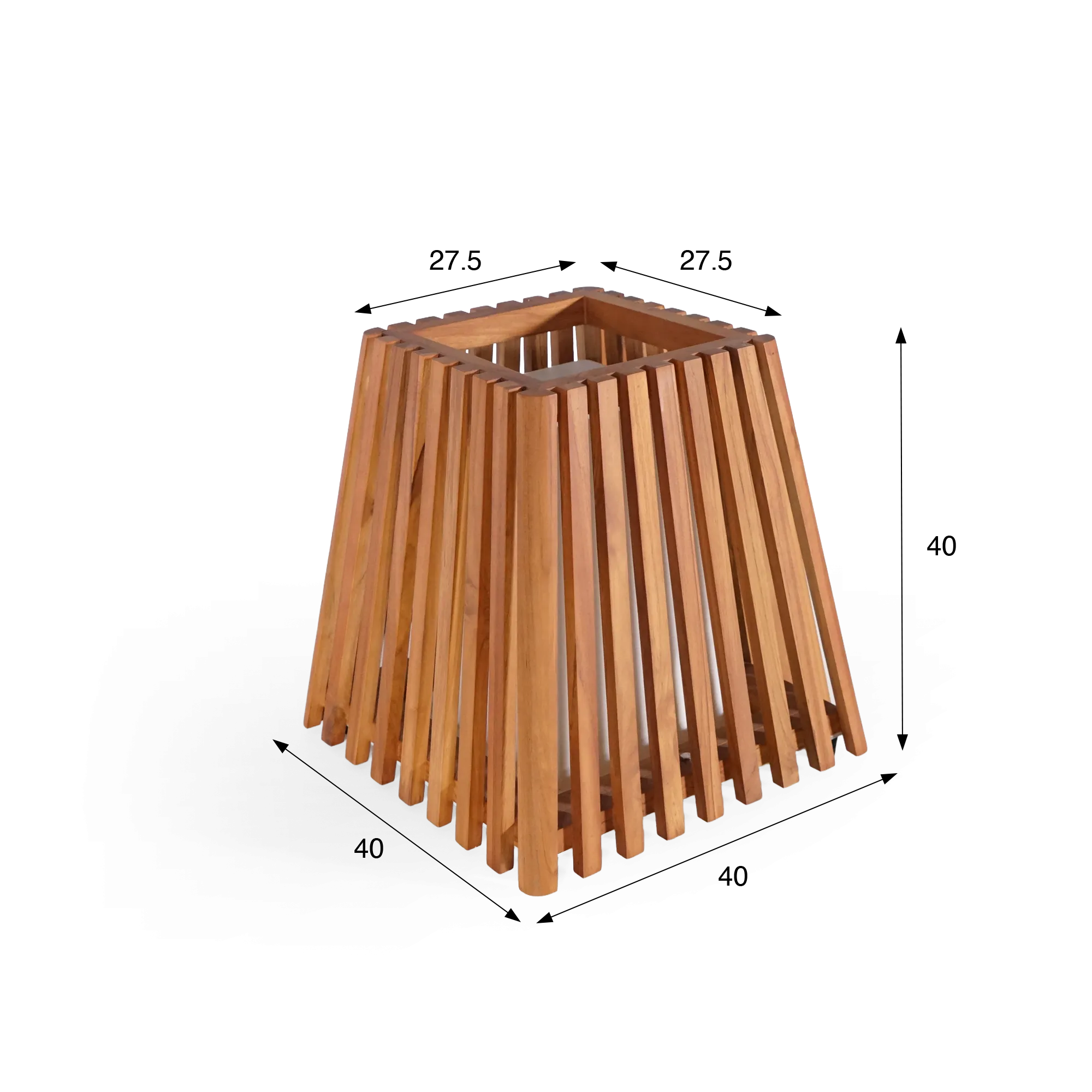 Met haar evenwichtige verhoudingen van 40 cm hoogte en een voet van 40 x 40 cm vindt de buitenlamp in teakhout Nori vanzelf haar plaats op een terras, naast een tuinlounge of langs een pad. De compactere bovenopening van ongeveer 27,5 cm zorgt voor een licht uitlopende silhouet dat het geheel een mooie visuele stabiliteit geeft. Deze vorm is bedacht om het licht zacht en omhullend te verspreiden, terwijl ze de buitenruimte ook een grafisch accent geeft.