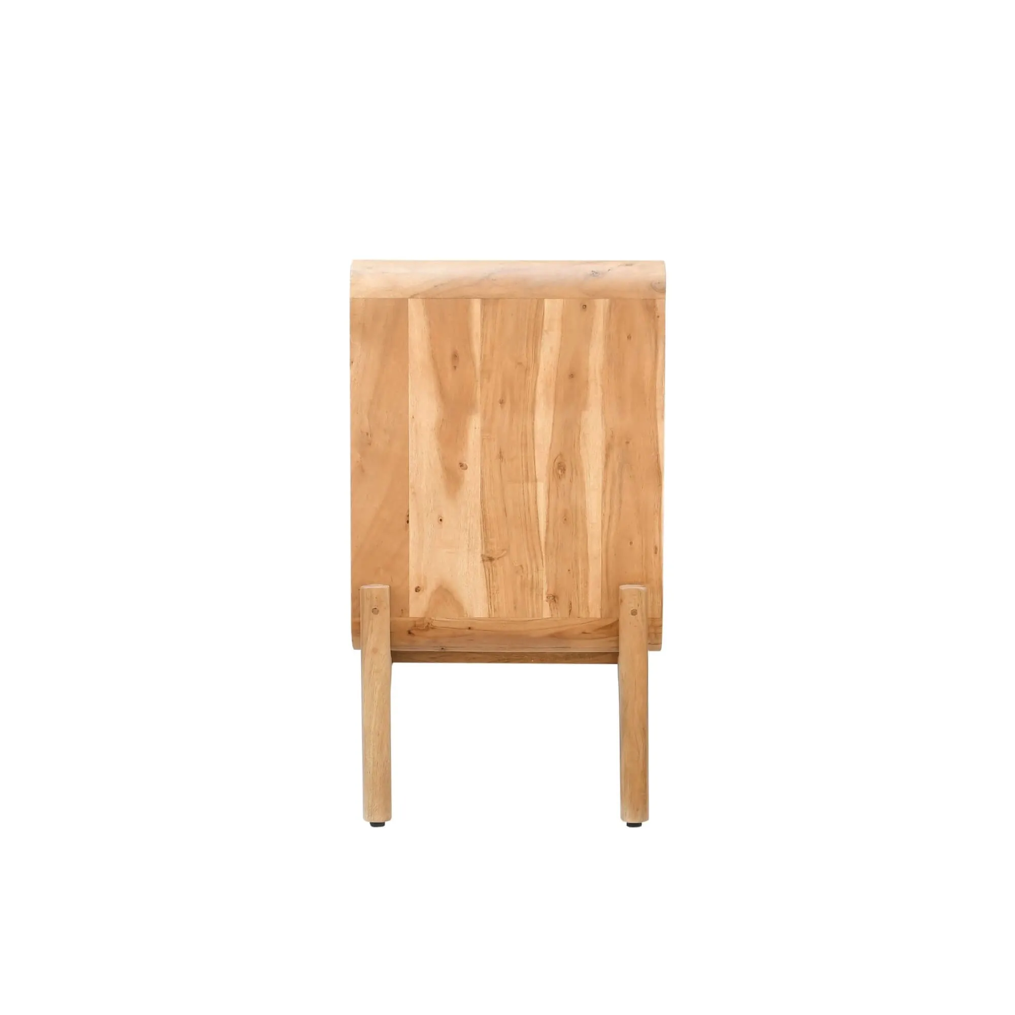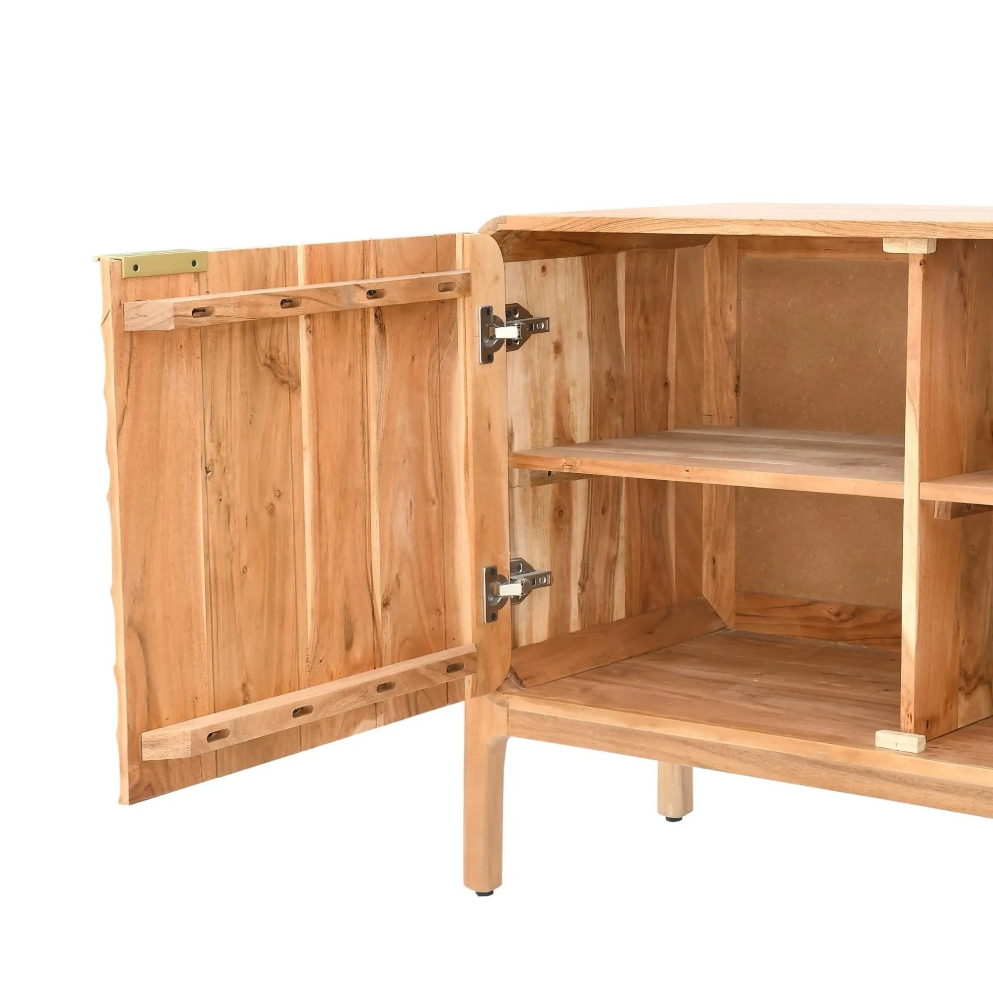 Met het moderne dressoir in massief acaciahout Naoki wilden we een meubel creëren dat reliëf en zachtheid in de leefruimte brengt, terwijl het tegelijk een grote formele soberheid behoudt. Geïnspireerd door de Japandi-esthetiek hebben onze ontwerpers gewerkt aan een evenwichtig silhouet waarin elk detail bijdraagt aan een rustgevende sfeer. De voorzijde onderscheidt zich door ambachtelijk reliëfwerk dat het licht subtiel opvangt en de natuurlijke rijkdom van het massieve acaciahout volledig onthult.