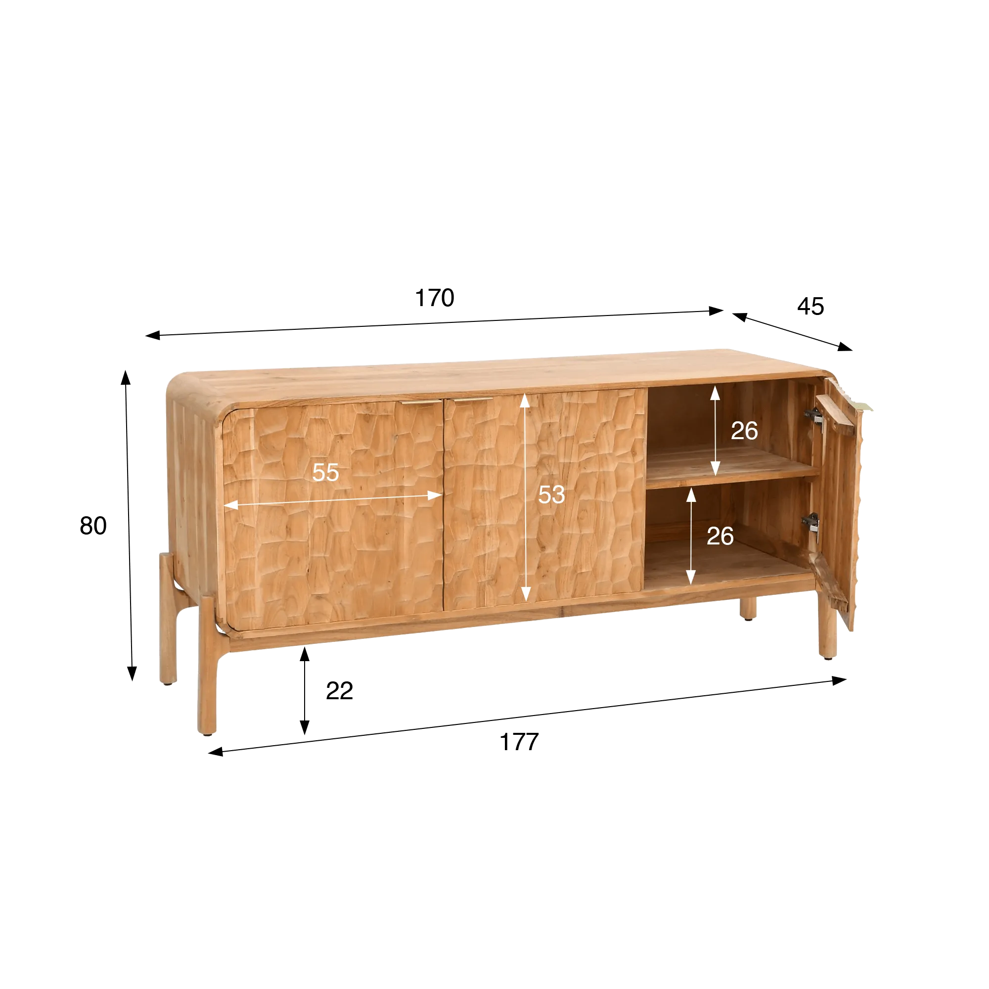 De drie draaideuren van dit moderne dressoir in massief acaciahout geven toegang tot een royale opbergruimte, ontworpen om servies, huishoudlinnen of decoratieve voorwerpen ordelijk op te bergen. De binnenvakken, verdeeld over twee niveaus van elk ongeveer 26 cm hoog, maken het mogelijk om de organisatie te optimaliseren zonder het visuele evenwicht van het geheel te verstoren. Met zijn lengte van 170 cm vindt het moderne dressoir in massief acaciahout Naoki vanzelf zijn plaats in een lichte woonkamer, een gezellige eetkamer of een soberder interieur waar hout harmonieert met natuurlijke materialen.