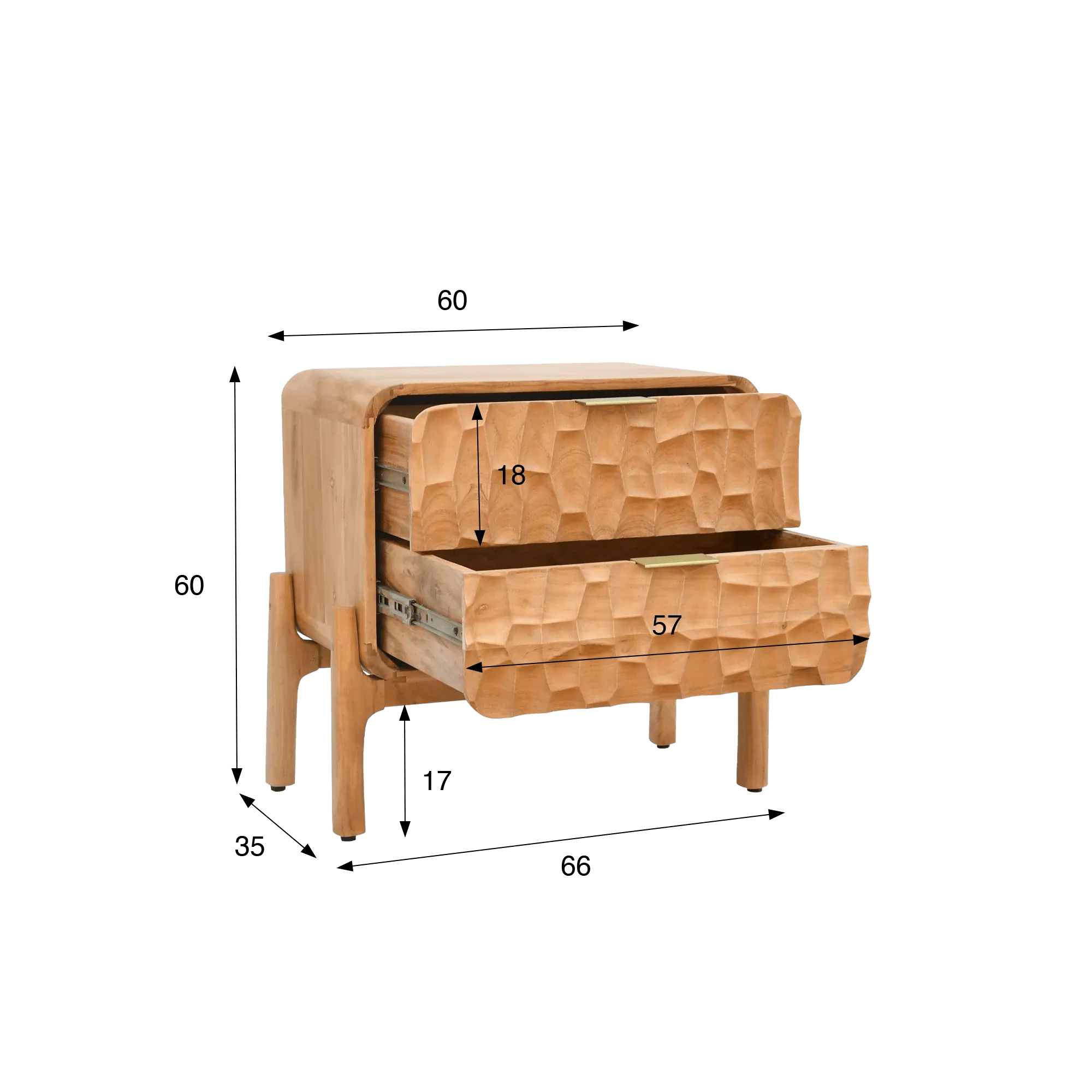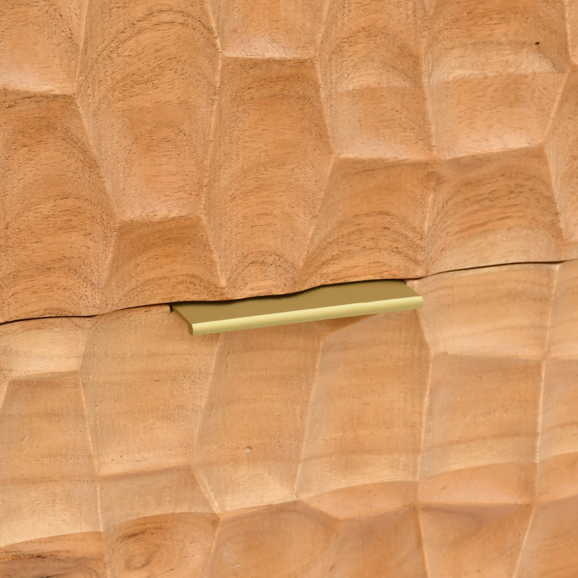 Dit moderne nachtkastje in massief hout, vervaardigd uit acacia, toont een natuurlijk genuanceerde nerftekening die diepte en authenticiteit aan het materiaal geeft. We kozen deze houtsoort om haar stevigheid en om de rijkdom van haar kleurnuances, die subtiel veranderen naargelang het omgevingslicht. De ladefronten werden afgewerkt met ambachtelijk reliëfwerk, waarvan de licht onregelmatige textuur het licht opvangt en het levendige karakter van het hout benadrukt. Dit spel van oppervlakken geeft het meubel een gevoelige, bijna tastbare dimensie, waar we bijzonder trots op zijn.