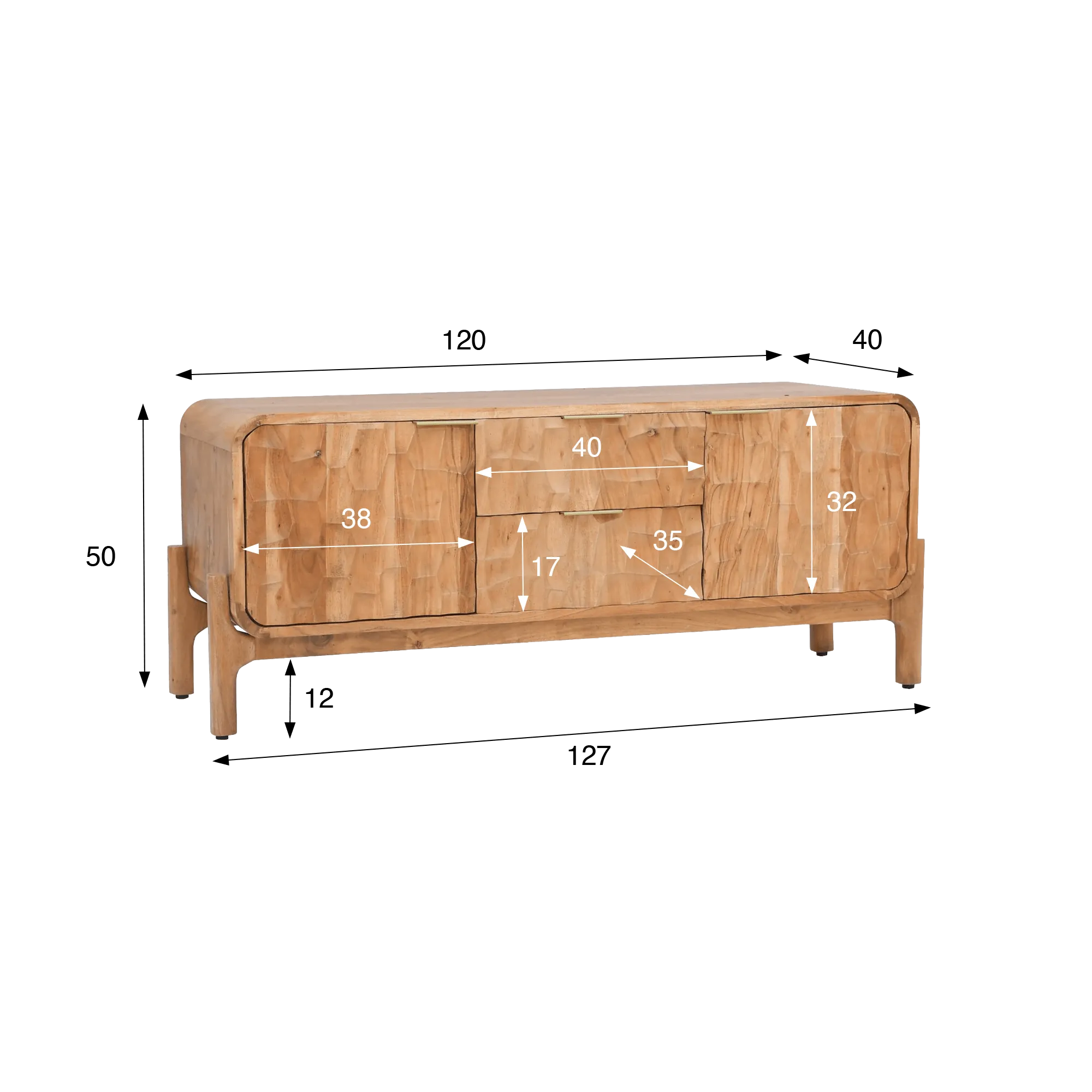 Het ambachtelijke werk van de fronten van dit design tv-meubel in massief acaciahout trekt subtiel de aandacht. Elk reliëf werd zo vormgegeven dat het doorheen de dag het licht op een andere manier opvangt, waardoor een verfijnd spel van texturen ontstaat dat het oppervlak van het meubel tot leven brengt zonder het geheel ooit te verzwaren. We zijn bijzonder trots op dit evenwicht tussen beheerste structuur en een natuurlijk gevoel, kenmerkend voor de Naoki-collectie.