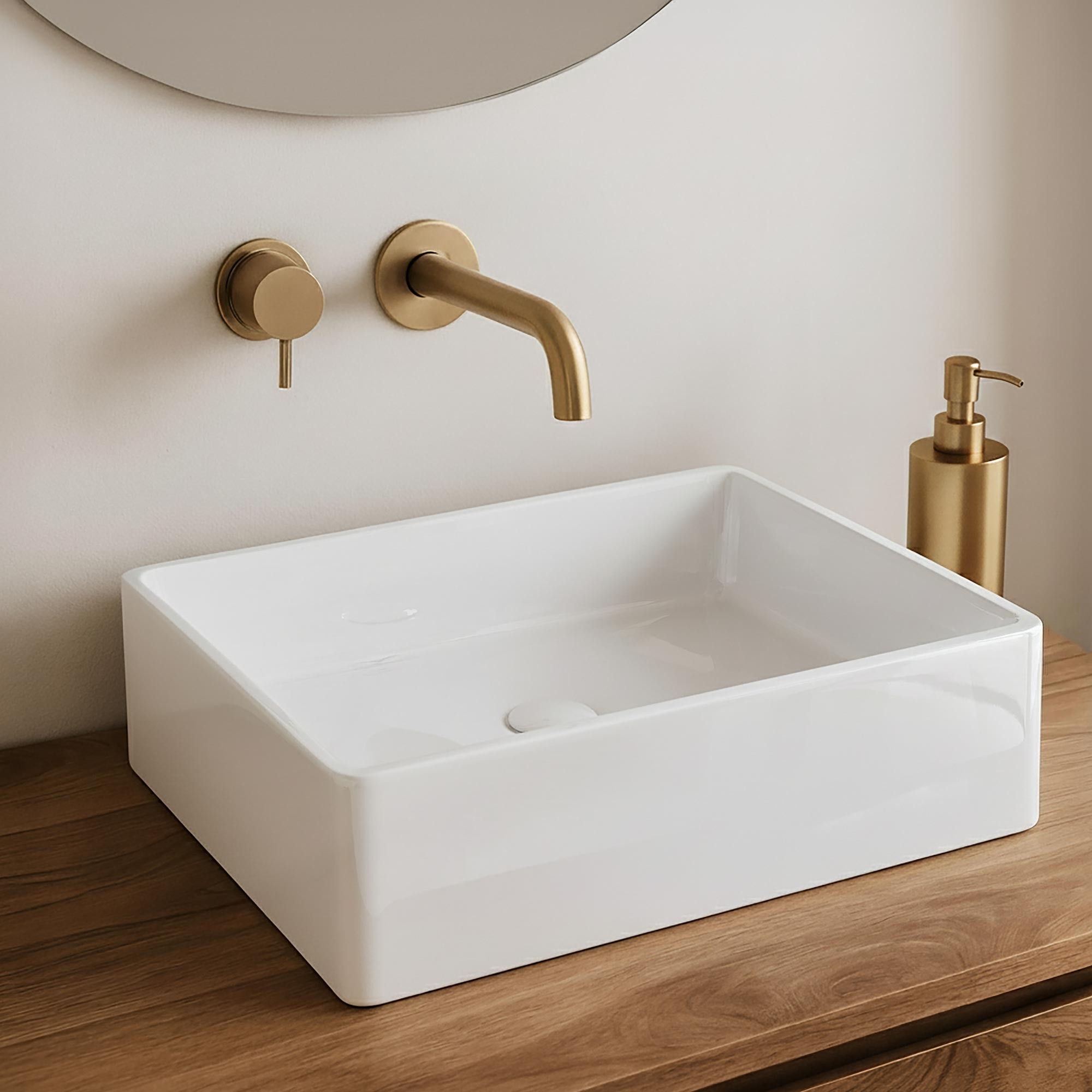 Met haar evenwichtige proporties – 47 cm lang, 37 cm breed en 14 cm hoog – integreert de Nova keramische opzetwastafel zich zowel op een compact onderkastmeubel als op een ruimer werkblad. De diepe waskom zorgt voor comfortabel gebruik en beperkt spatwater, terwijl het centrale kraangat met een diameter van 4,5 cm perfect aansluit bij de huidige standaarden. Elk detail werd ontworpen om de installatie te vereenvoudigen en een esthetische samenhang te garanderen met wand- of opbouwkranen.