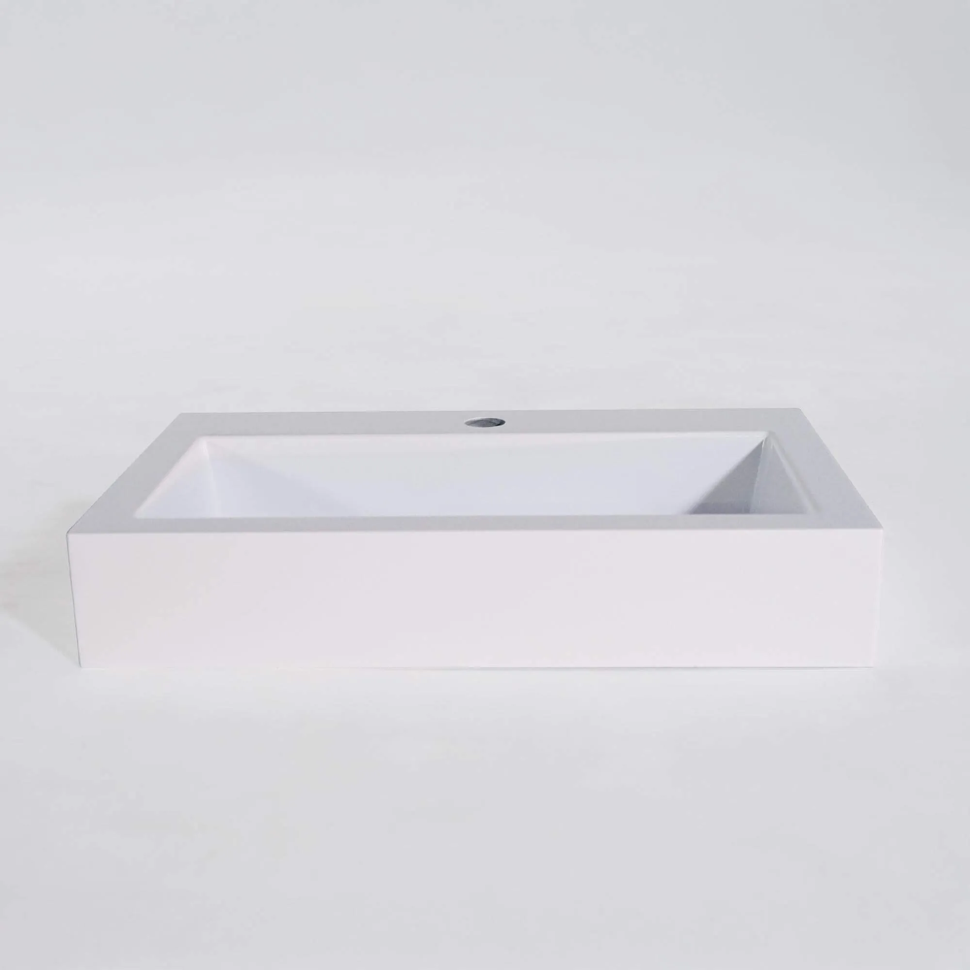 Het keramiek waaruit deze rechthoekige opbouwwastafel in glanzend wit is vervaardigd, werd gekozen om zijn duurzaamheid en lange levensduur en toont hier een bijzonder verzorgde afwerking. Het oppervlak voelt glad en bijna zijdezacht aan, terwijl de glanzende afwerking het onderhoud vergemakkelijkt en zijn uitstraling behoudt doorheen de tijd. Elke wastafel is het resultaat van een strikt productieproces, waarbij de controle van diktes en hoeken bijdraagt aan het duurzame kwaliteitsgevoel dat wij consequent nastreven.