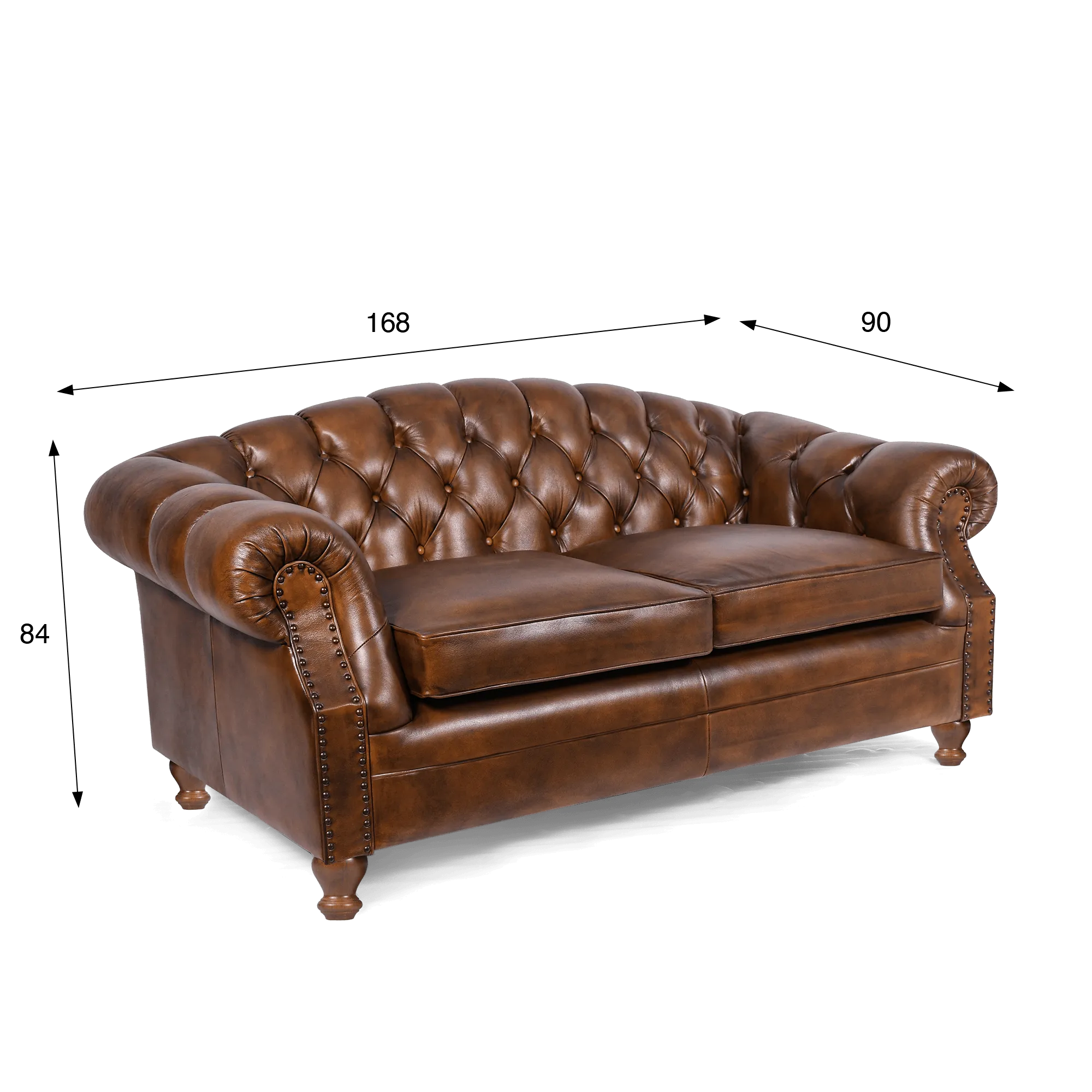 Met zijn twee comfortabele zitplaatsen biedt de Chesterfield zetel in echt bruin leer Harold een ruime zitting van ongeveer 160 cm breed, ondersteund door dikke en comfortabele kussens die uitnodigen om lang te blijven zitten. De zitdiepte van ongeveer 60 cm zorgt voor een mooi evenwicht tussen steun en ontspanning, zowel om gasten te ontvangen als om gewoon van een rustmoment te genieten. De stabiele structuur rust op poten in massief hout van mangohout, waarvan de warme tint natuurlijk harmonieert met die van het leer en zo de samenhang van het geheel versterkt. Ze zijn eenvoudig te bevestigen en maken een snelle plaatsing mogelijk.