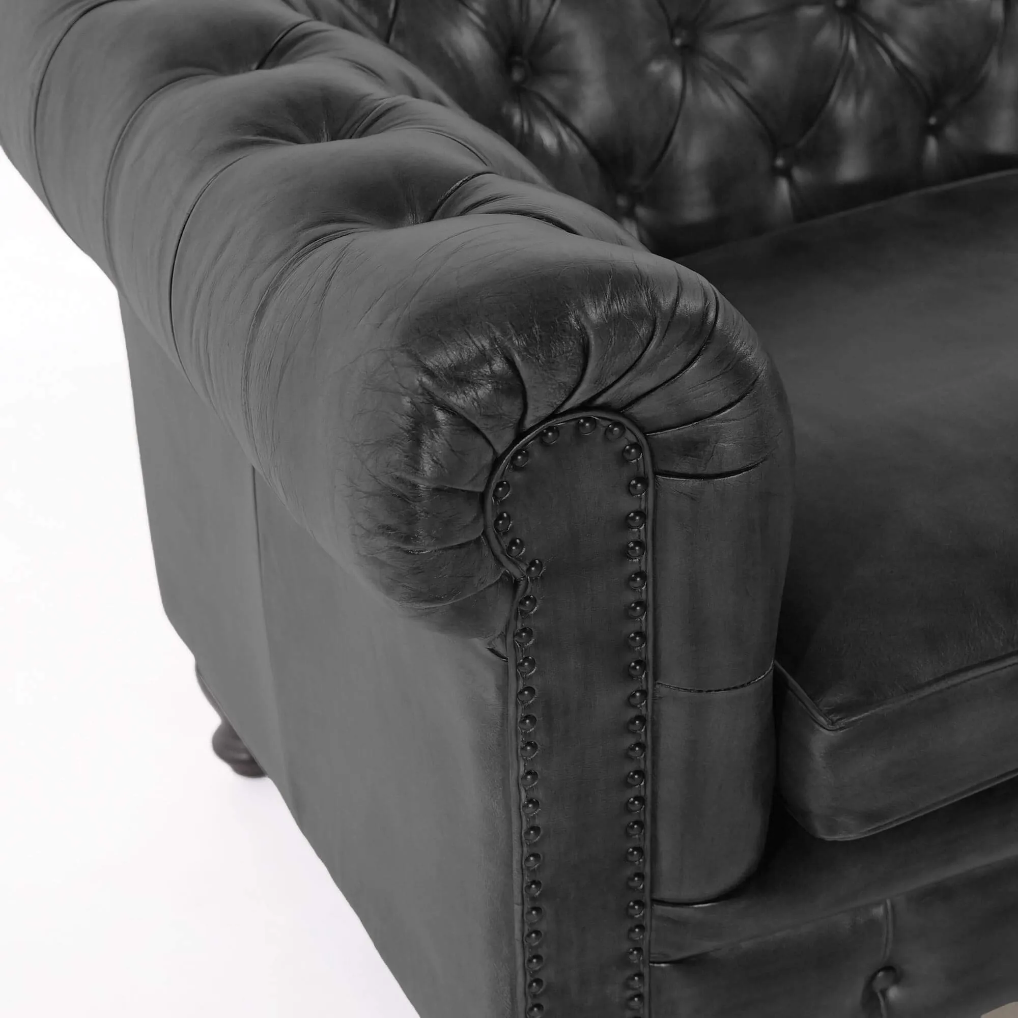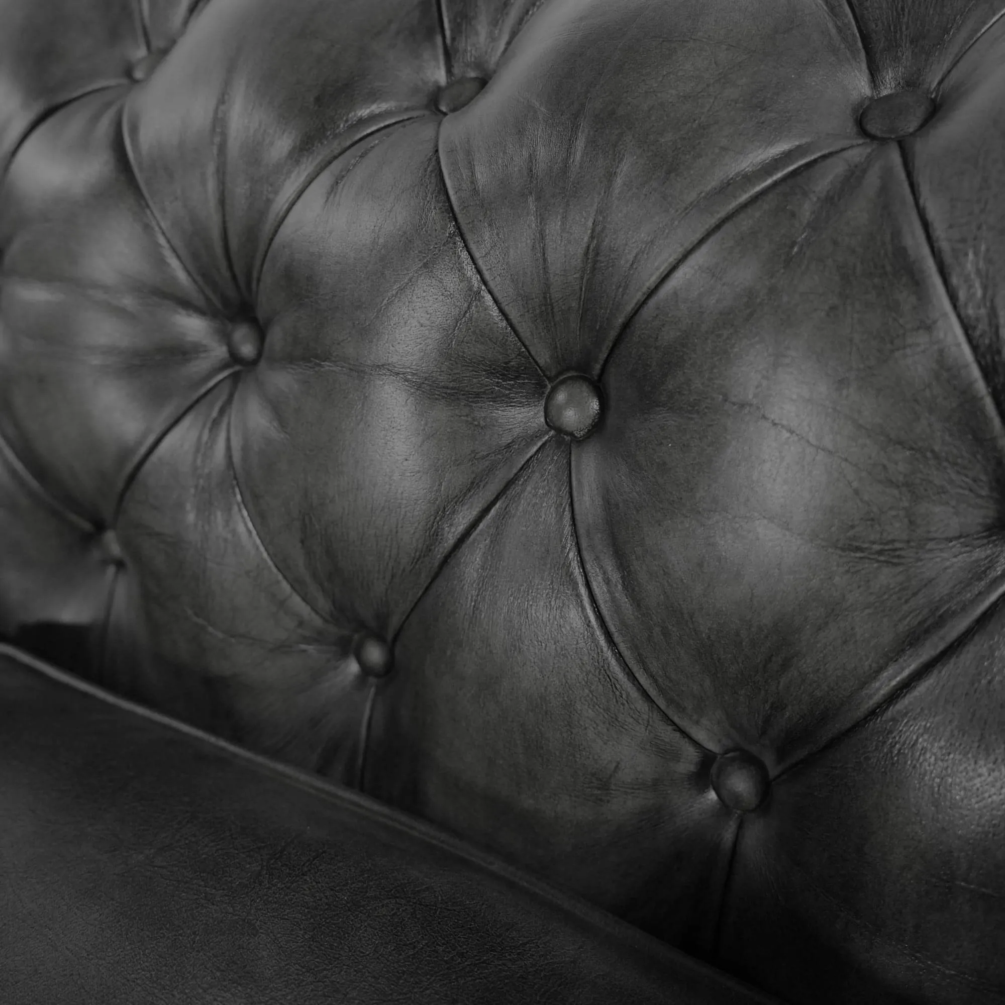 Met de zwarte leren Chesterfield 2-zitsbank Edward wilden we de essentie van klassieke Engelse interieurs terugvinden en tegelijk aanpassen aan meer hedendaagse leefruimtes, waar elk meubelstuk karakter en juiste verhoudingen moet combineren.