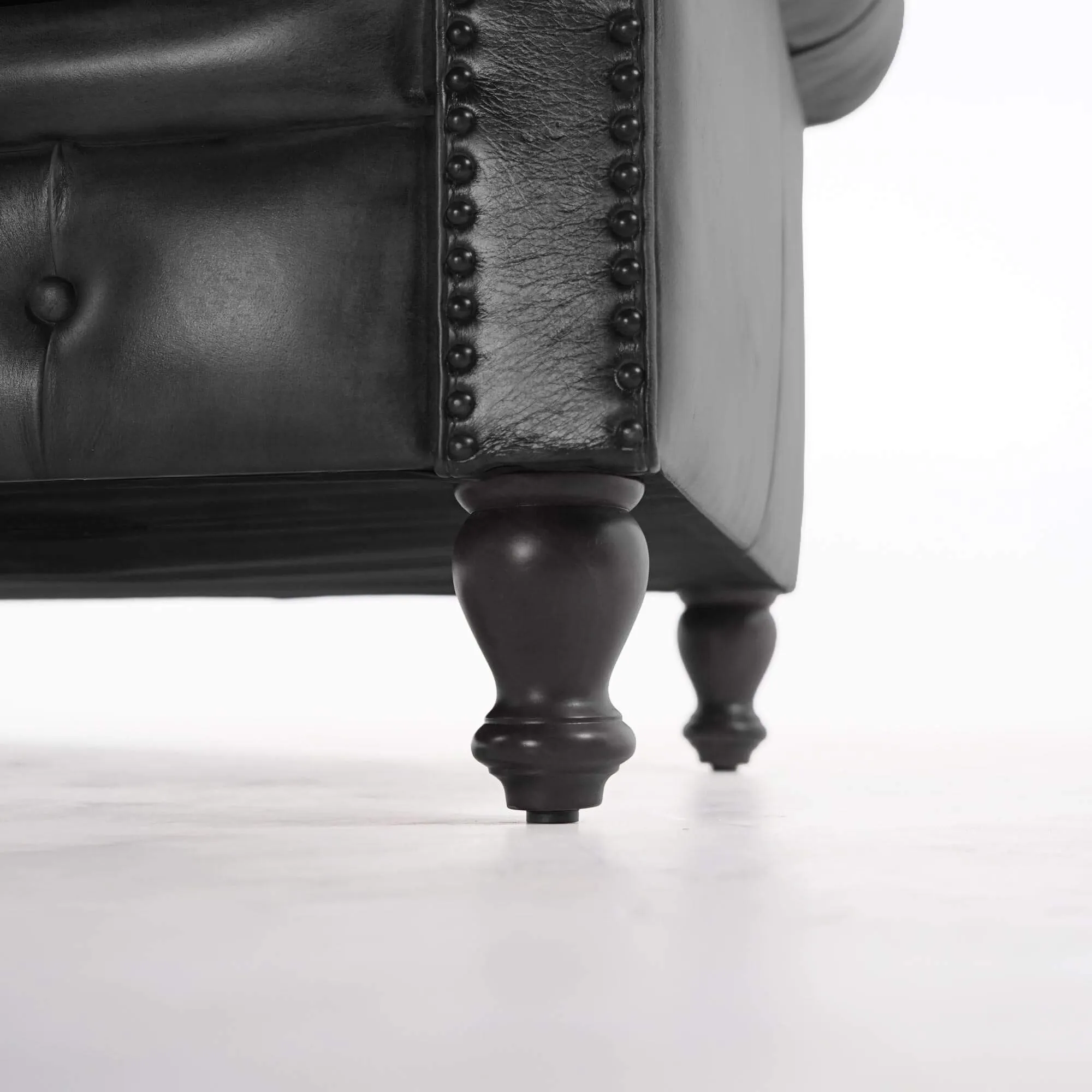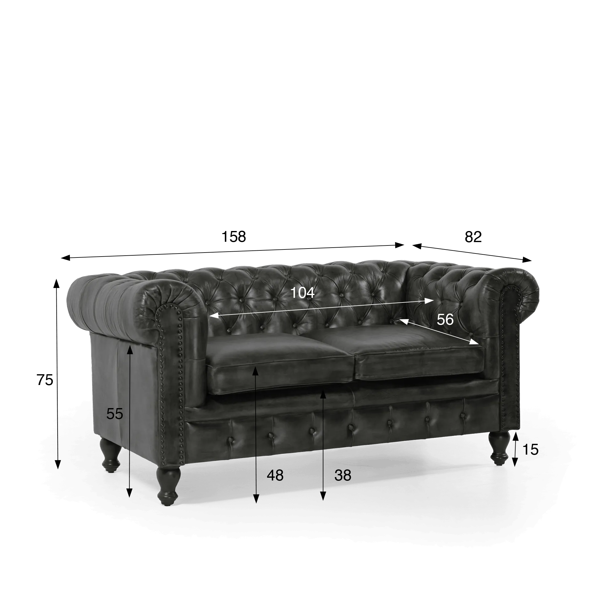 Dankzij zijn compacte formaat past hij gemakkelijk in een woonkamer, bureau of leeshoek, zonder ooit aan uitstraling te verliezen. De zitting van deze zwarte leren Chesterfield 2-zitsbank, met een breedte van 104 cm, biedt een comfortabele ruimte voor twee personen, terwijl de diepte van 56 cm ervoor zorgt dat je er vanzelf prettig in plaatsneemt, om te praten of gewoon even tot rust te komen. De zithoogte, ongeveer 55 cm, werd ontworpen voor een vlot dagelijks gebruik: niet te laag en niet te hoog.