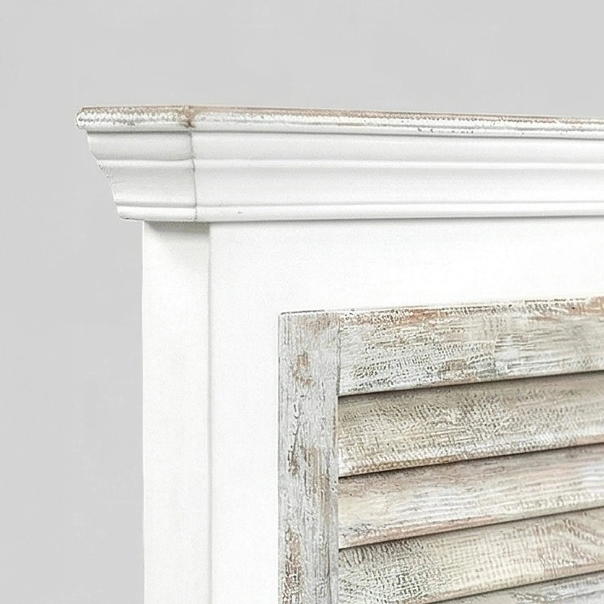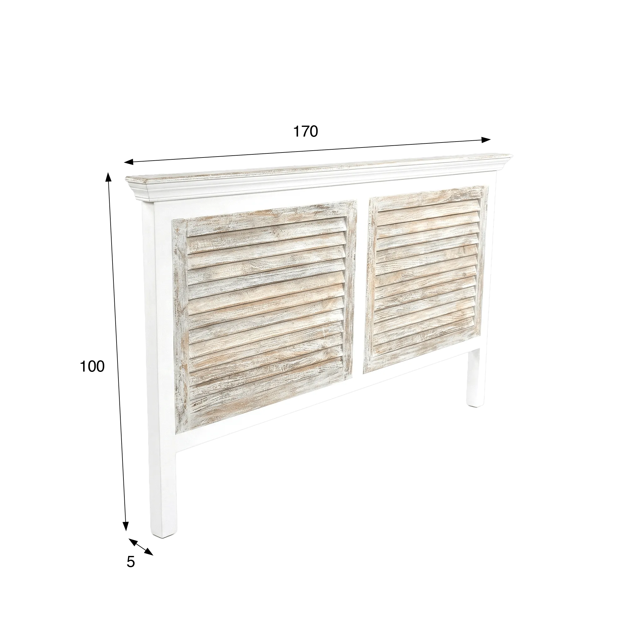 In de geest van woningen badend in het licht en open naar de horizon hebben wij het houten hoofdbord wit met luiken van 160 cm Sea Side ontworpen als een meubelstuk dat zachtheid en authenticiteit in de slaapkamer brengt. De breedte van 160 cm structureert de ruimte op evenwichtige wijze en laat tegelijk de omliggende decoratie ademen. Het subtiele contrast tussen de witte structuur en de panelen met luiken onthult een spel van texturen, geïnspireerd op luiken die door de tijd gepatineerd zijn, en roept zo op natuurlijke wijze de rustige sfeer op van meubels in kuststijl.