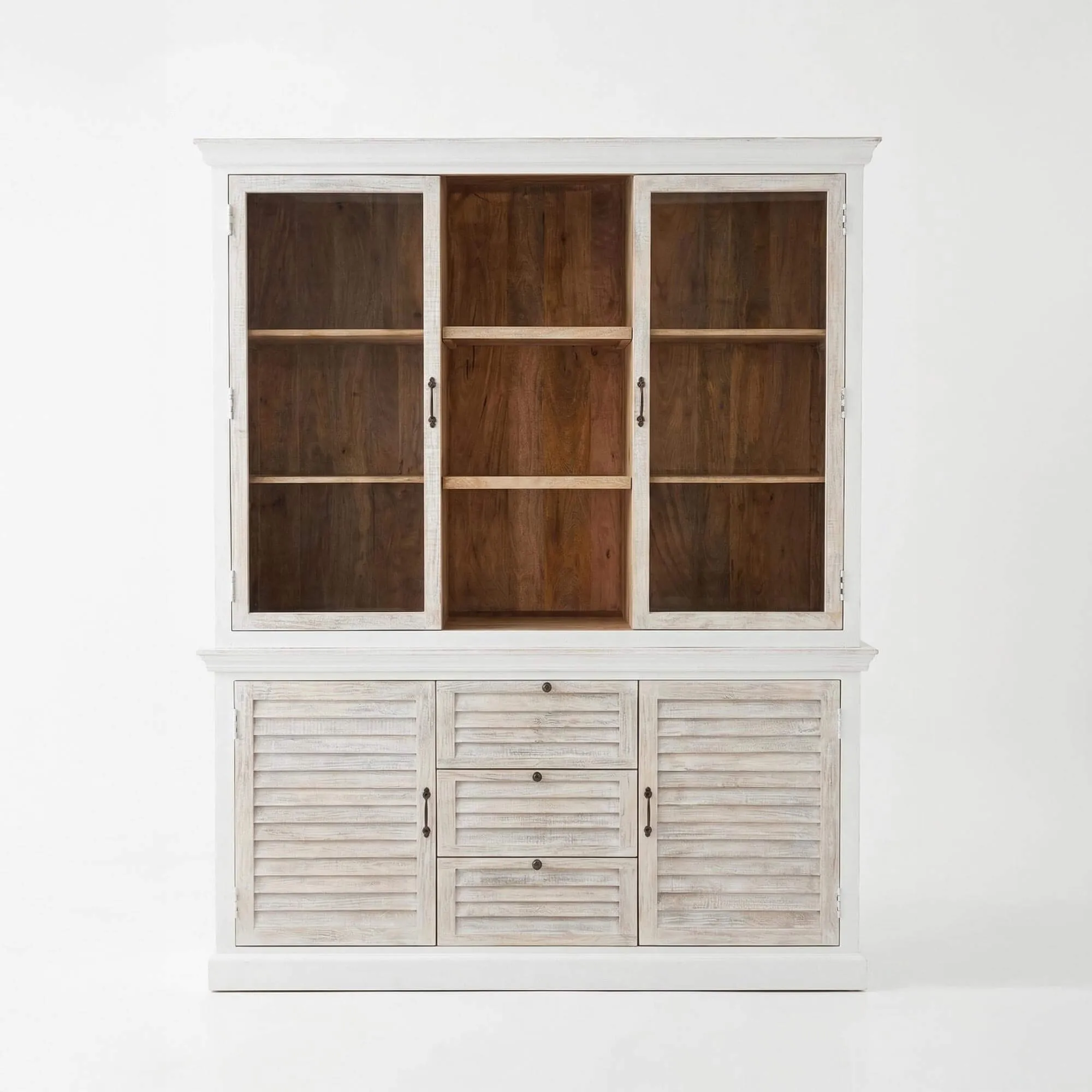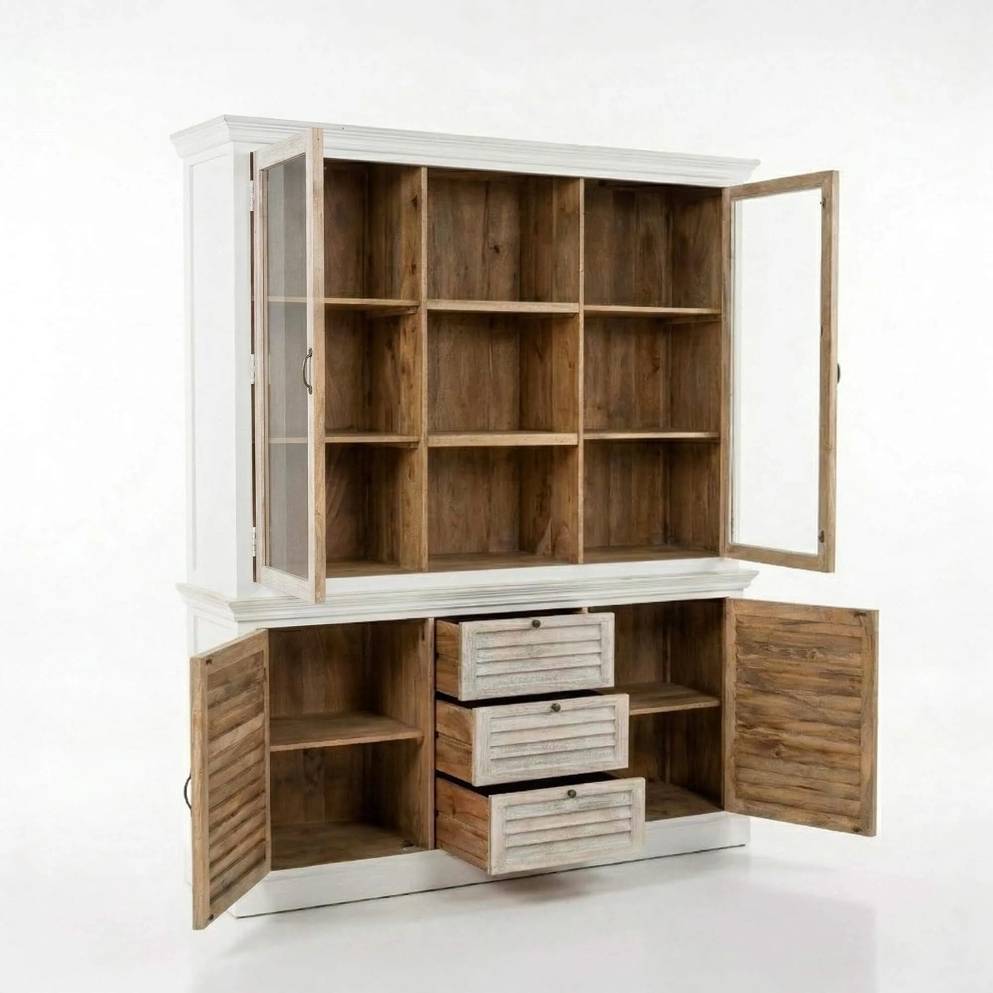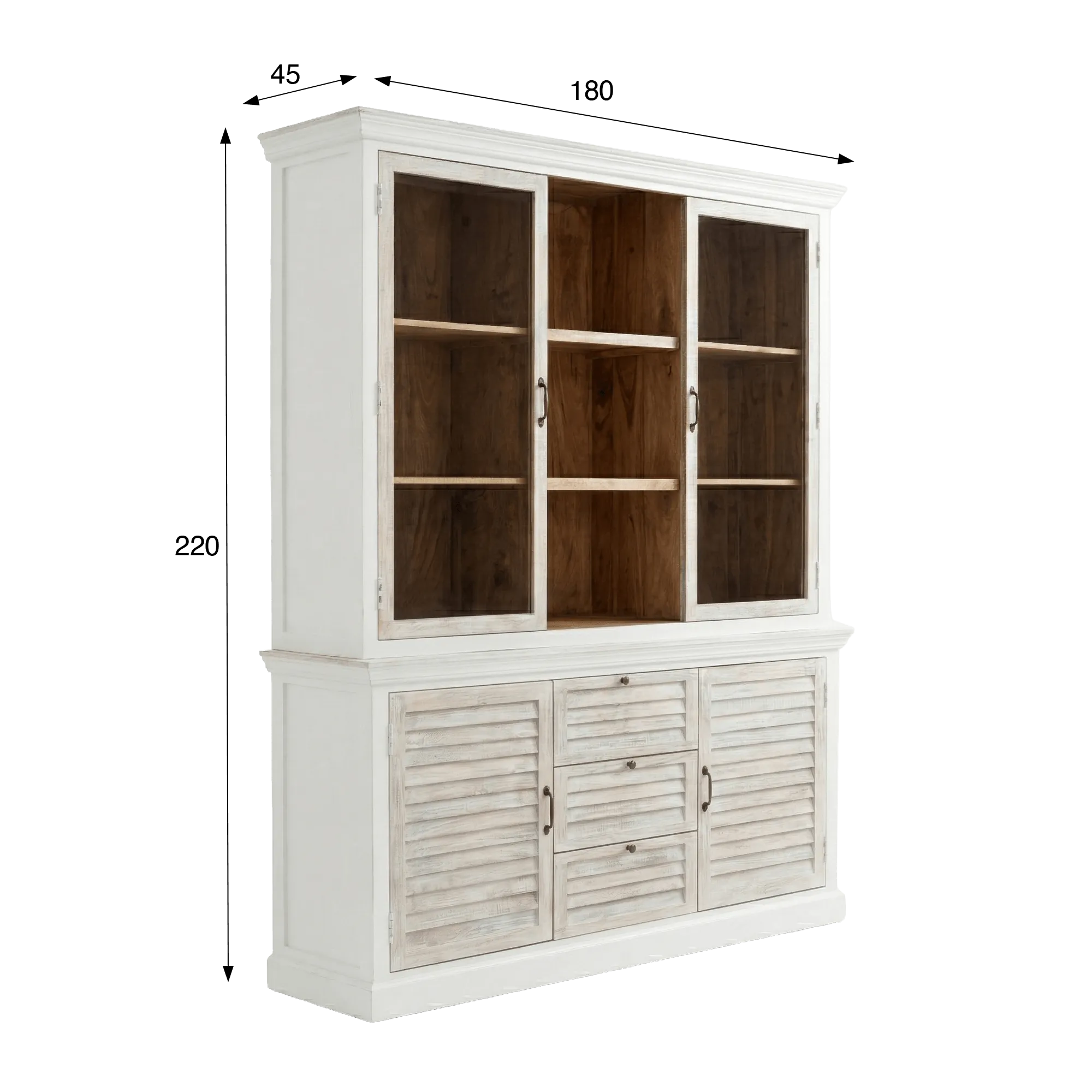 De structuur in mangohout van deze buffetkast in gebleekt hout onthult een fijn genuanceerde nerftekening, waarvan de levendige textuur het licht opvangt en een gevoel van diepte geeft. Wij kozen voor een licht gepatineerde afwerking om dat materiaaleffect extra te benadrukken, waardoor het meubel een serene uitstraling krijgt. Achter de glazen deuren van het bovenste gedeelte bieden de legplanken een ideale ruimte om servies, boeken of decoratieve voorwerpen te presenteren, terwijl het geheel visueel luchtig blijft. De royale verhoudingen van het meubel, met een breedte van ongeveer 180 cm en een hoogte van ongeveer 220 cm, maken het mogelijk om volumes harmonieus te organiseren zonder de ruimte te verzwaren.