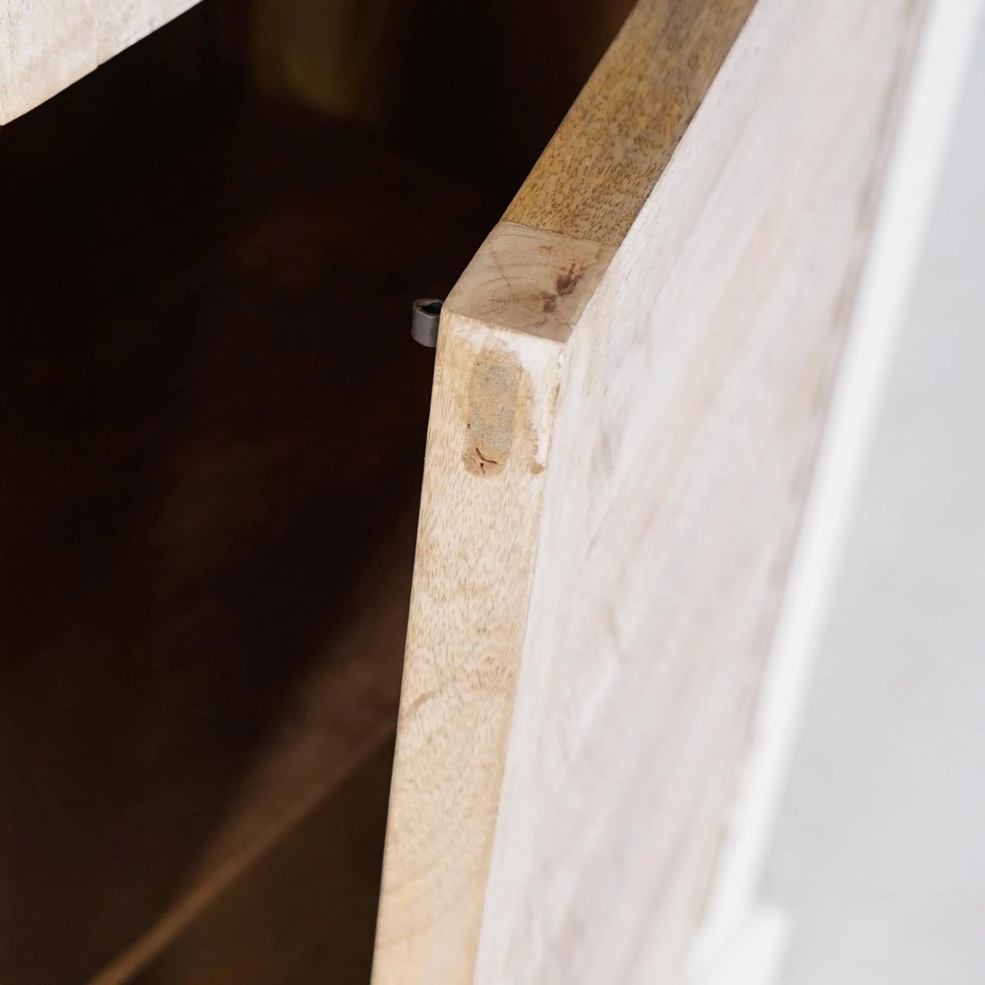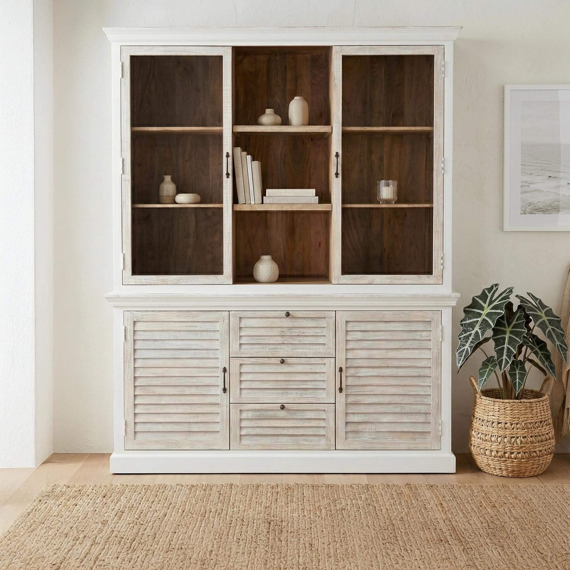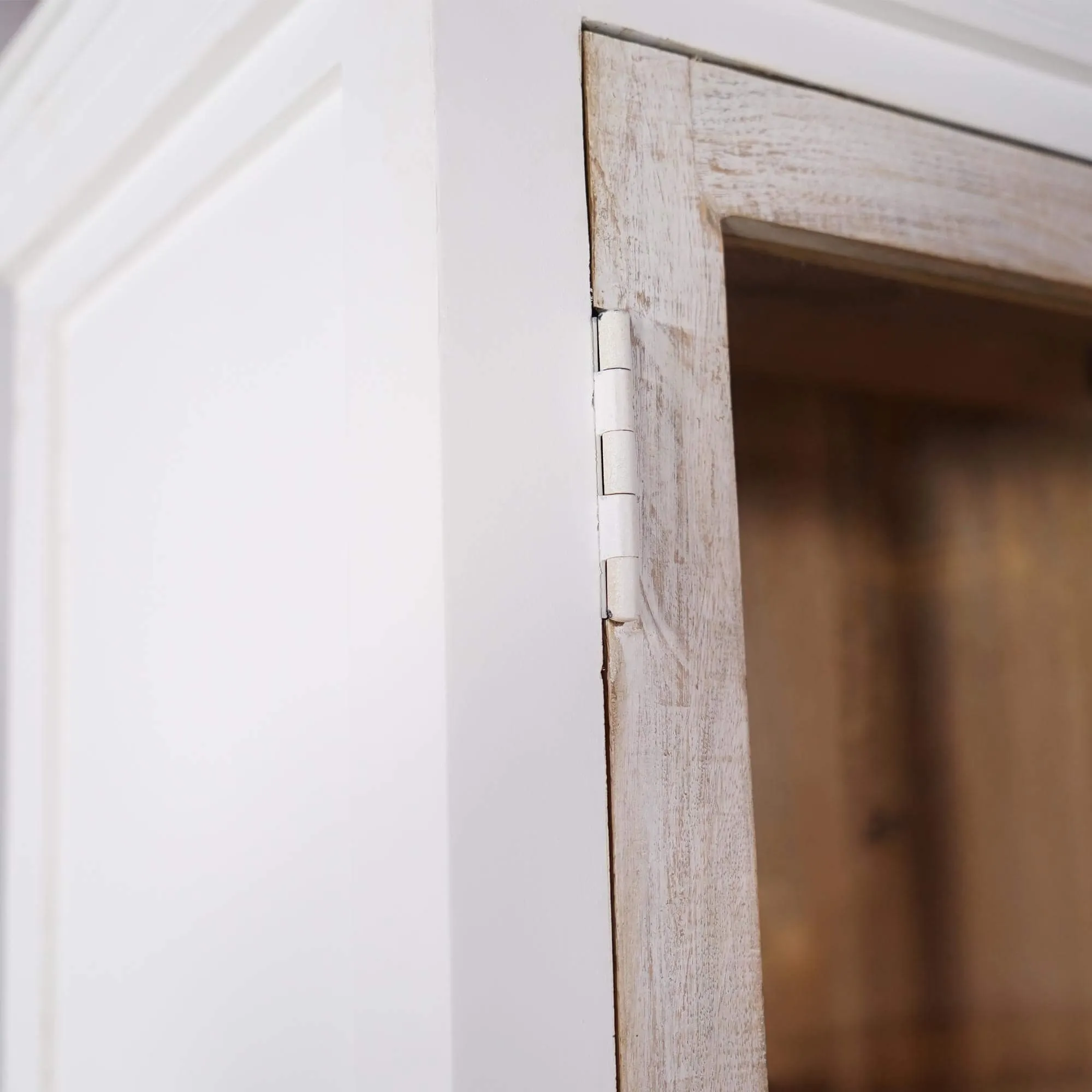 De structuur in mangohout van deze buffetkast in gebleekt hout onthult een fijn genuanceerde nerftekening, waarvan de levendige textuur het licht opvangt en een gevoel van diepte geeft. Wij kozen voor een licht gepatineerde afwerking om dat materiaaleffect extra te benadrukken, waardoor het meubel een serene uitstraling krijgt. Achter de glazen deuren van het bovenste gedeelte bieden de legplanken een ideale ruimte om servies, boeken of decoratieve voorwerpen te presenteren, terwijl het geheel visueel luchtig blijft. De royale verhoudingen van het meubel, met een breedte van ongeveer 180 cm en een hoogte van ongeveer 220 cm, maken het mogelijk om volumes harmonieus te organiseren zonder de ruimte te verzwaren.