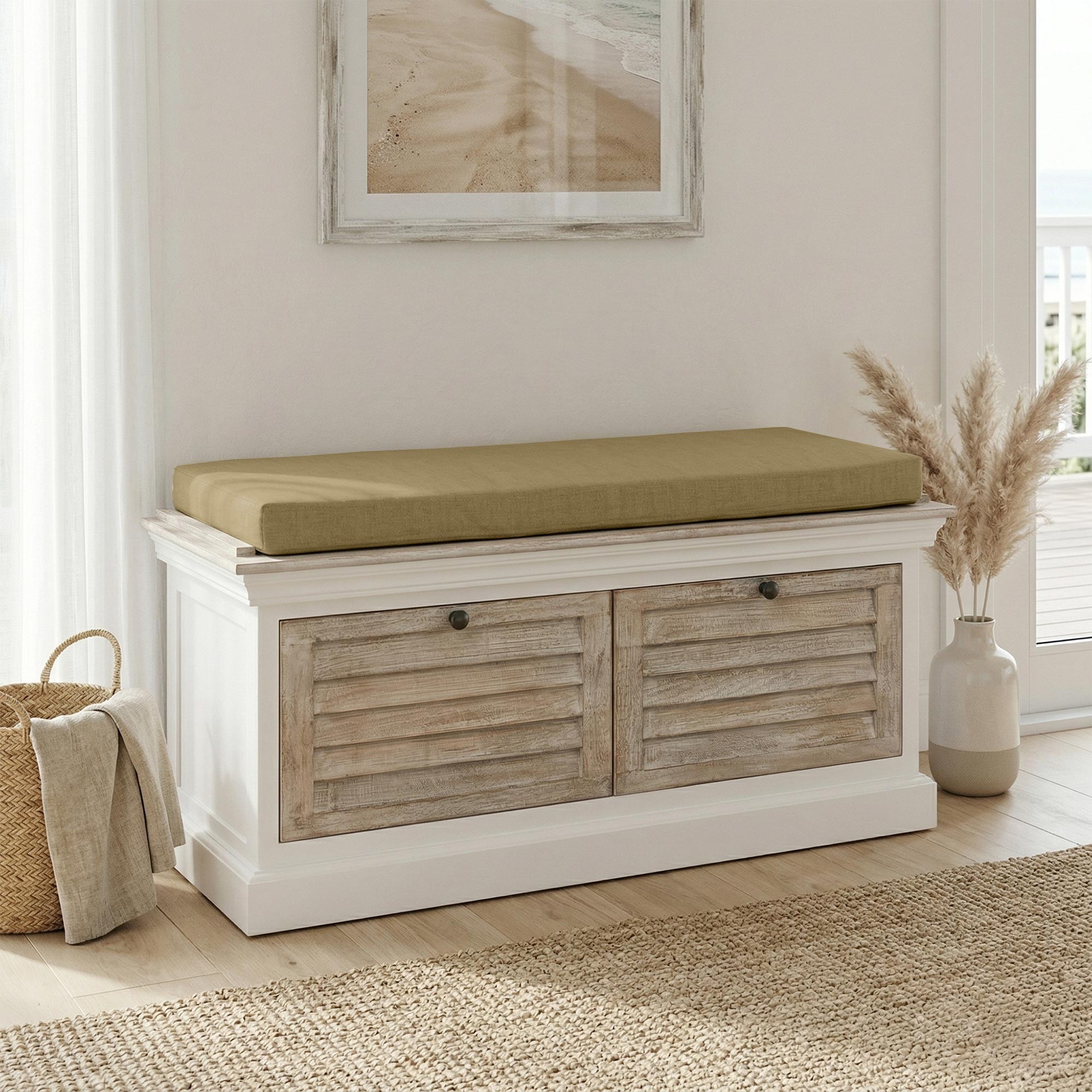 Het werk van de fronten met latten van deze halbank met opbergruimte in gebleekt hout geeft het geheel ritme en behoudt tegelijk een grote visuele lichtheid. Elk detail werd bedacht om een meubel op te roepen dat tegelijk warm en functioneel is, en dat stijlen kan doorstaan zonder aan karakter te verliezen. We hechten bijzonder veel belang aan dit spel van texturen, dat het meubel een zachte en evenwichtige uitstraling geeft, trouw aan de geest van de Sea side-collectie.