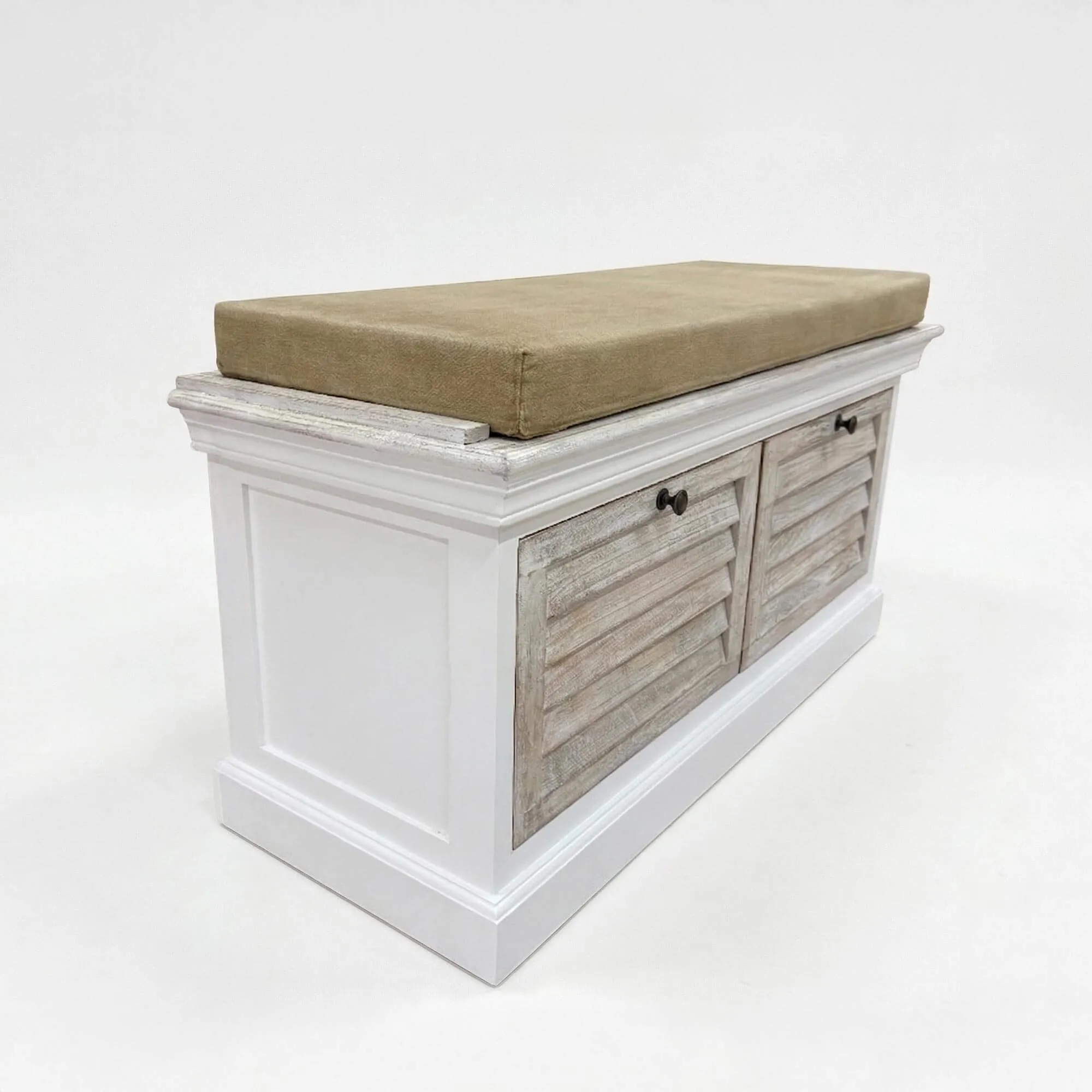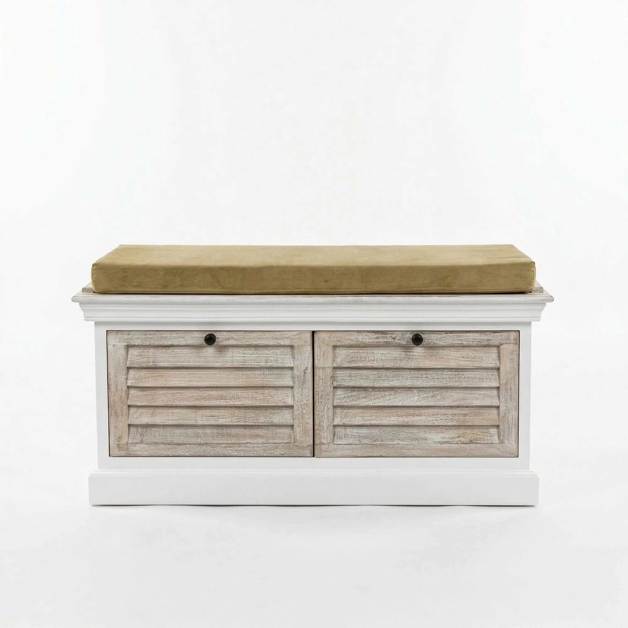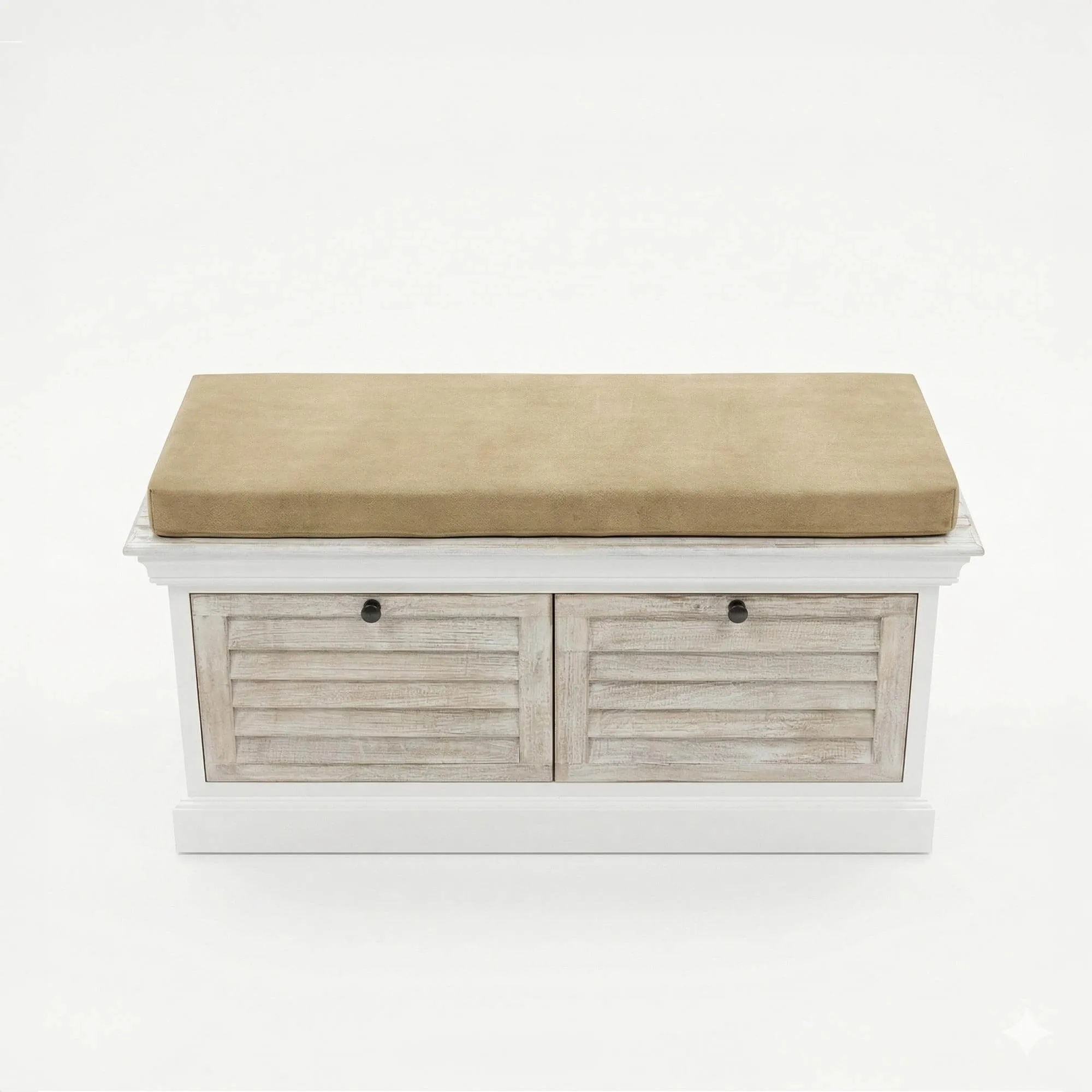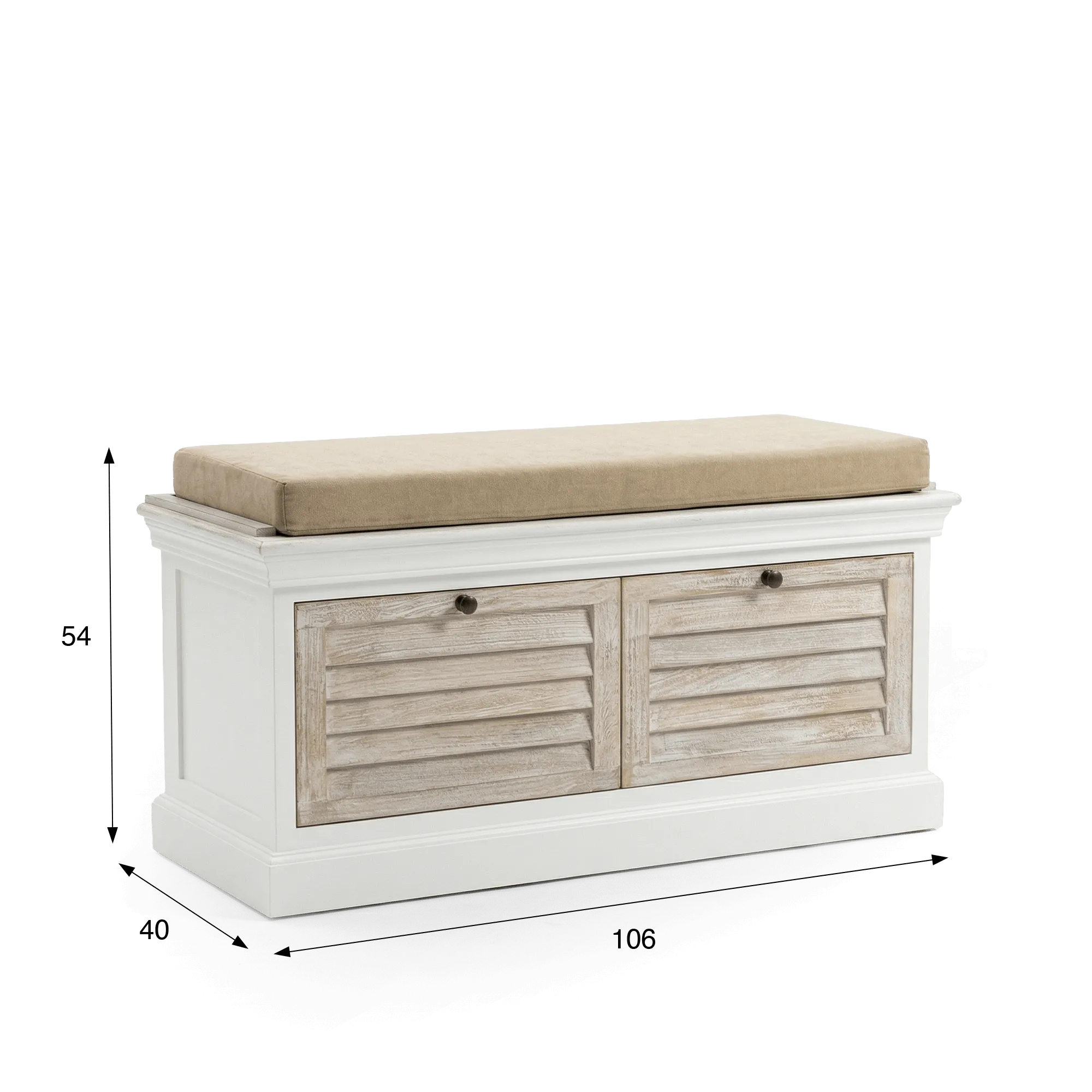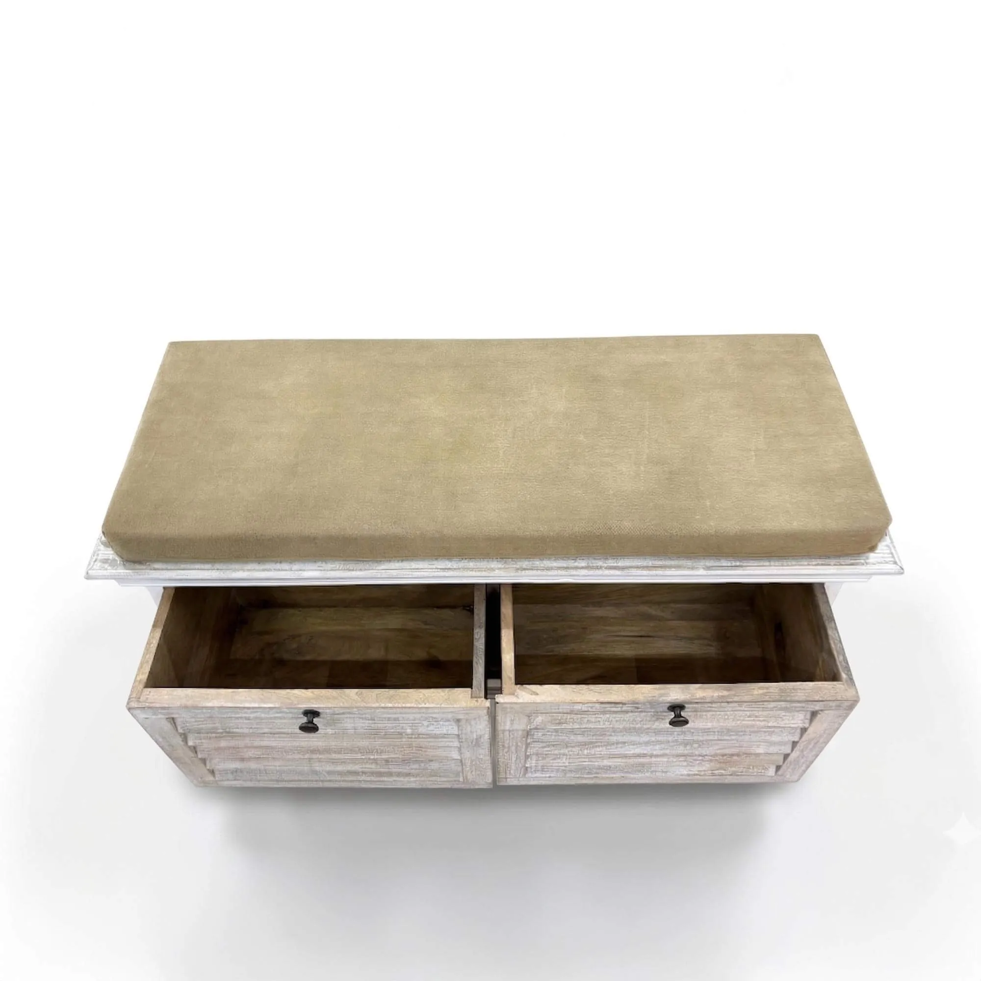 Deze halbank met opbergruimte in gebleekt hout werd ontworpen om de organisatie van de inkom te vereenvoudigen en combineert een comfortabele zit met twee ruime laden waarin schoenen, accessoires of huishoudlinnen kunnen worden opgeborgen. Het kussen, in natuurlijke tinten, nodigt uit om rustig plaats te nemen om schoenen aan te trekken en voegt tegelijk een textiele toets toe die de houten structuur verzacht. Met zijn harmonieuze proporties van 106 cm lengte vindt hij gemakkelijk zijn plaats in een inkomhal, een slaapkamer of een lichte leefruimte.