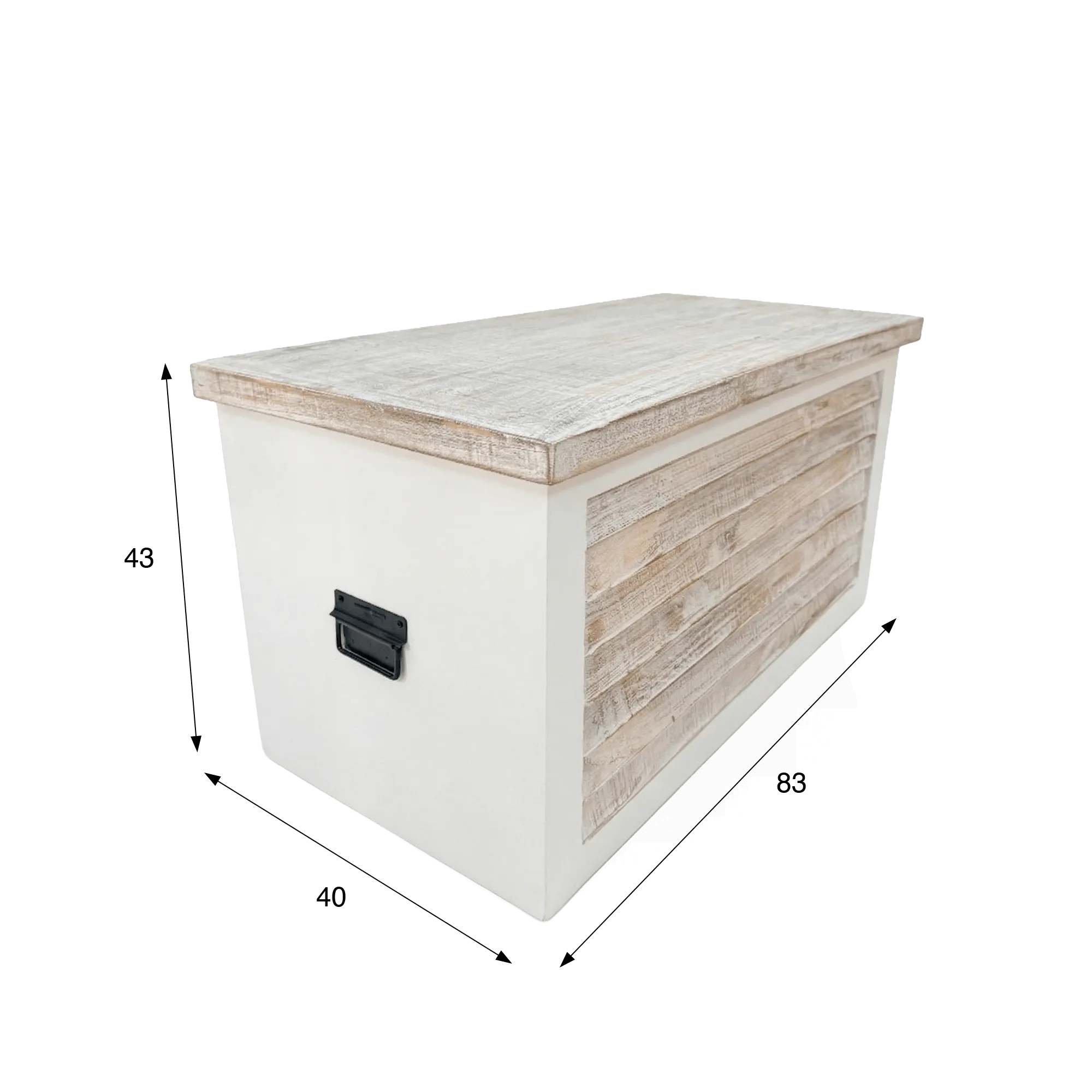 Onze ontwerpers hebben bijzondere aandacht besteed aan de materiaalbewerking van deze opbergkist in wit hout. Mangohout, gekozen om zijn stevigheid en levendige karakter, biedt een warme textuur die mee evolueert met het licht. De voorkant, afgewerkt met horizontale latten, geeft reliëf aan het geheel en onderstreept de ambachtelijke inspiratie van de collectie. Dit detail geeft het meubel een authentieke uitstraling, trouw aan de kustsfeer die de Sea side-collectie kenmerkt.