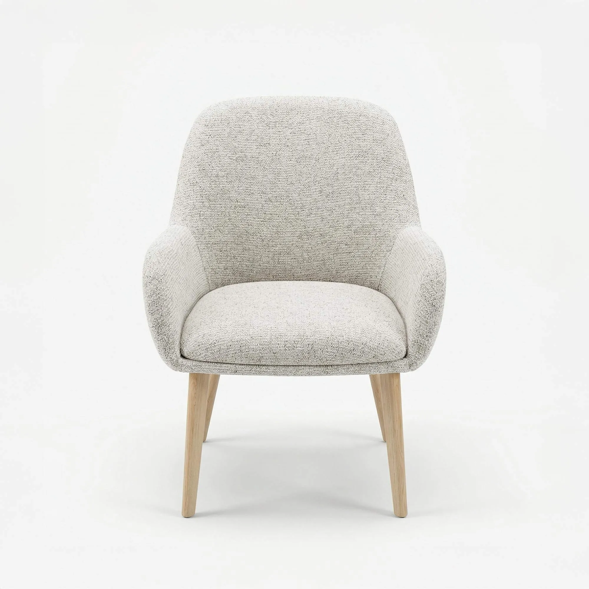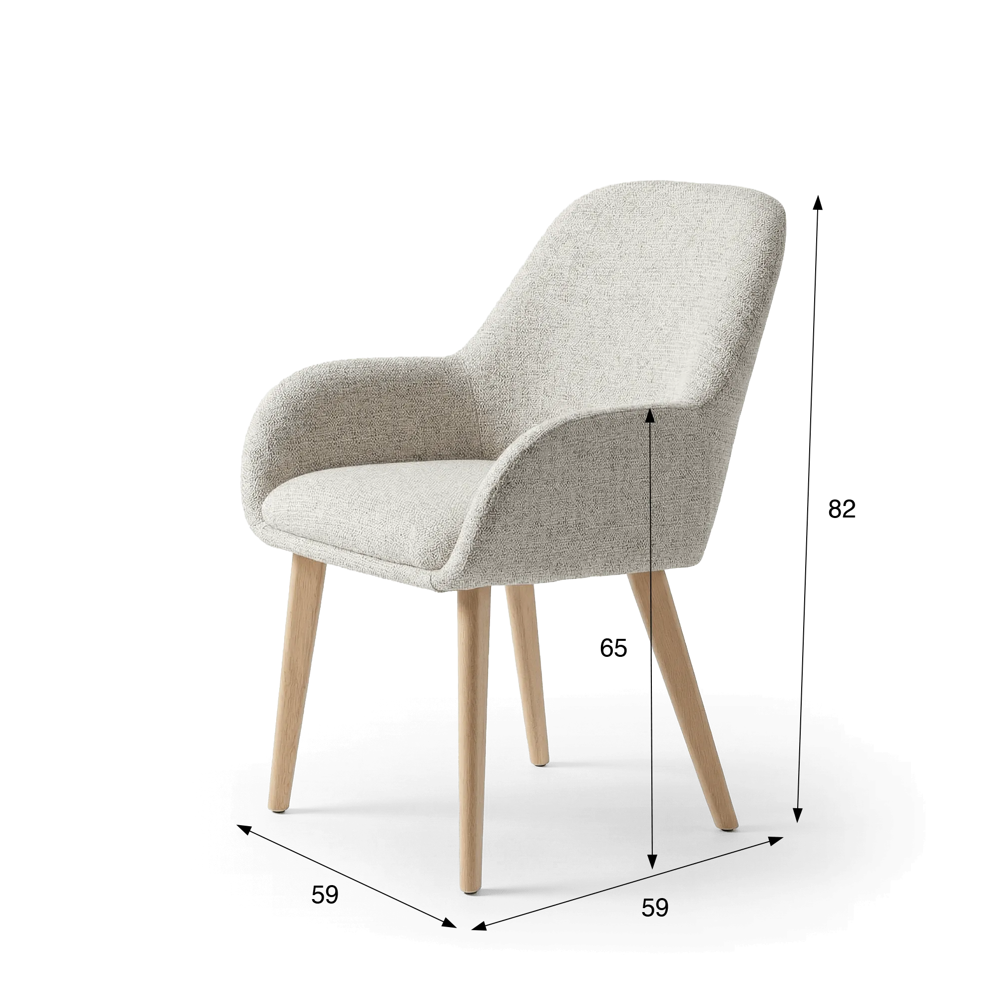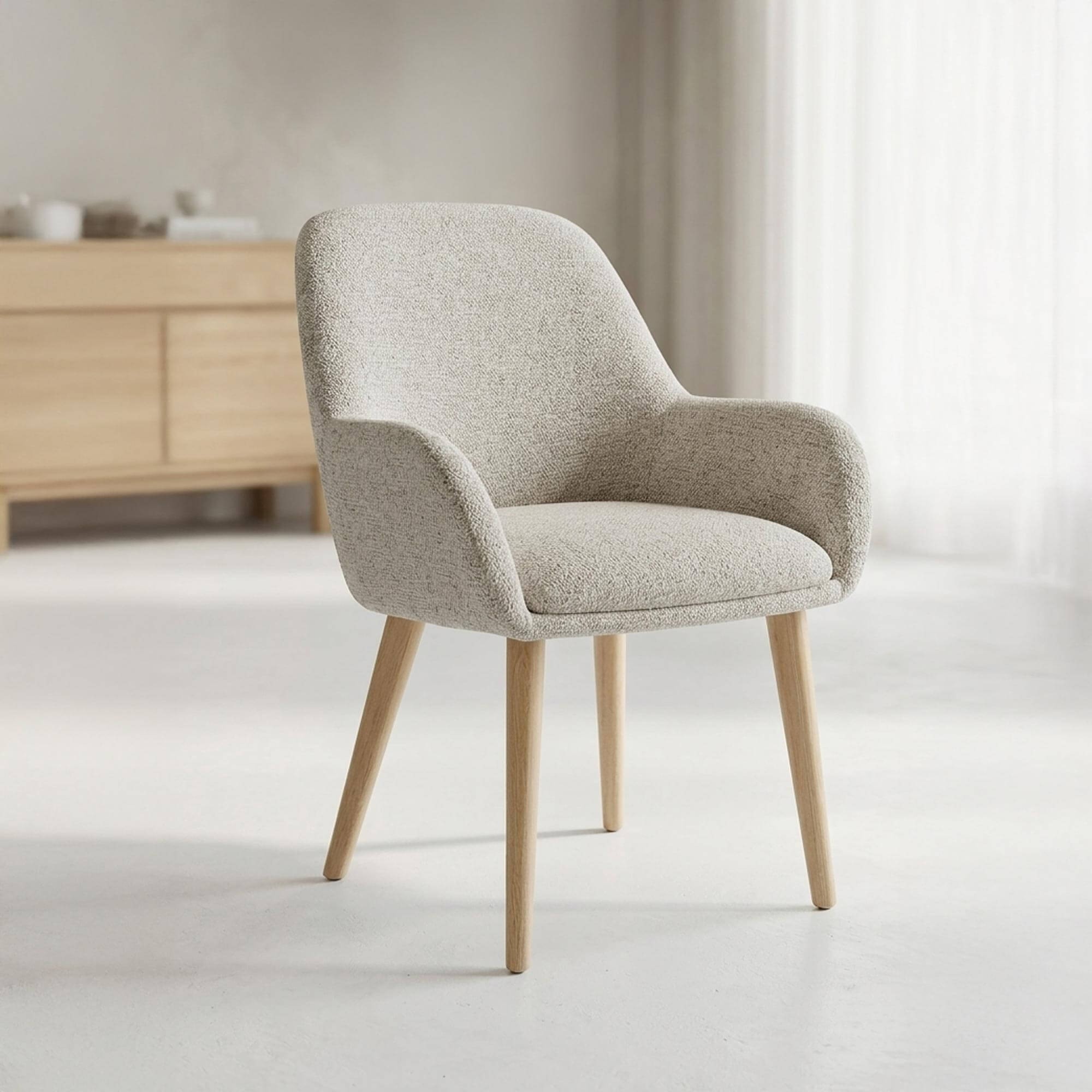 De stof die voor de Scandinavische eetkamerstoel Alva in stof werd gekozen, heeft een fijn gestructureerde touch die het licht subtiel opvangt en zo reliëf en diepte geeft aan de natuurlijke tint. Dit materiaal is tegelijk slijtvast en aangenaam in contact, waardoor het gevoel van comfort wordt versterkt terwijl de uitstraling sober en tijdloos blijft. We kozen ervoor deze bekleding te combineren met poten in beukenhout, waarvan de lichte tint de noordelijke inspiratie van het model onderstreept. Het contrast tussen de textuur van de stof en de warmte van het massieve hout creëert een harmonieus evenwicht, trouw aan de geest van de Alva-collectie.