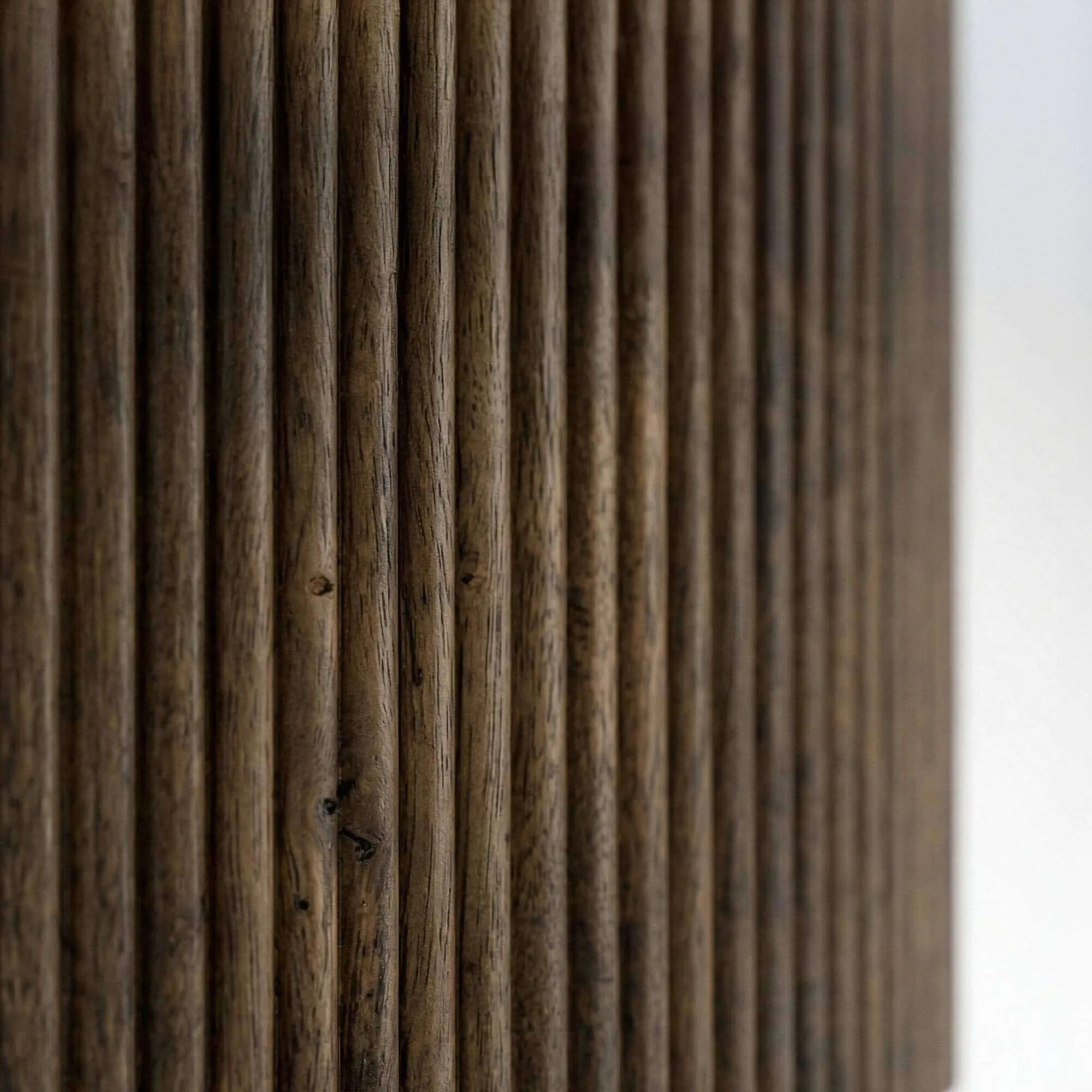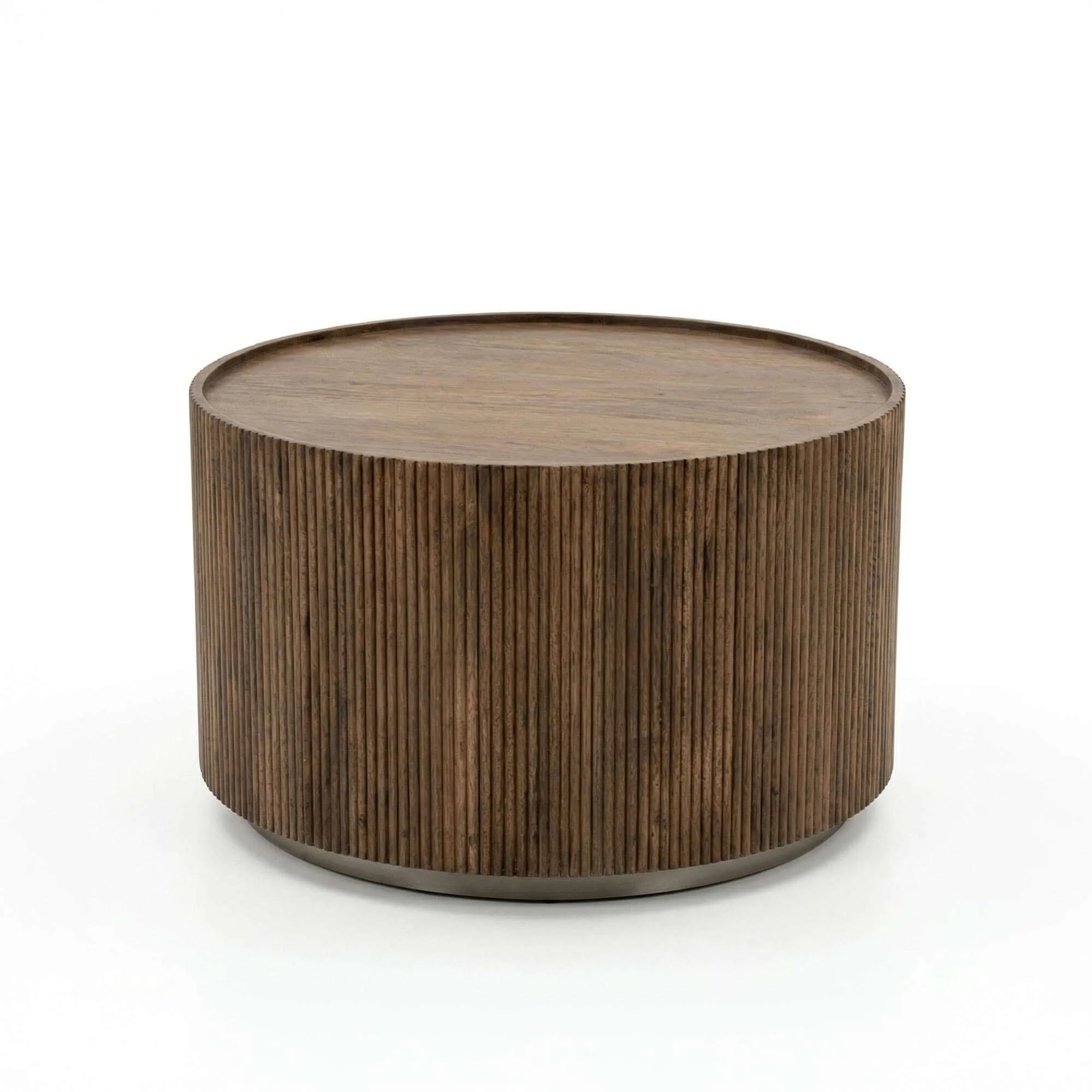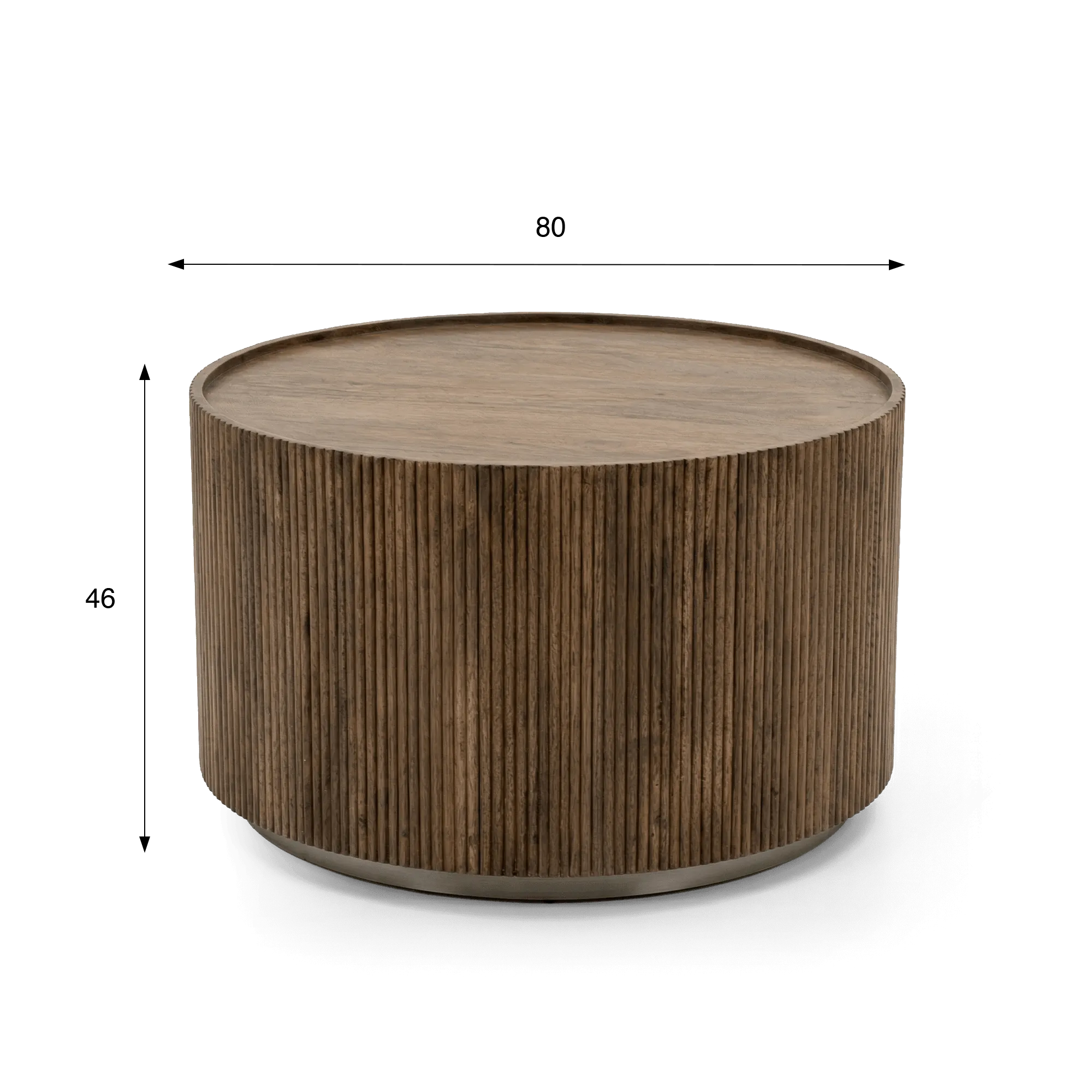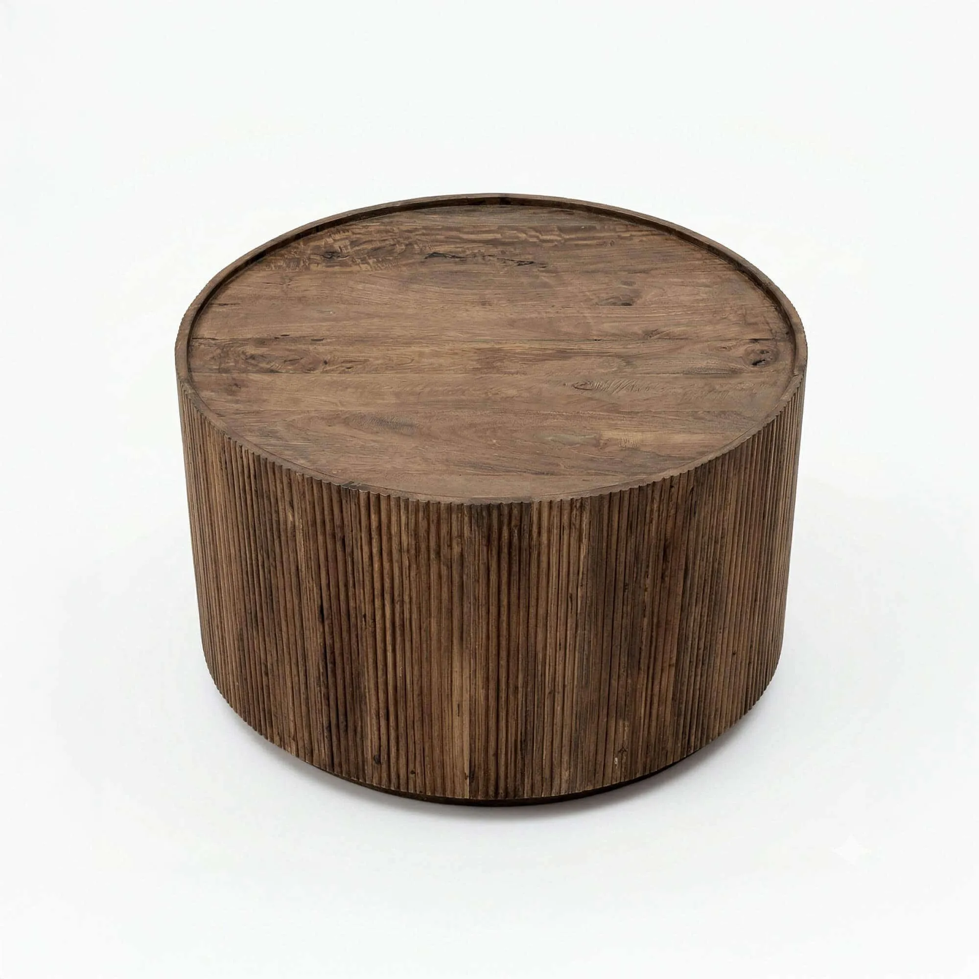 De keuze voor massief mangohout drong zich op omwille van zijn authenticiteit en de rijkdom van zijn nerftekening. Elke nuance in deze ronde salontafel in massief hout onthult een levendig materiaal, nauwkeurig bewerkt om de volle diepte van zijn natuurlijke uitstraling te bewaren. Onze designers kozen voor een gecanneleerde voorzijde, ritmisch opgebouwd uit fijne verticale lijnen die het geheel reliëf geven. Dit verfijnde detail accentueert de textuur van het hout en vangt subtiel het licht, waardoor het meubel een uitgesproken aanwezigheid krijgt zonder de ruimte te verzwaren.